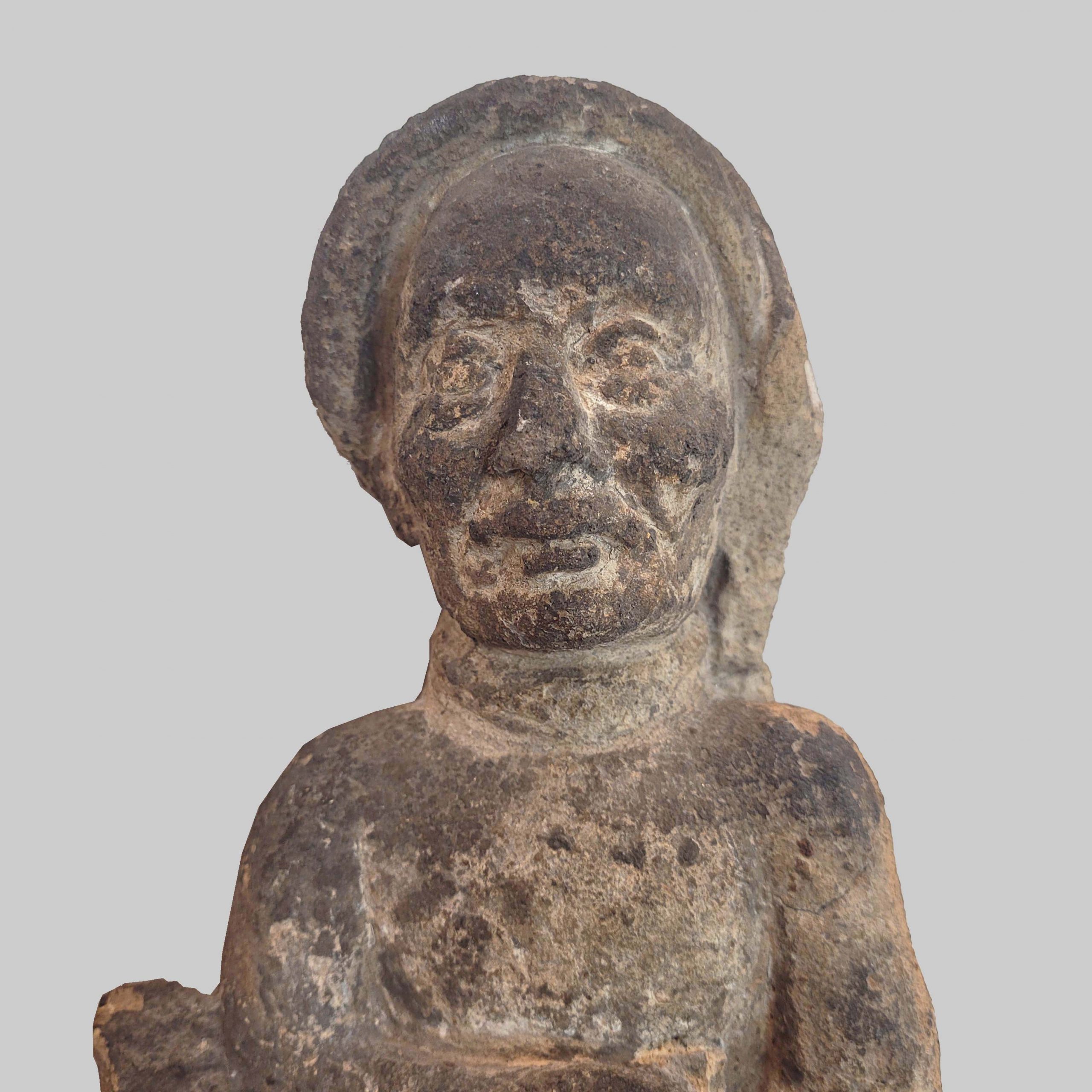 Büste eines Baumeisters(?)Weiberner Tuffstein, vollrund gearbeitet, Architekturbestandteil mit Maßwerk, Rheinland oder Niederlande 15. Jahrhundert, Höhe 32 cm