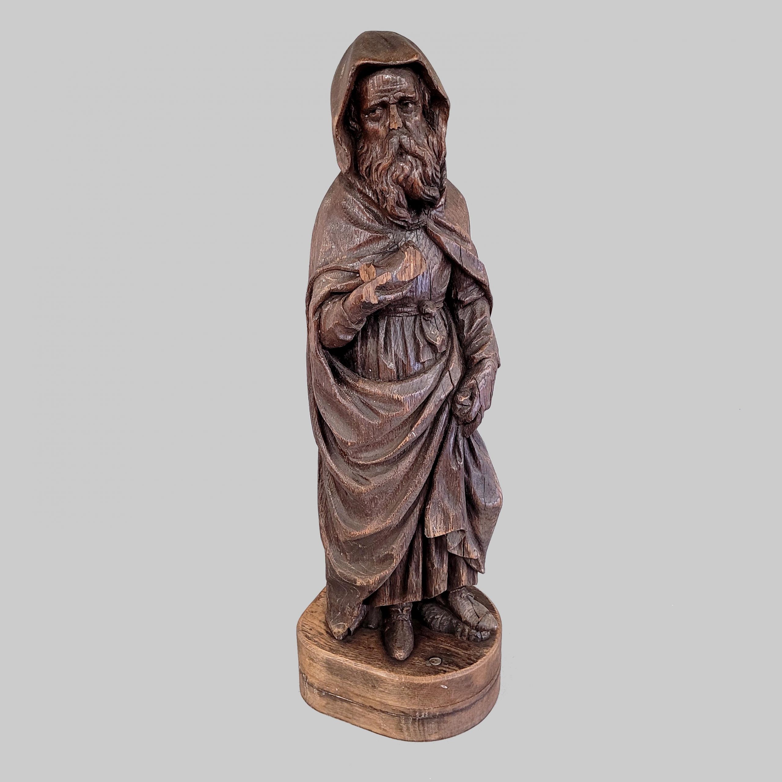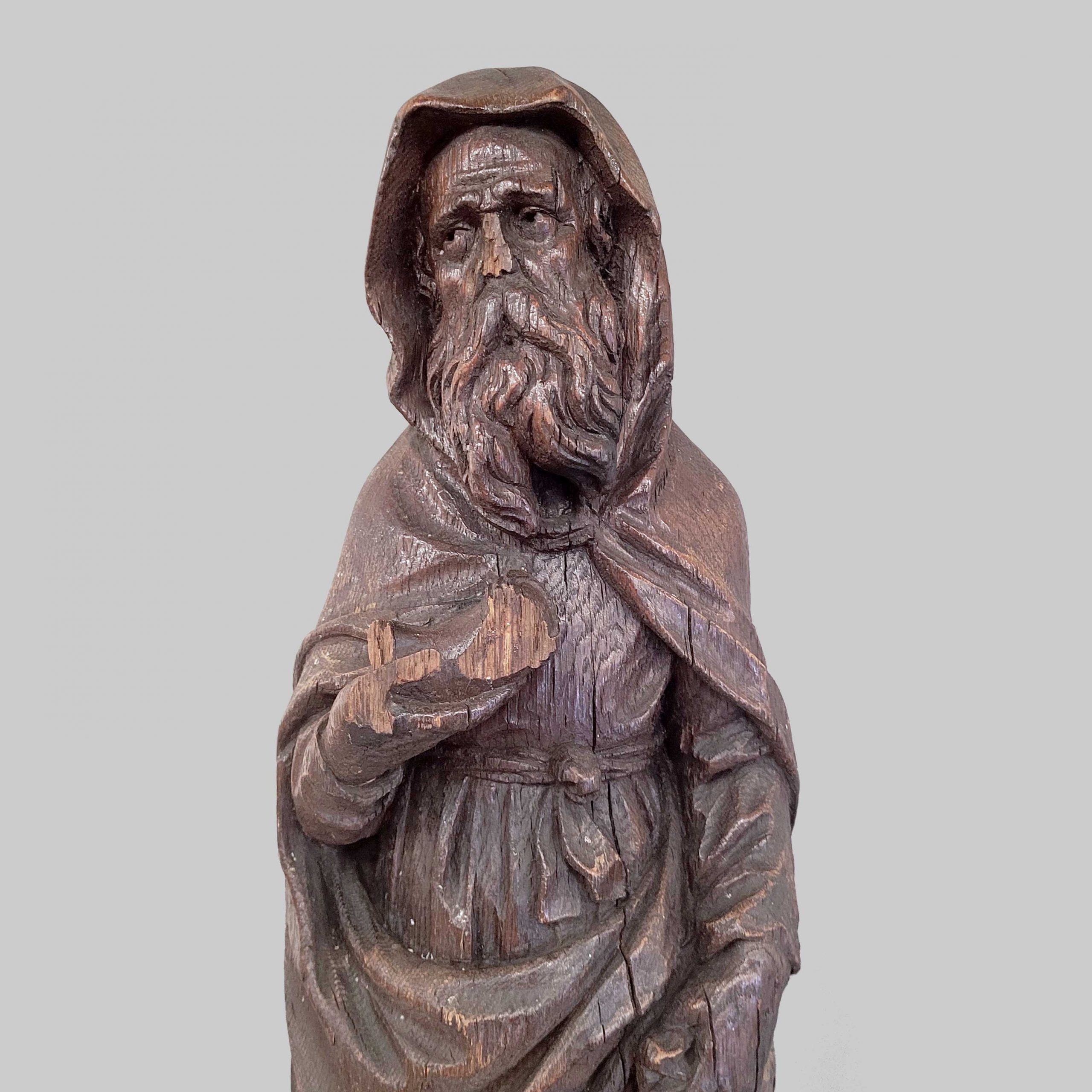 ApostelfigurEiche, vollrund geschnitzt, braun patiniert, Niederrhein oder Flandern, wohl 17. Jahrhundert, Höhe 60 cm (ohne den neueren Sockel)