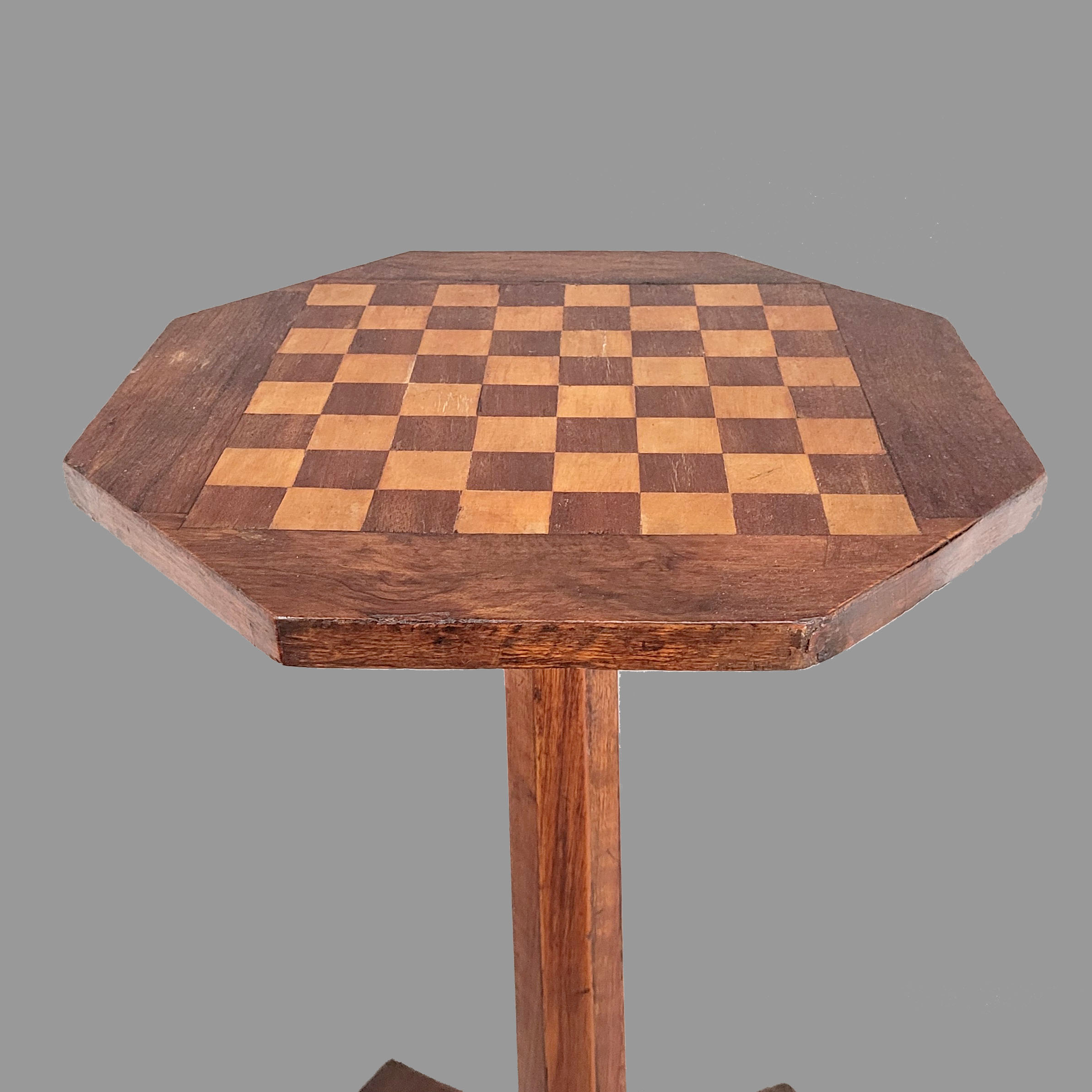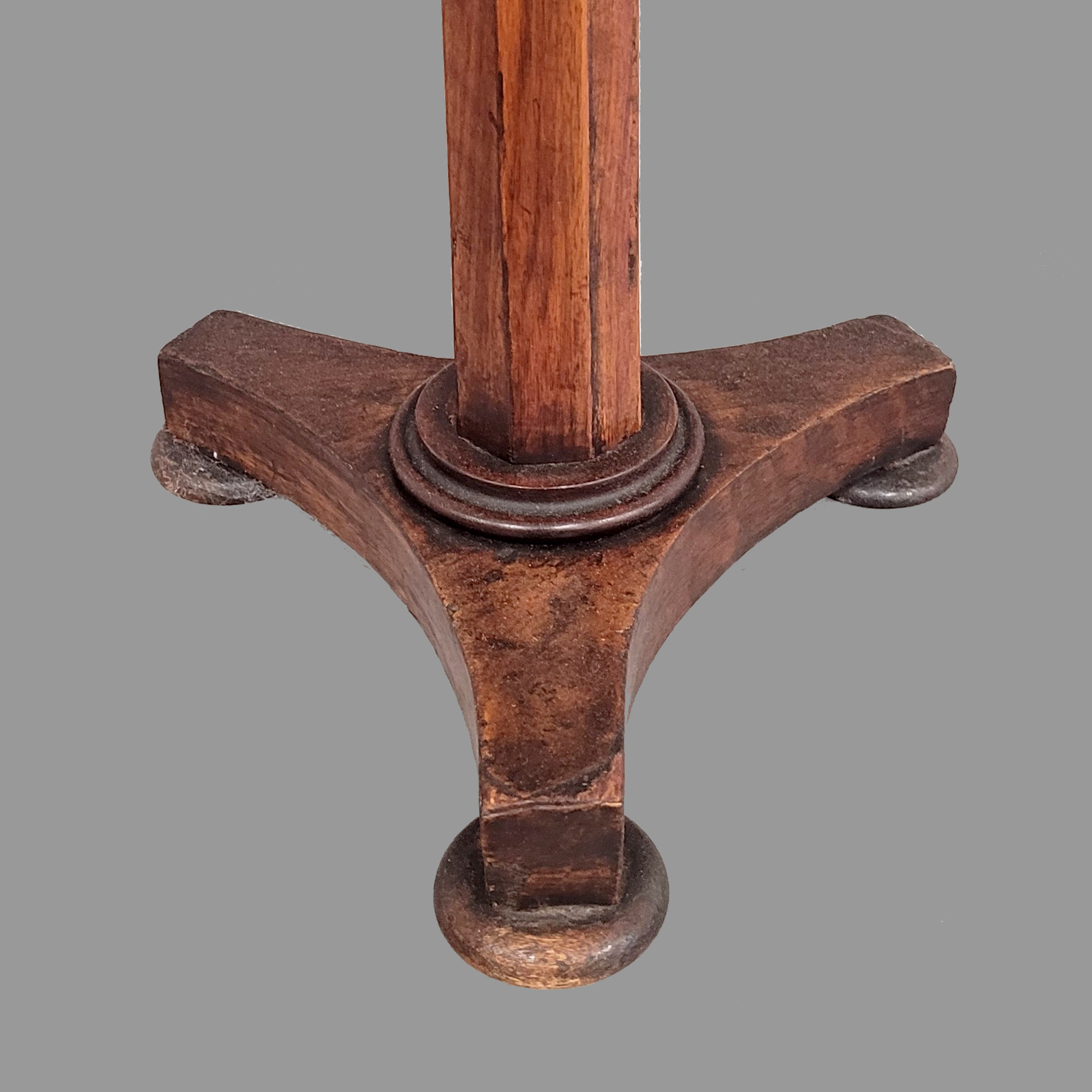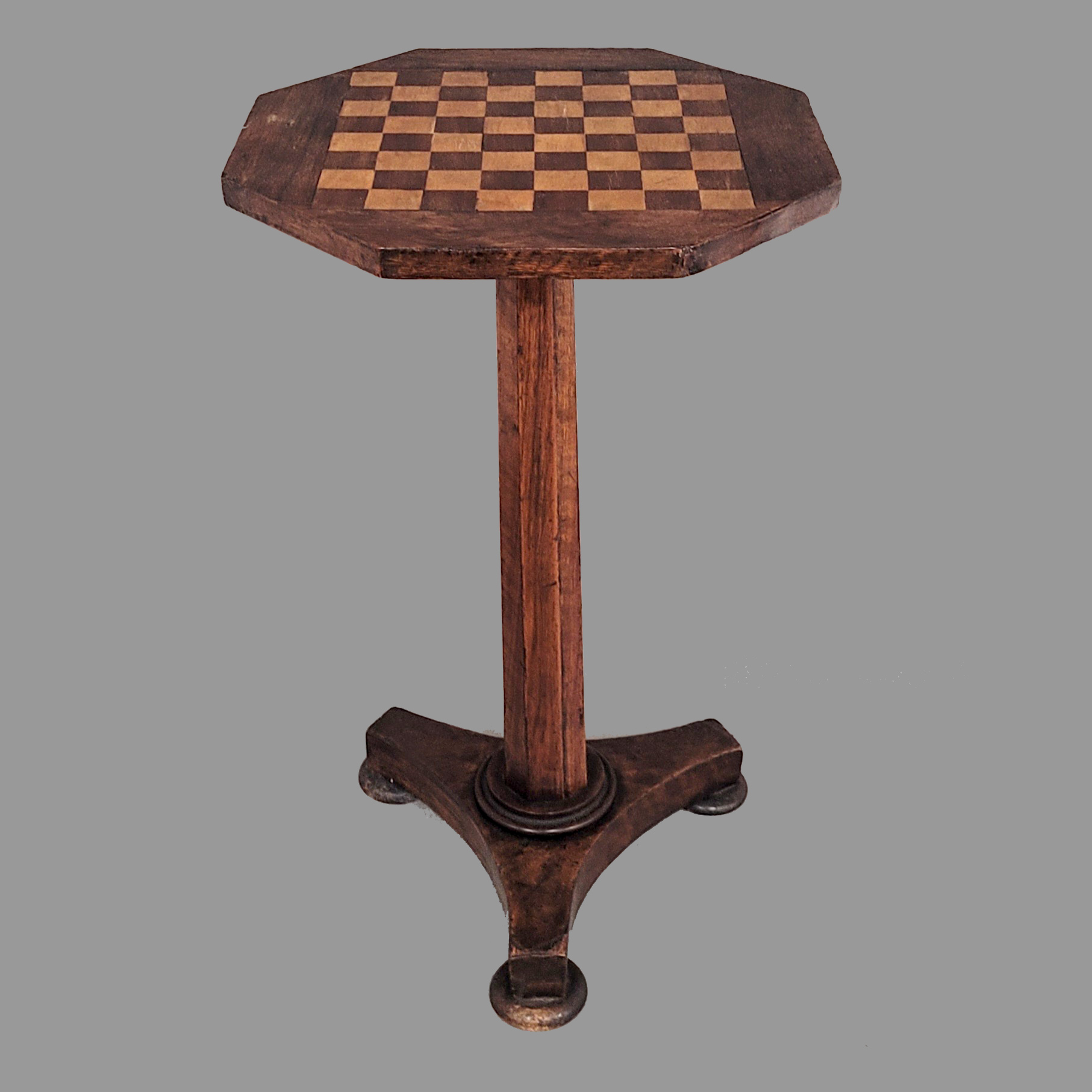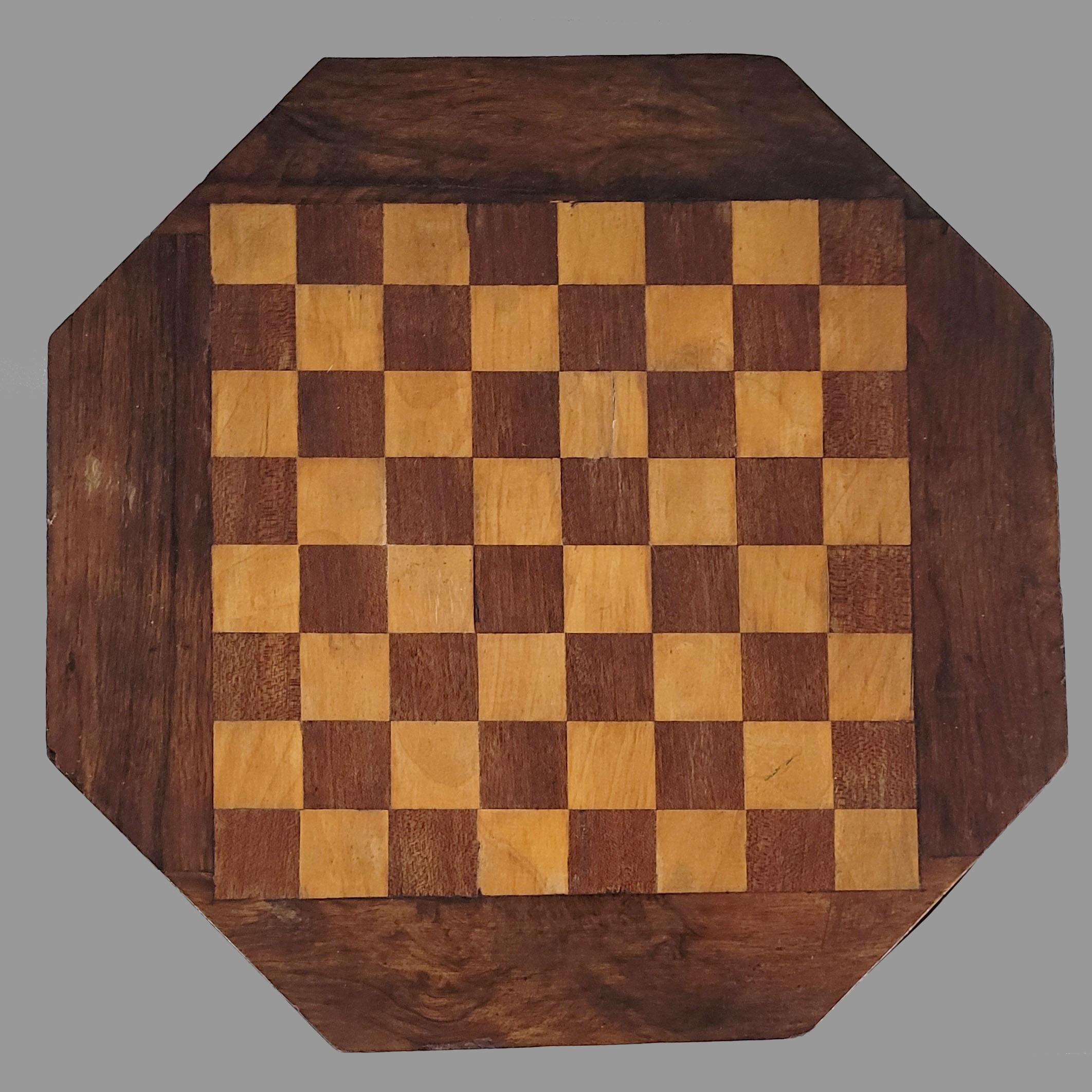 Nuss, Ahorn und andere Obsthölzer, achteckige Platte, Deutsch 19. Jahrhundert, Höhe 69 cm, Platte 44 x 44 cm