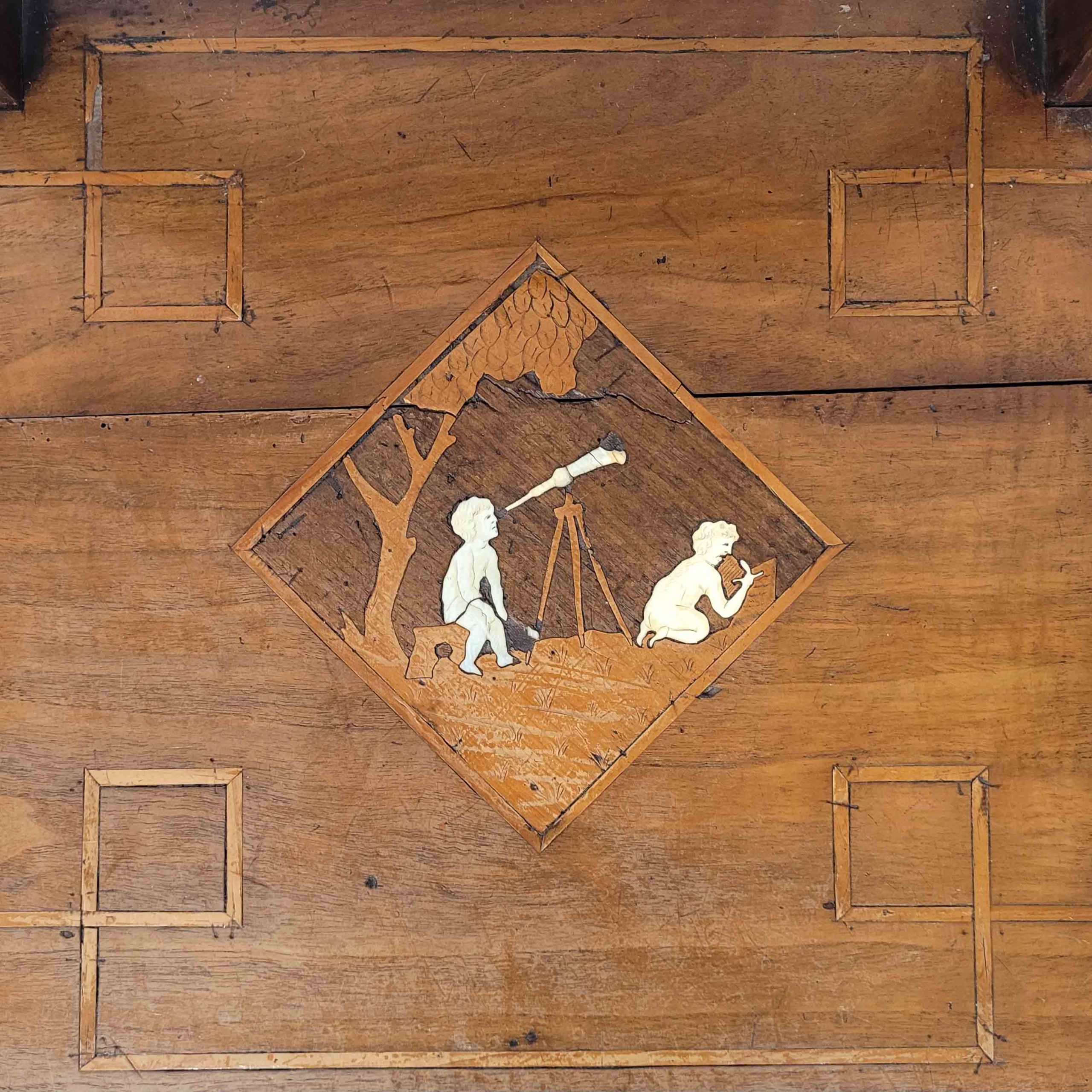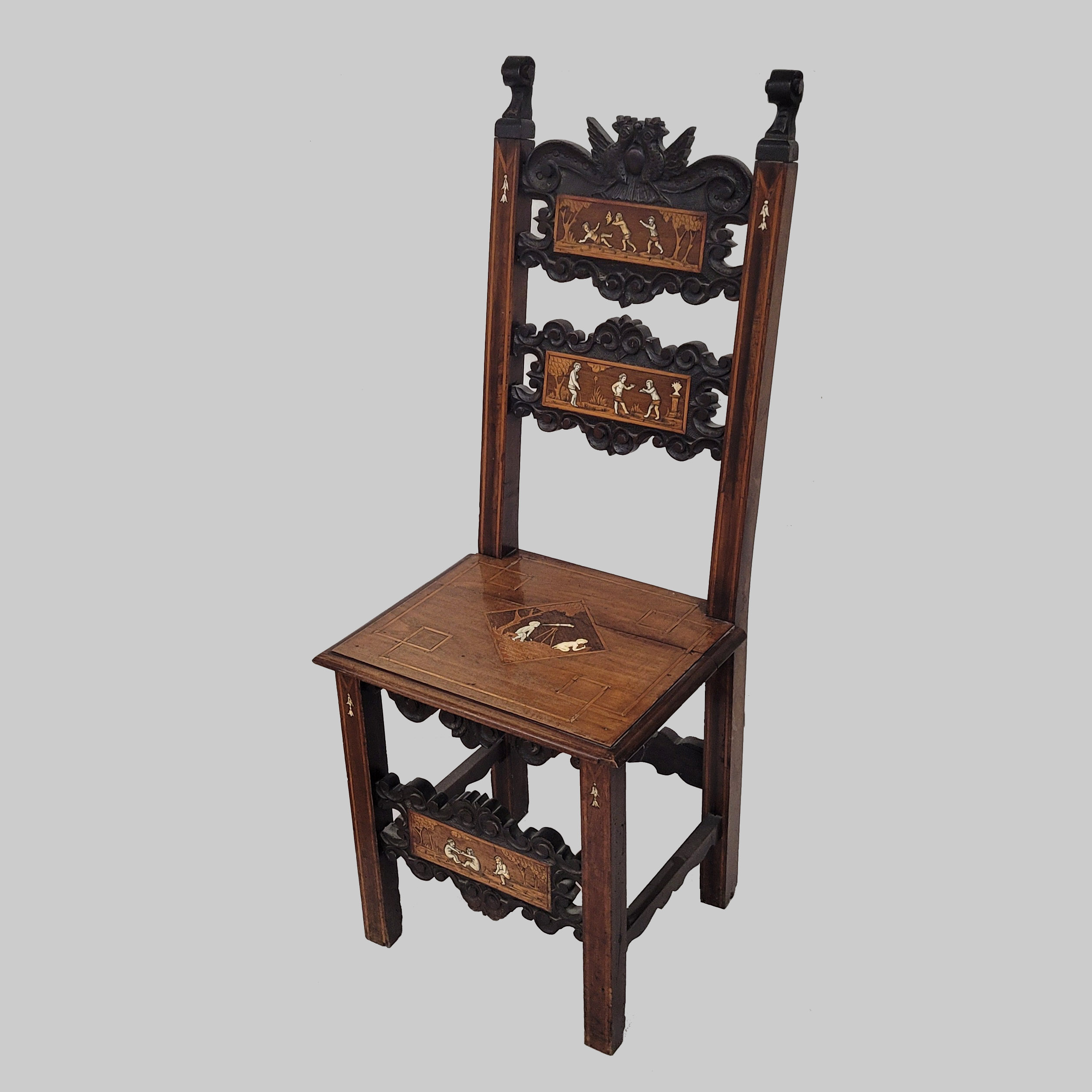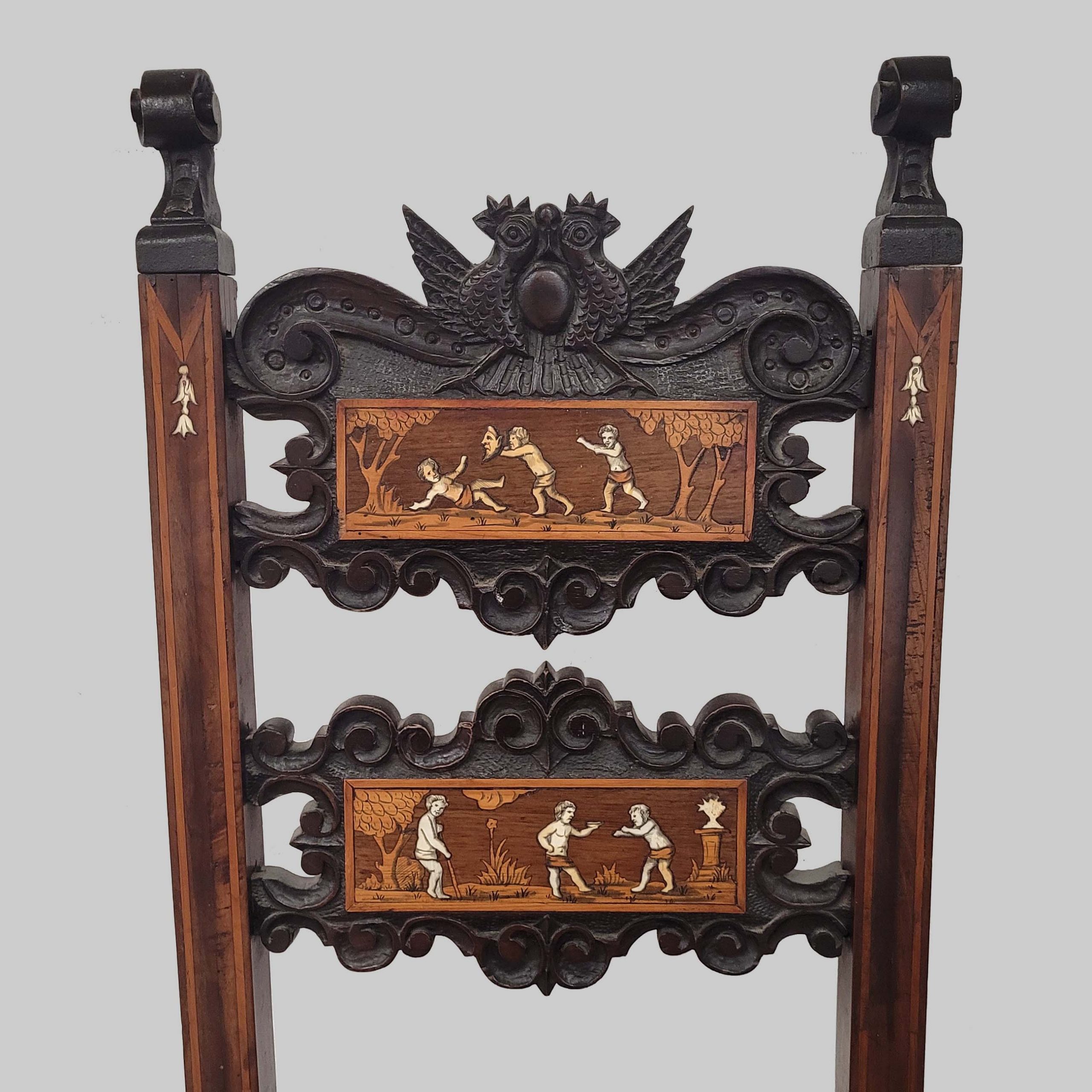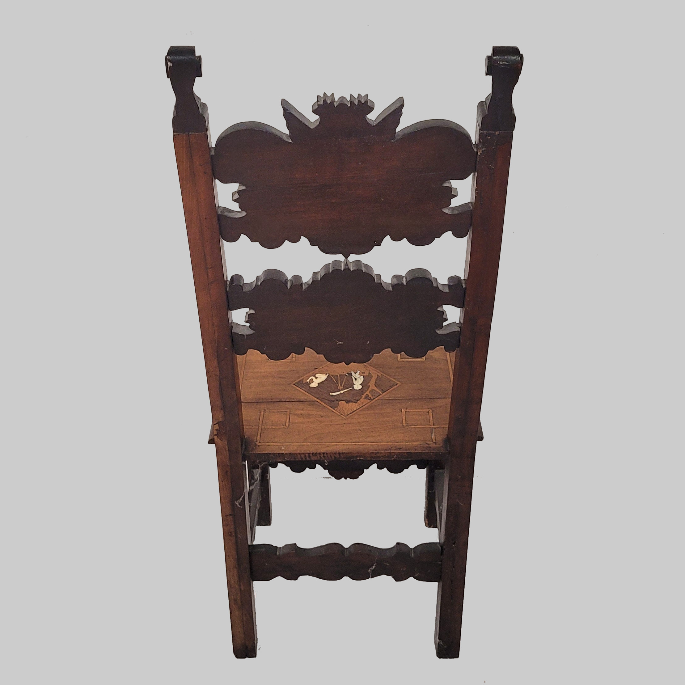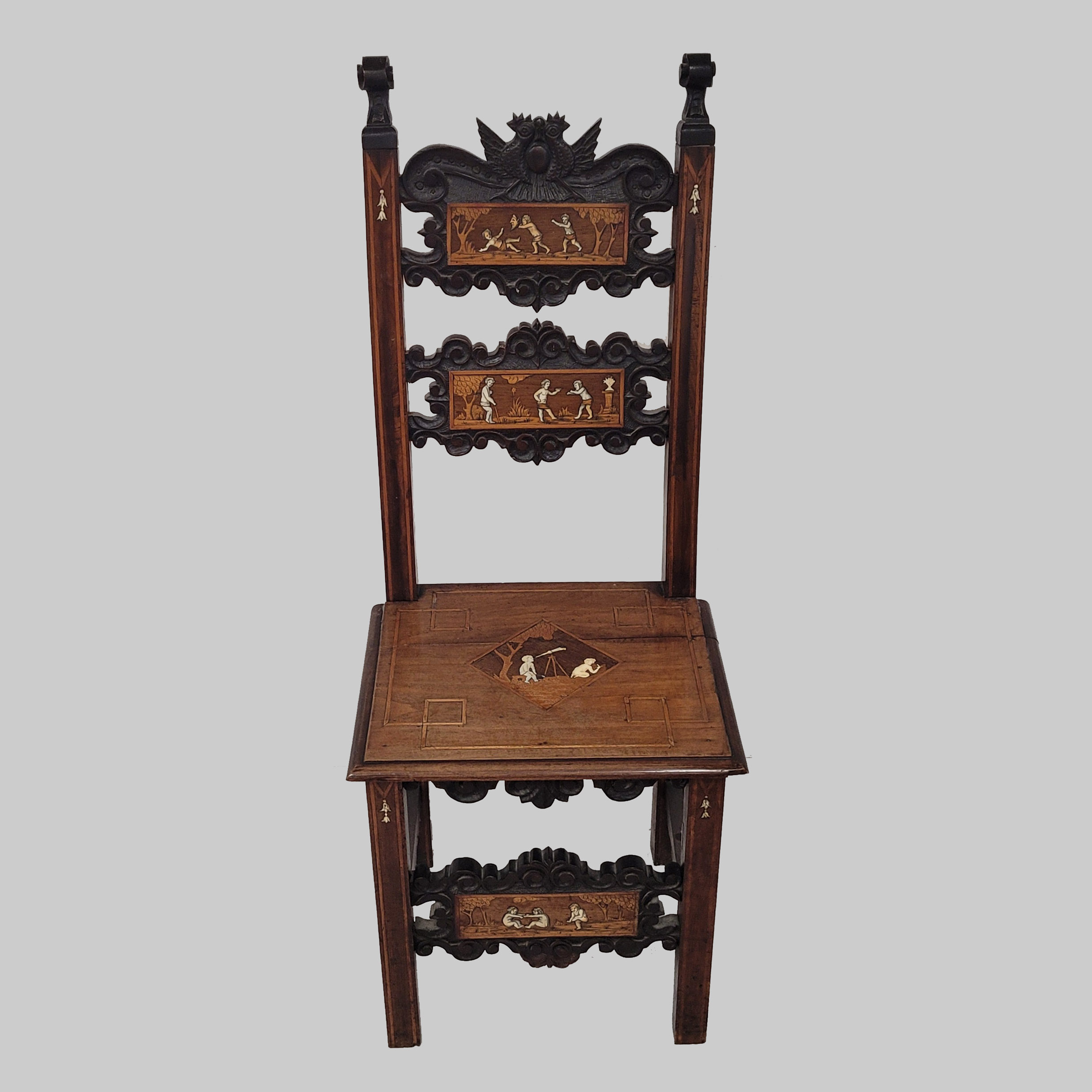 Nussbaum, partiell geschwärzt, vierkantige querverstrebte Beine, Rückenlehne mit zwei Querverstrebungen, die obere mittig mit antithetischen Hähnen, Beinintarsien mit Putten in Landschaft, Oberitalien 17. Jahrhundert, Höhe 124 cm, Sitzhöhe 52 cm