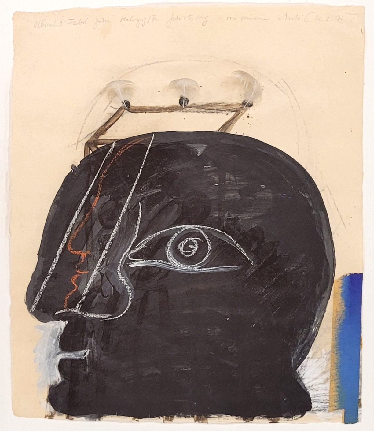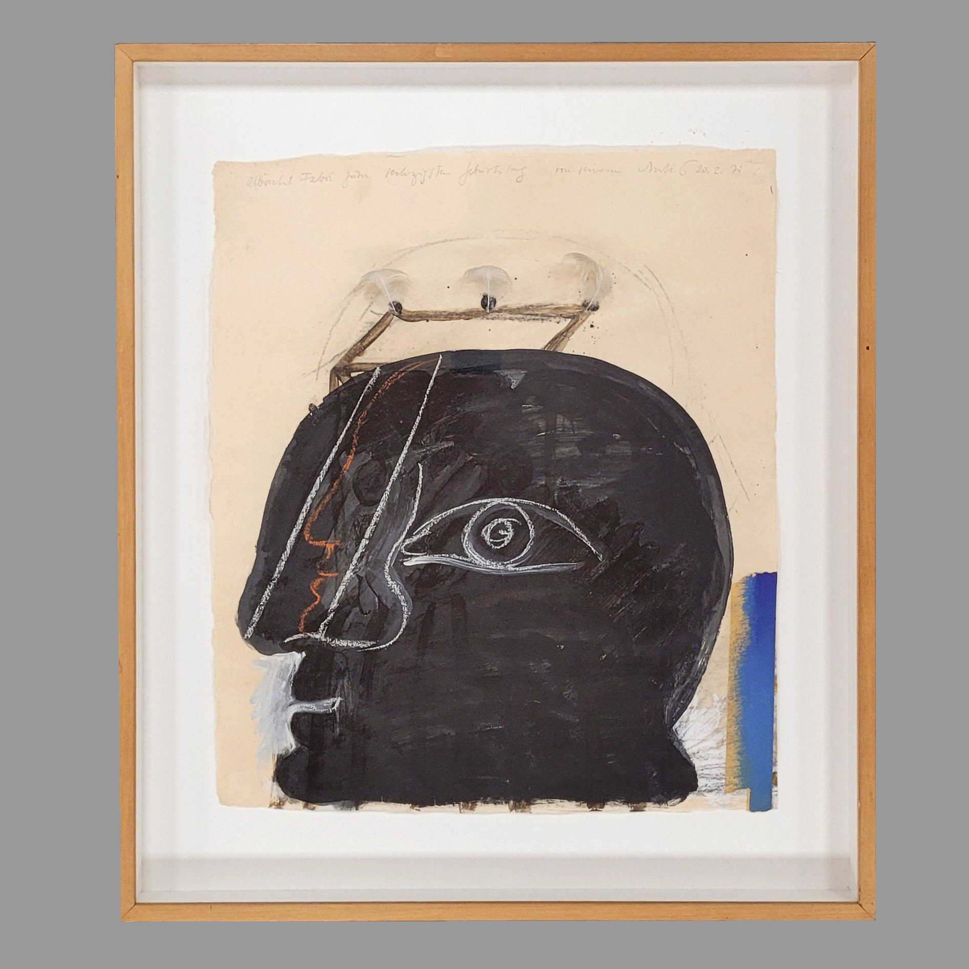 Mischtechnik, Kreide, Gouache, Collage auf Papier, signiert und datiert 20.2.1971 mit Widmung oben Mitte in Bleistift, 51 x 43,5 cm, gerahmt unter Glas