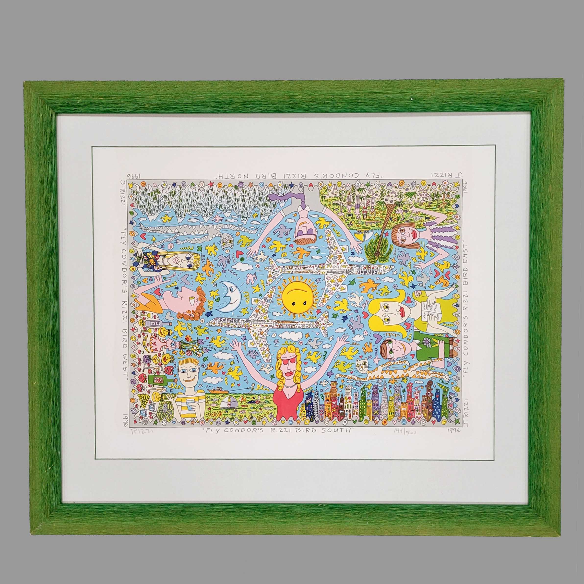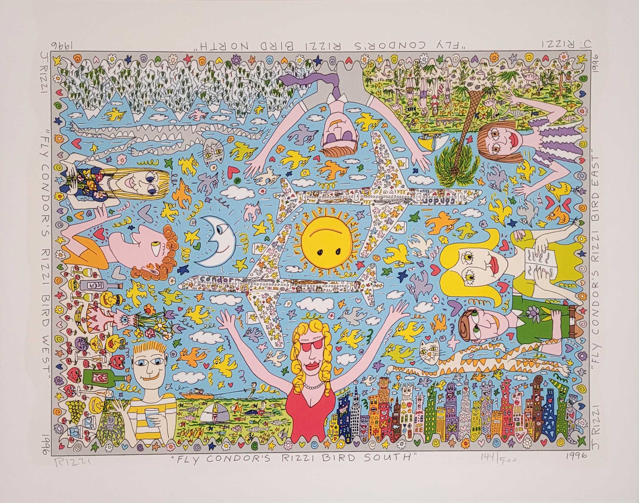 RIZZI, James (1950 – 2011): Fly Condor’s Rizzi Bird SouthFarblithographie, 1996, signiert unten links, nummeriert 144/500 unten rechts, 39 x 50 cm, gerahmt unter Glas und Passepartout