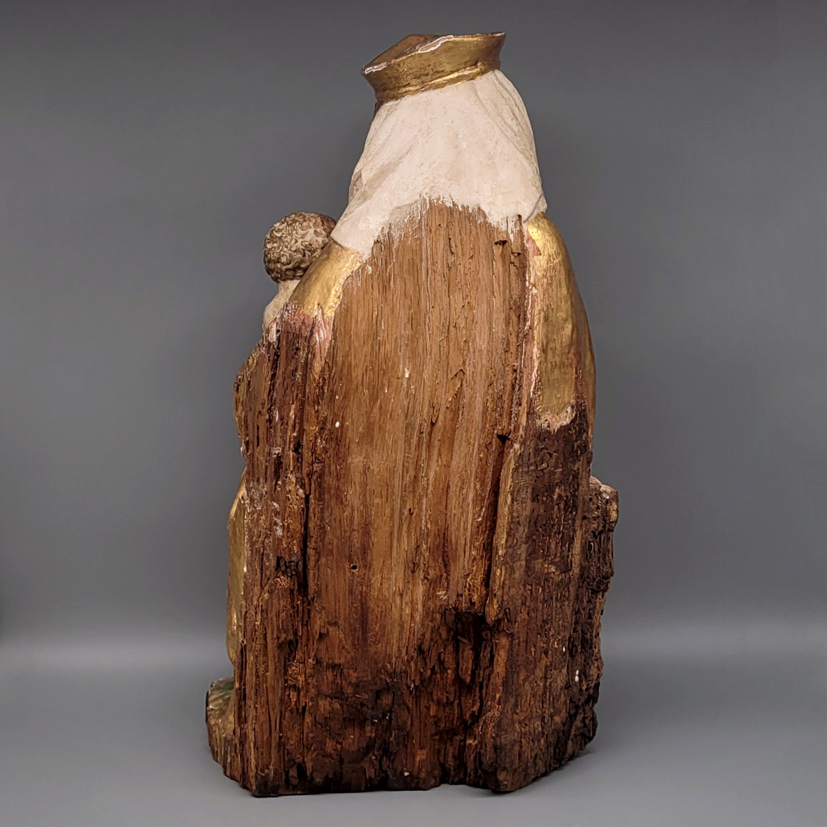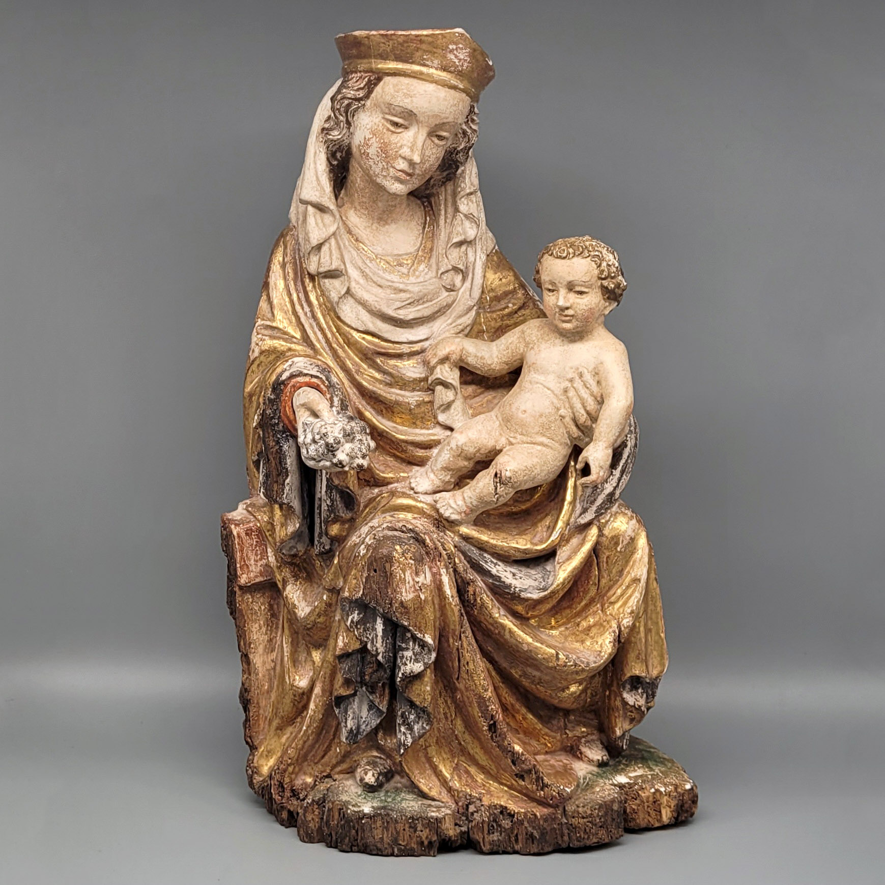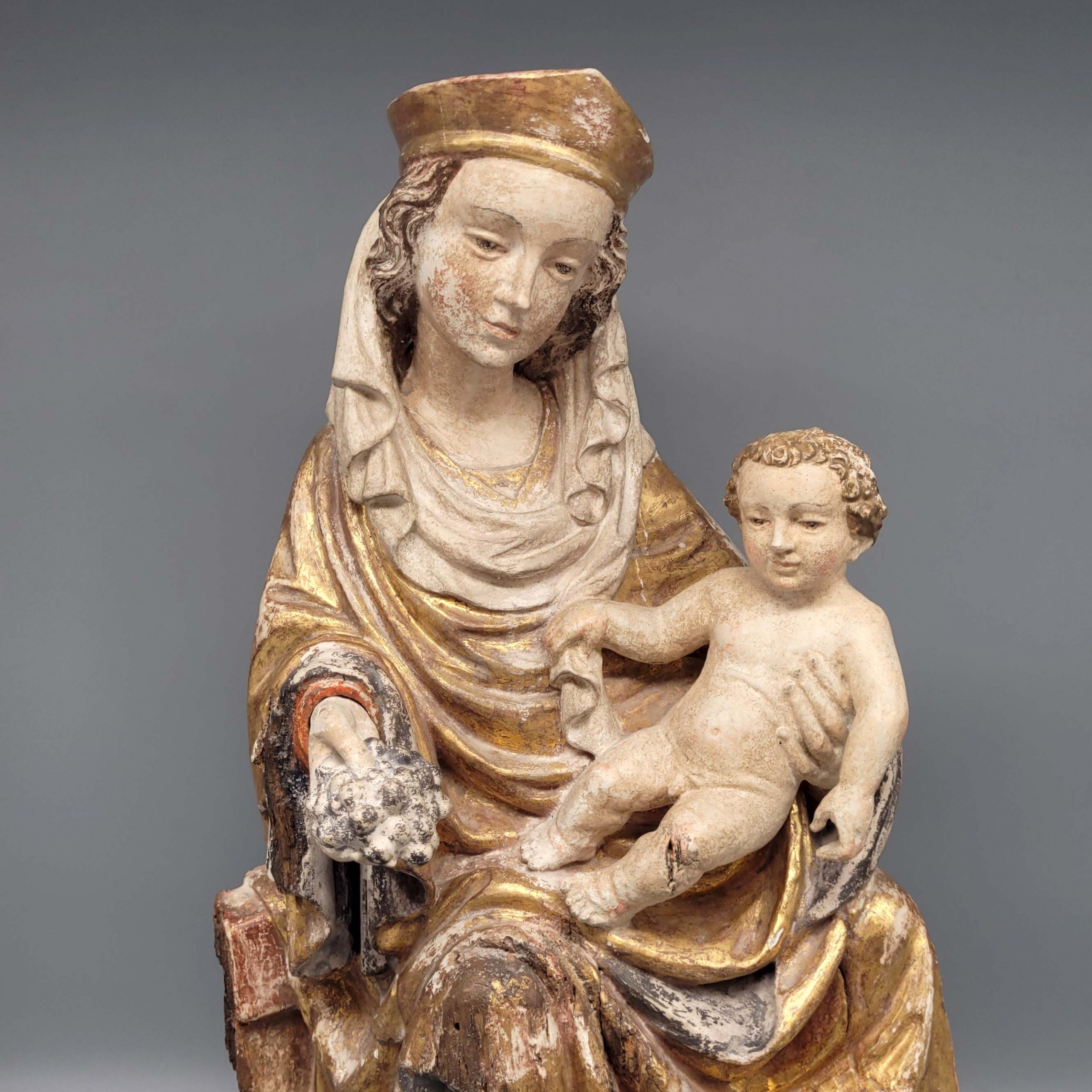Thronende Madonna mit KindHolz, geschnitzt, farbig gefasst und vergoldet, in der Art des „Weichen Stils“, Österreich 19./20. Jahrhundert, Höhe 44 cm