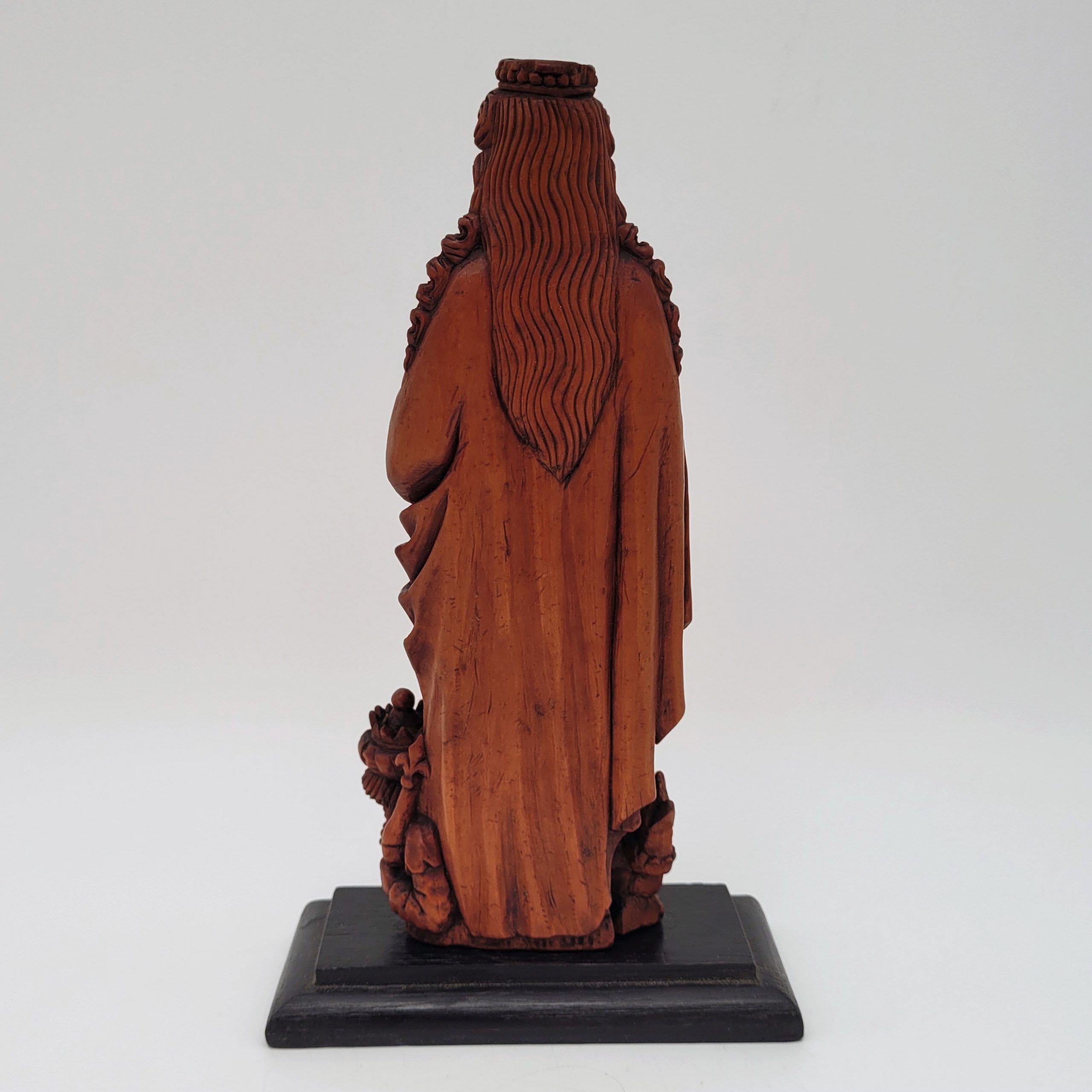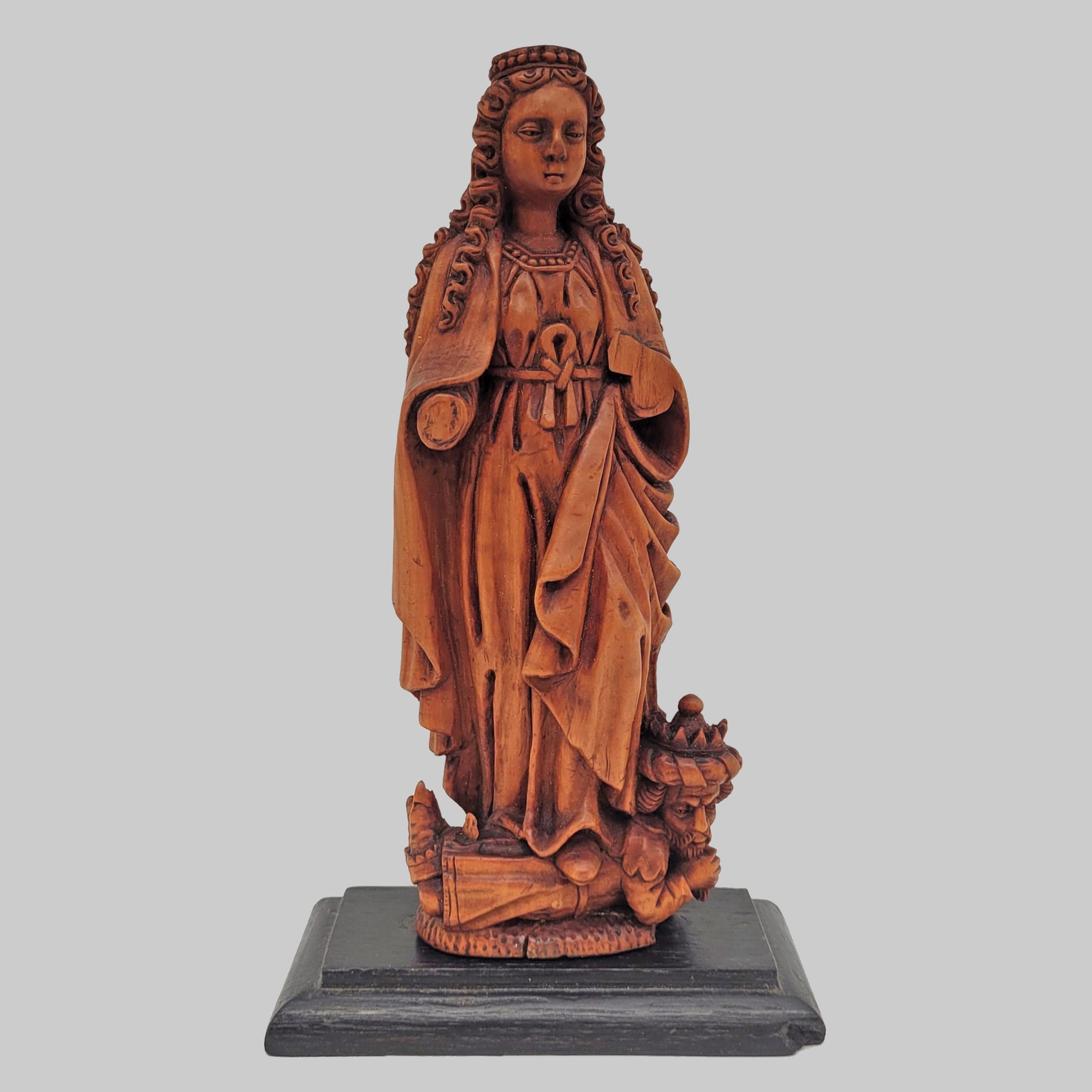 Heilige KatharinaBuchsbaum, vollrund geschnitzt, rückseitig leicht abgeflacht, bodenseitig alte Sammlermarke, Flämisch 17. Jahrhundert, Höhe 19 cm (ohne den Holzsockel)