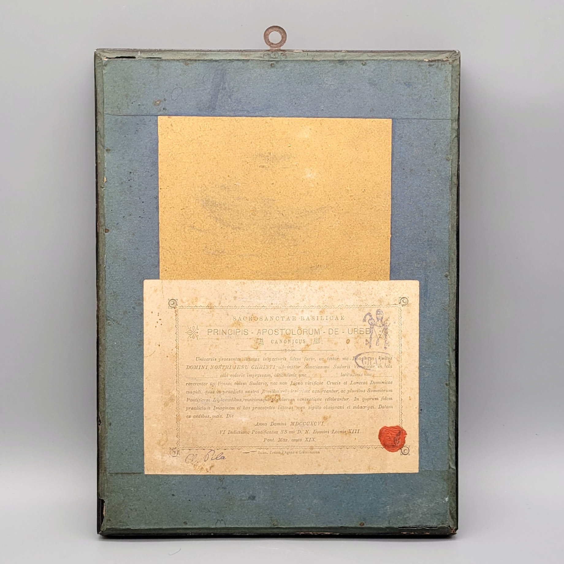 Schweißtuch der Veronika (Vera effigies) Kupferstich auf Seide, Berührungsreliquie aus dem Pontifikat Leo XIII, datiert 1896, 26,5 x 18 cm, gerahmt unter Glas