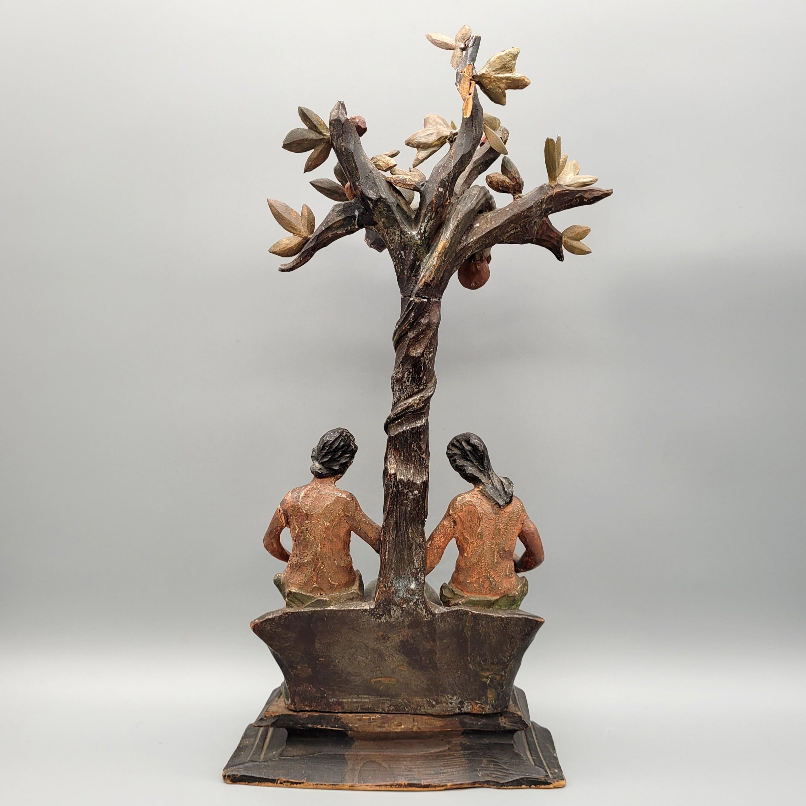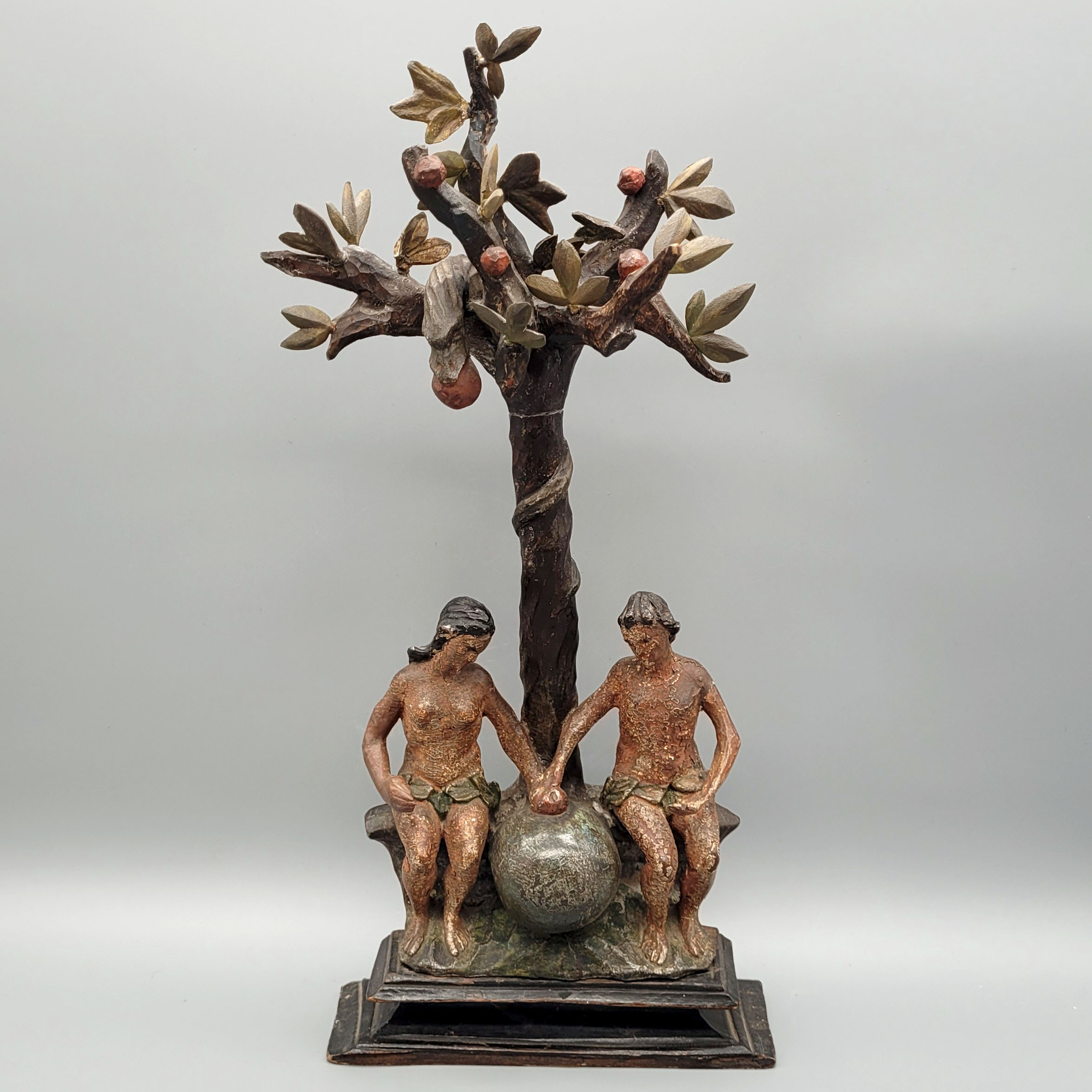 Adam und Eva unter dem ParadiesbaumHolz geschnitzt, rückseitig partiell abgeflacht, alt farbig gefasst, Alpenländisch, wohl Grödnertal Ende 18. Jahrhundert, Höhe 39 cm (Fehlstellen, geklebte Brüche)