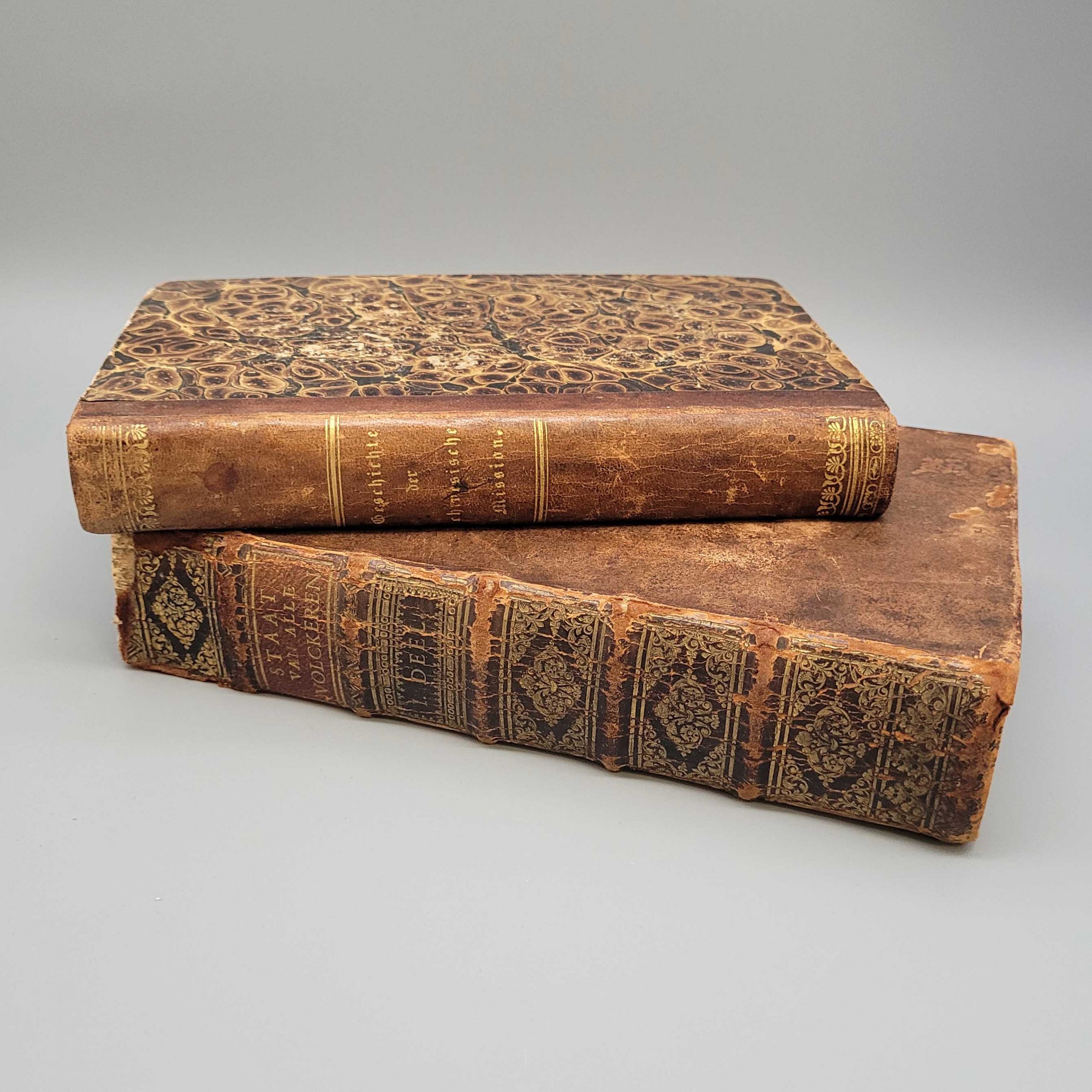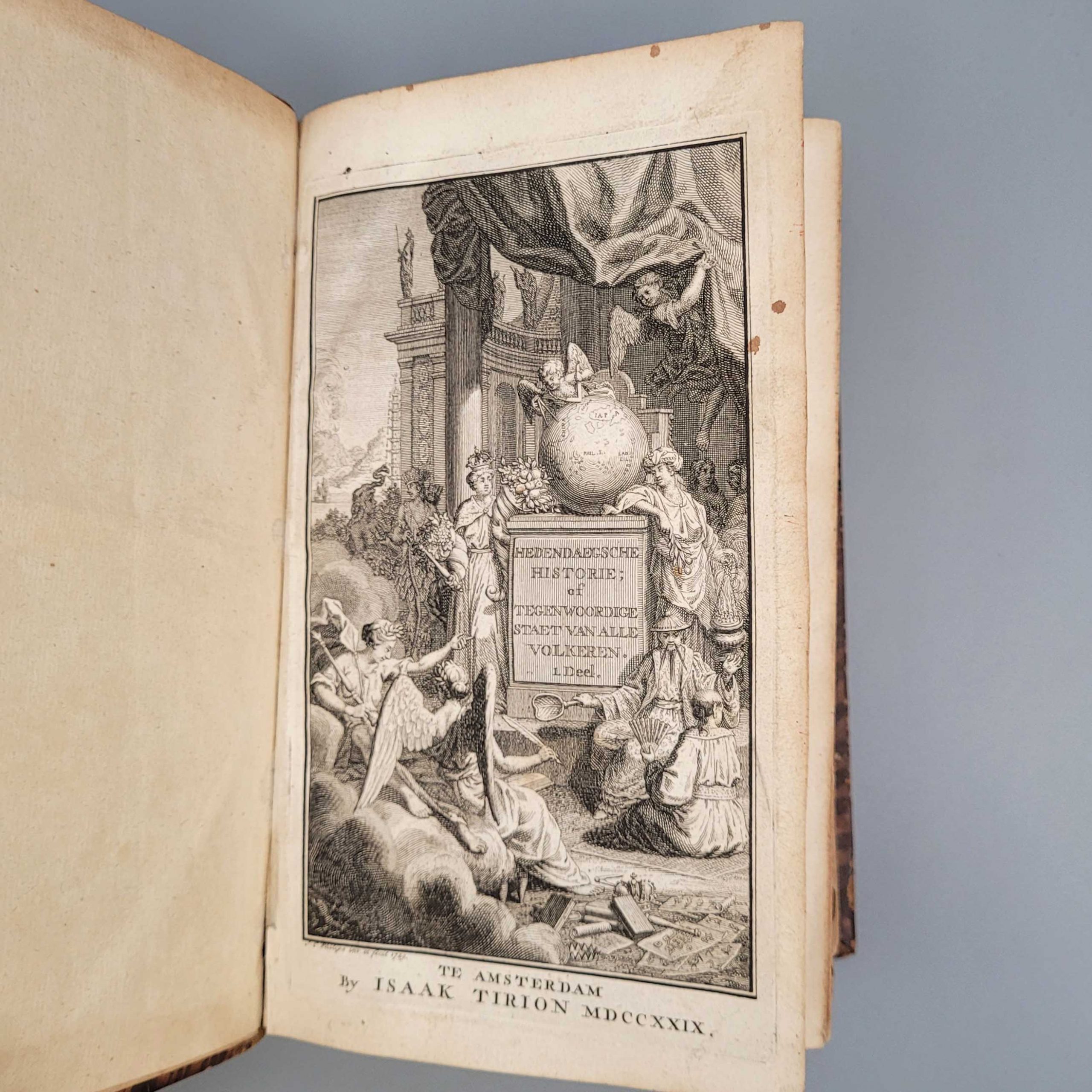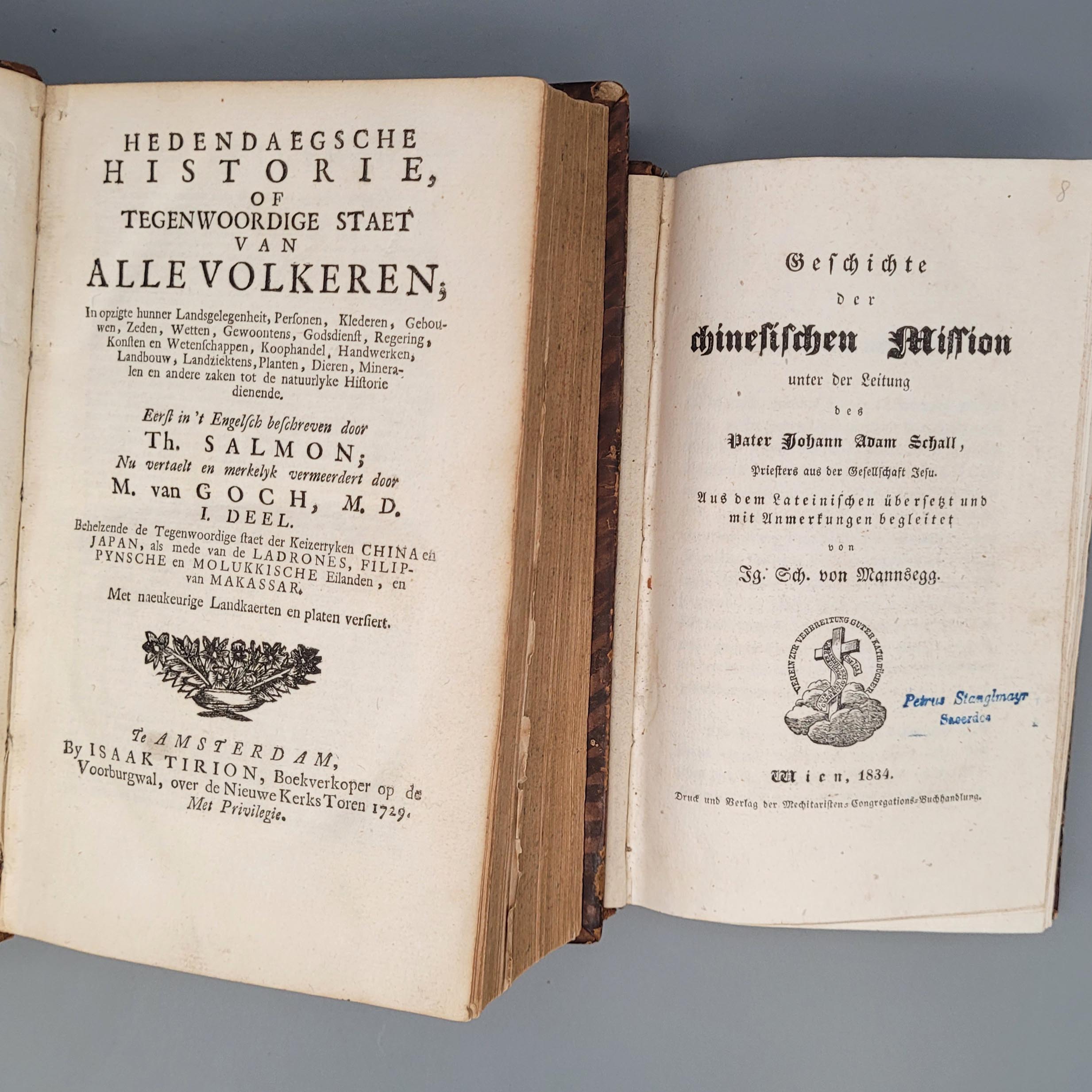 1. Deel (von 43), Amsterdam (Isaak Tirion) 1729 (beschreibt China, Japan und die Philippinen Kupfertitel, 3 Faltkarten und 7 Ansichten und Pläne [davon 5 gefaltet], Ledereinband mit Goldrückenprägung der Zeit) beigelegt SCHALL VON BELL, Johann Adam, Geschichte der chinesischen Mission. Aus dem Lateinischen übersetzt und mit Anmerkungen begleitet von Ig. Sch. von Mannsegg, Wien (Mechitaristen-Congregations-Buchhandlung) 1834 (Halbledereinband der Zeit)