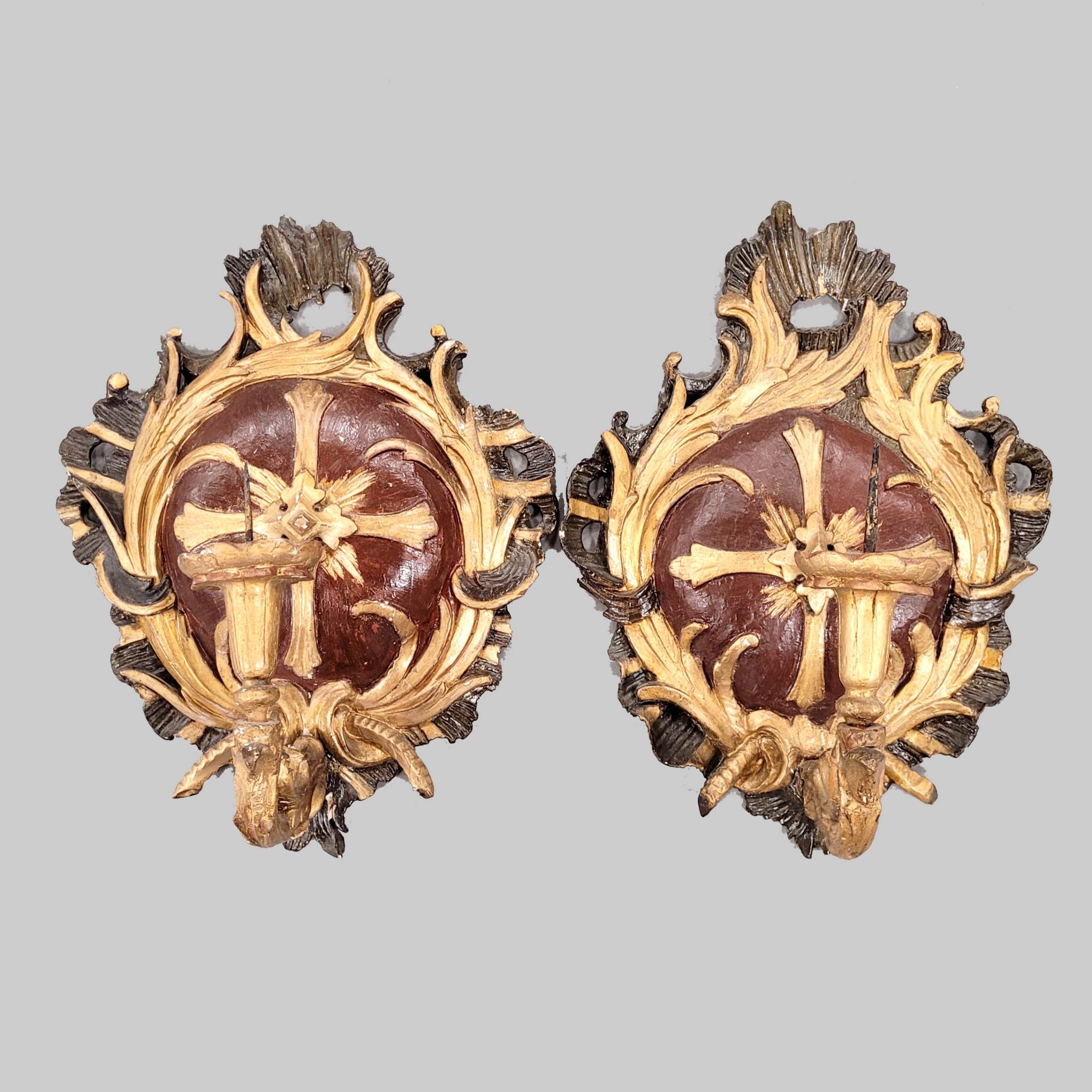 Holz, geschnitzt, farbig gefasst und vergoldet, im Schild Strahlenkreuz, Tüllen eingesteckt, Deutsch 18. Jahrhundert, Höhe 45 cm