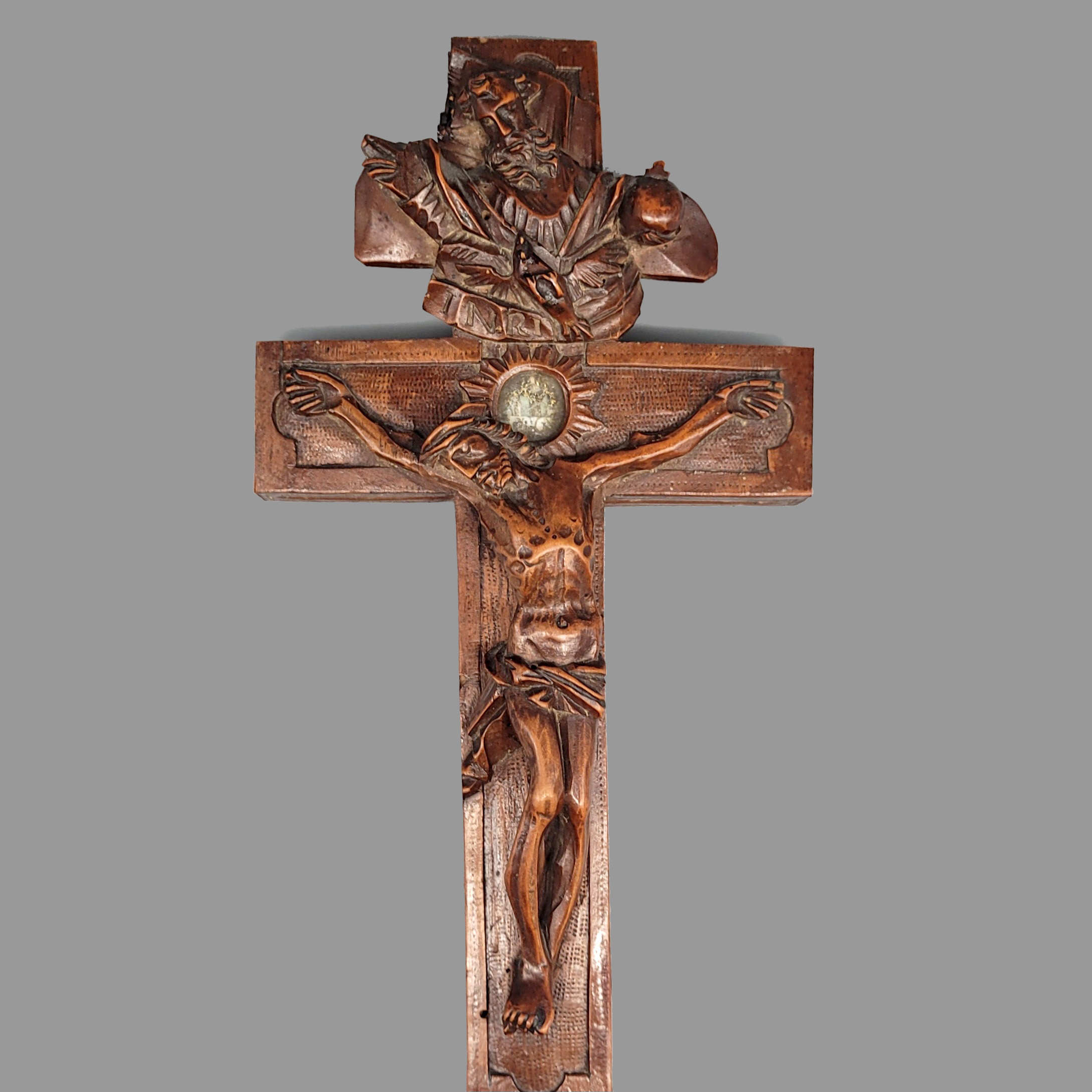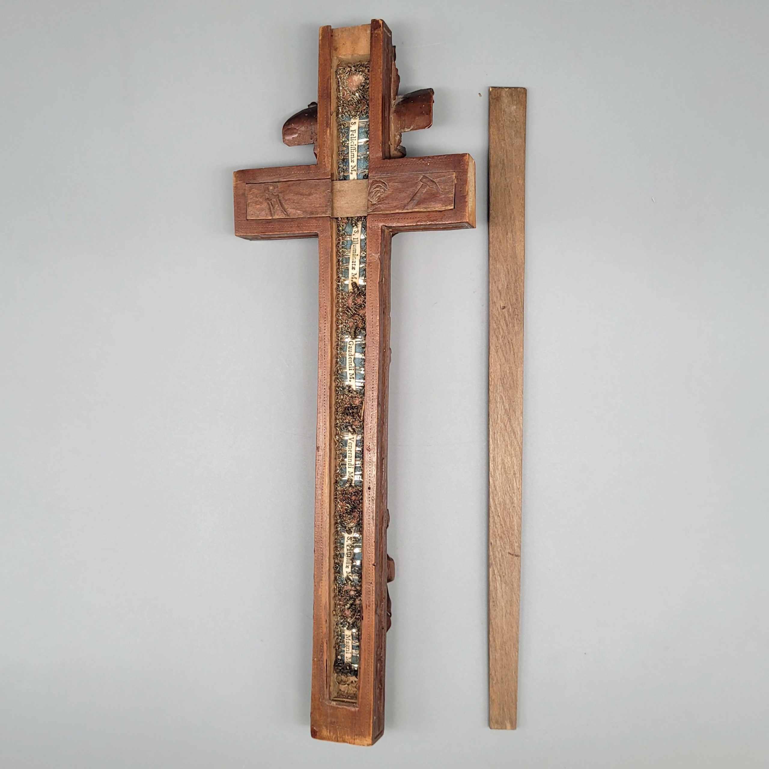 Reliquienkreuz als WetterkreuzHolz, geschnitzt, rückseitig Leidenswerkzeuge im Flachrelief, Schuber, innen Reliquien mit Namensbeischrift, Alpenländisch, um 1800, Höhe 30,3 cm