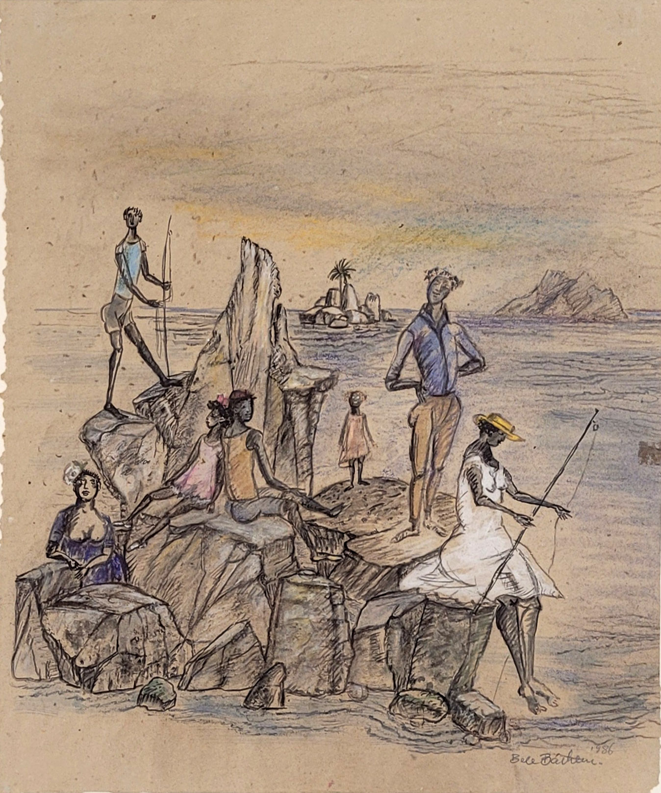 BACHEM, BELE (1916-2005): Am FelsenstrandGouache auf Papier, signiert und datiert 1986 unten rechts, 50 x 43 cm, gerahmt unter Glas** ) Bei einem Zuschlag über 400 € werden 2 % für VG Bild gemäß §26 UrHG erhoben