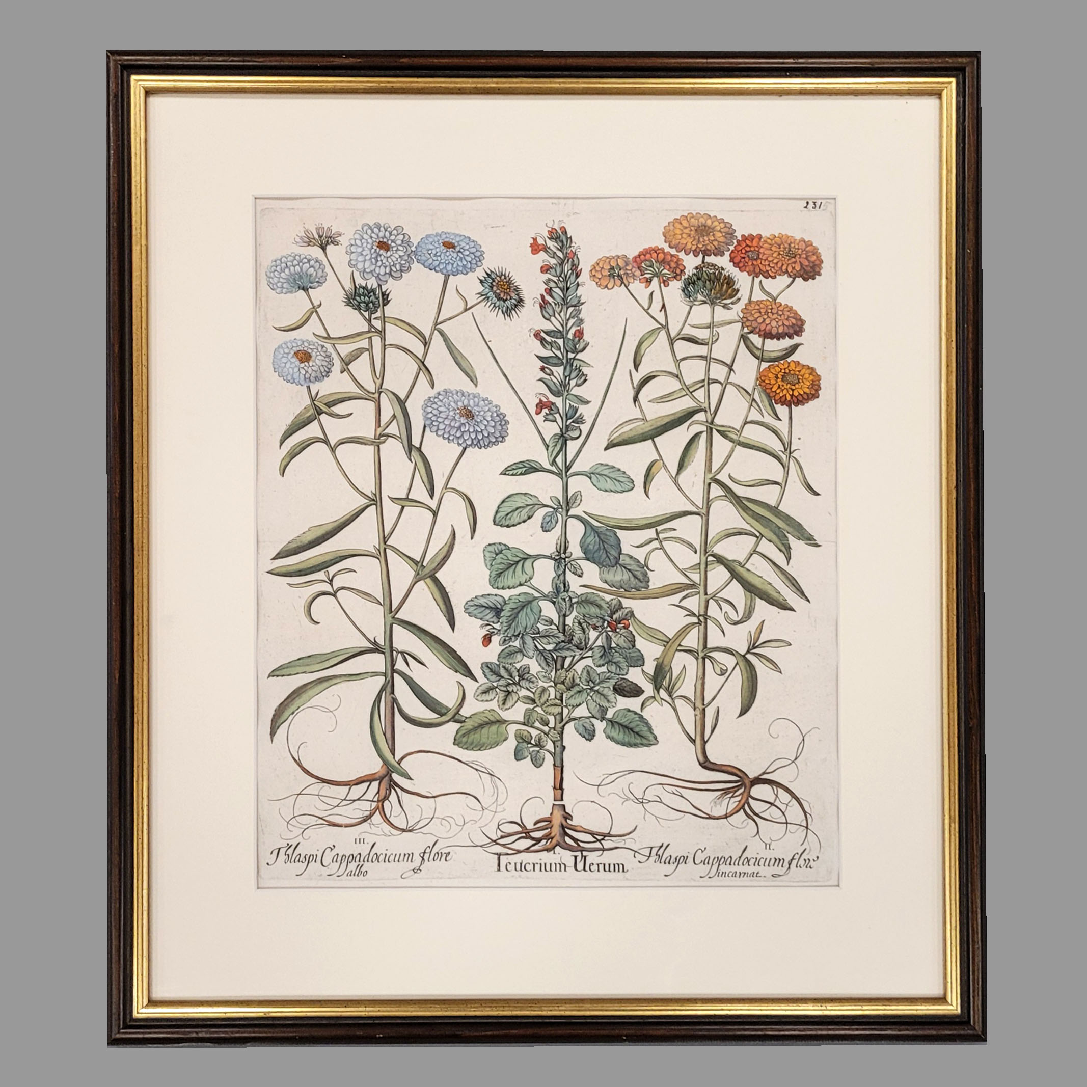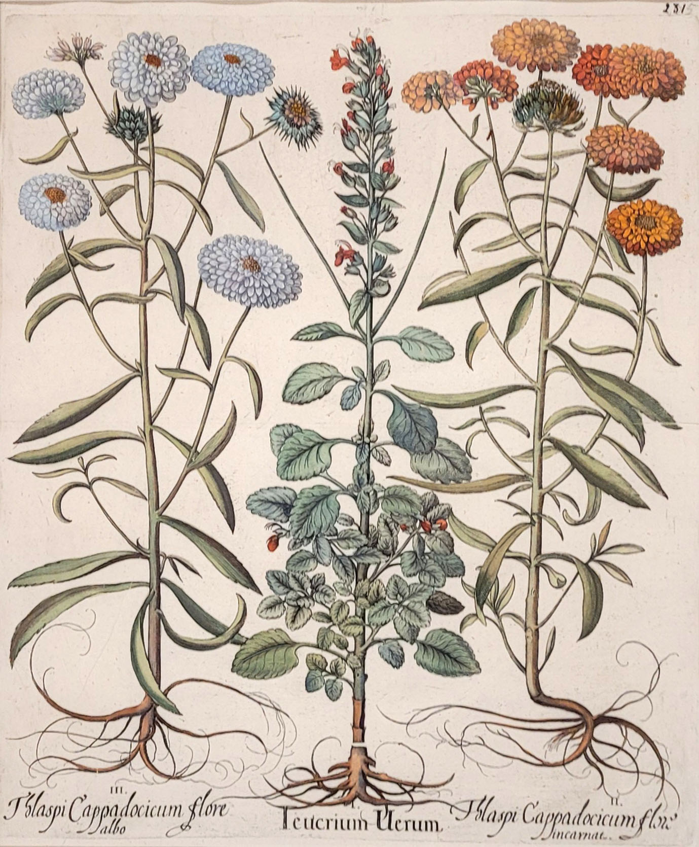 BESLER, Basilius (1561-1629): Teucrium verum (Katzengamander)Kupferstich, koloriert, später nummeriert oben rechts, aus dem „Hortus Eystettensis“, 48 x 40 cm, gerahmt unter Glas (leichte Stauchfalten)