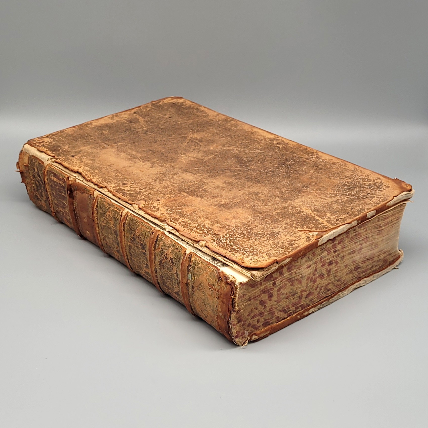 Vol I (von IV), Den Haag (Chretien van Lom) 1724 (Titel und Karte fehlen, zahlreiche Kupferstiche, Ledereinband mit goldgeprägten Rücken, Vorderdeckel fast gelöst)