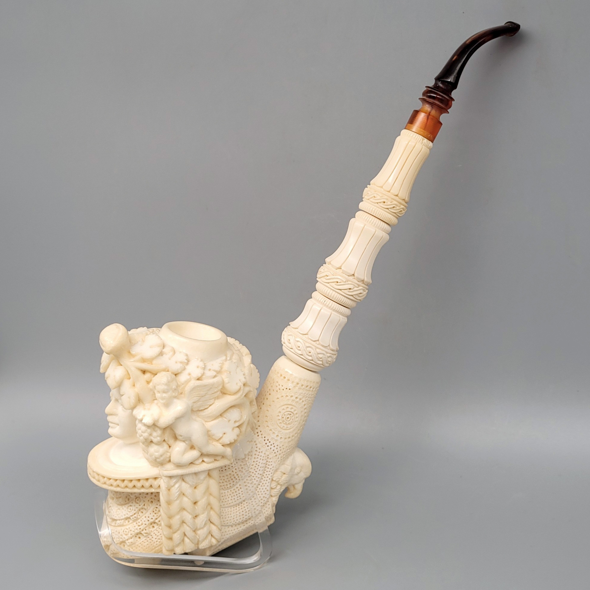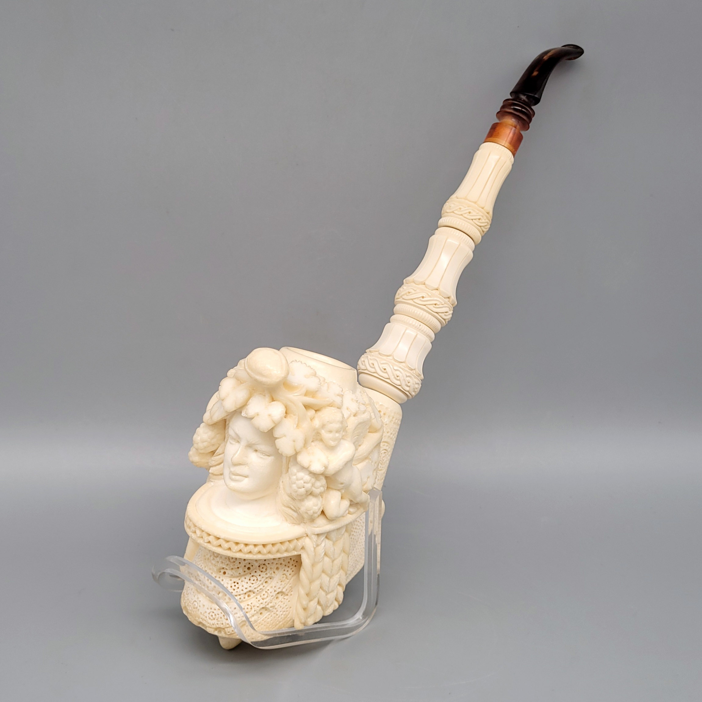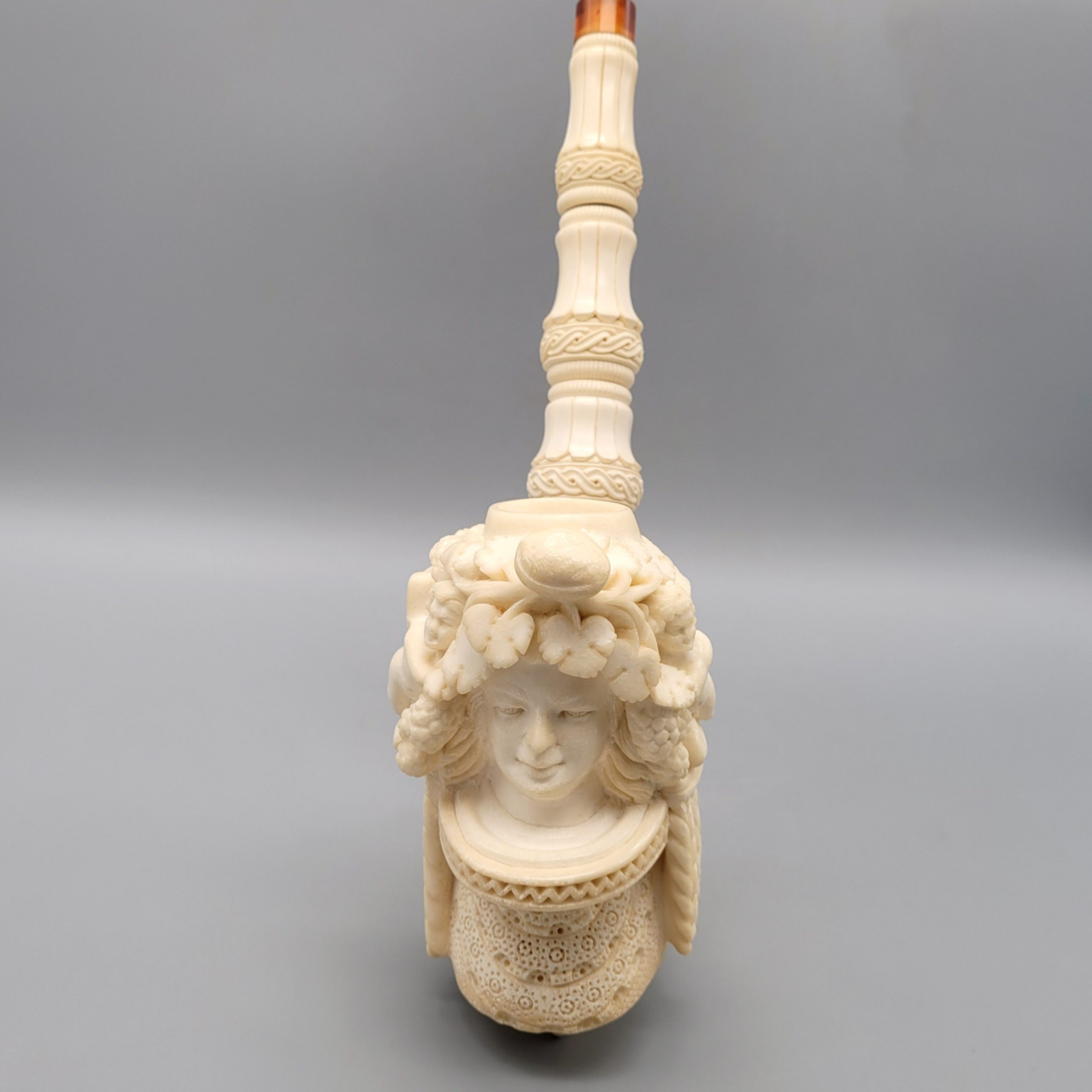 Meerschaum, geschnitzt, gebohrt, Pfeifenkopf in Form eines Frauenkopfes mit Puttenfiguren in den Haaren, Deutsch, um 1900, Kopf 13,5 x 12,5 x 7,5 cm (Originalbox)