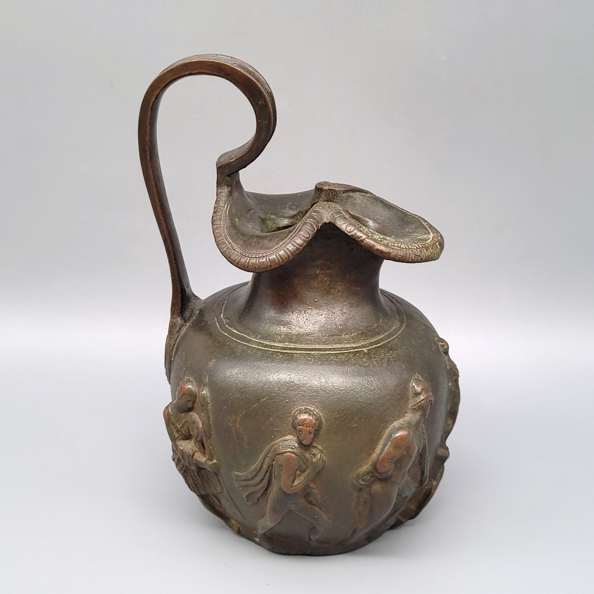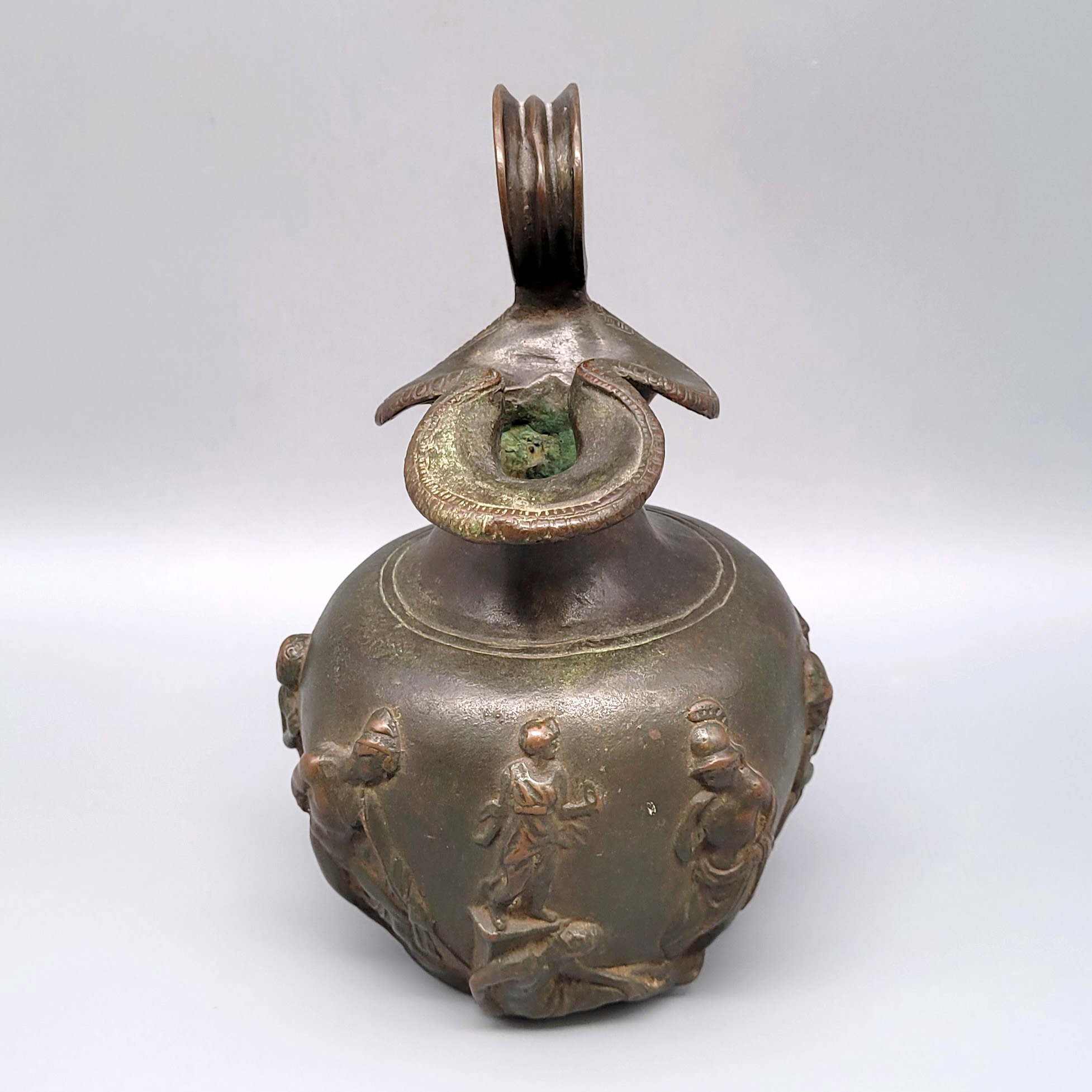Bronze, ergänzte Bodenplatte in Kupfer, Wandung mit mythologischen Relieffiguren, Italien 19. Jahrhundert oder älter, Höhe 19 cm