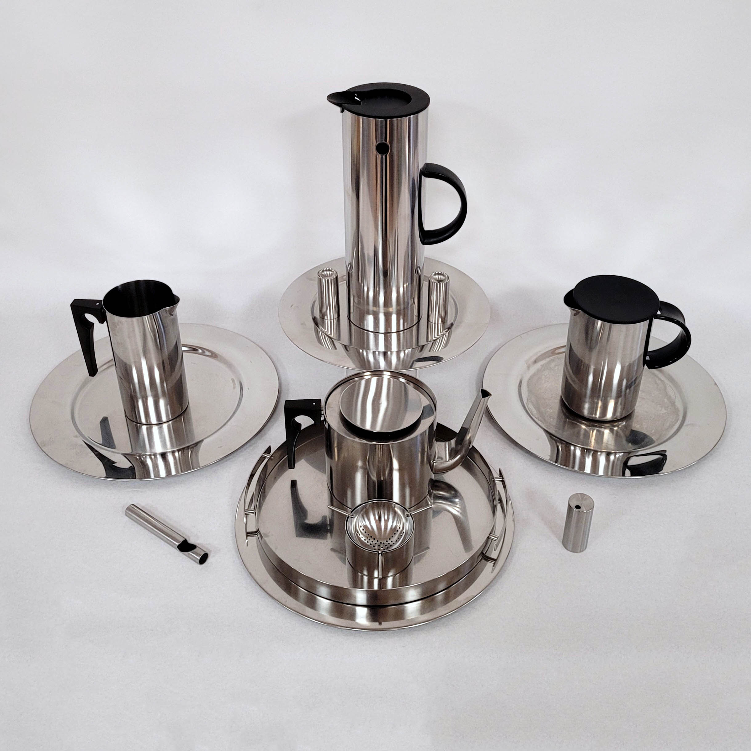 Edelstahl, Bakelit, Entwurf 1967, bezeichnet „stelton stainless Denmark“ bestehend aus: Tablett (rund), Teekanne, Teesieb, Warmhaltekanne (Erik Magnusson), Saftkanne, Milchkanne, Salz- und Pfefferstreuer, Zahnstocherbehälter, Flaschenöffner, 3 Teller, Durchmesser 32 cm (2x), bzw. 28 cm (1x)