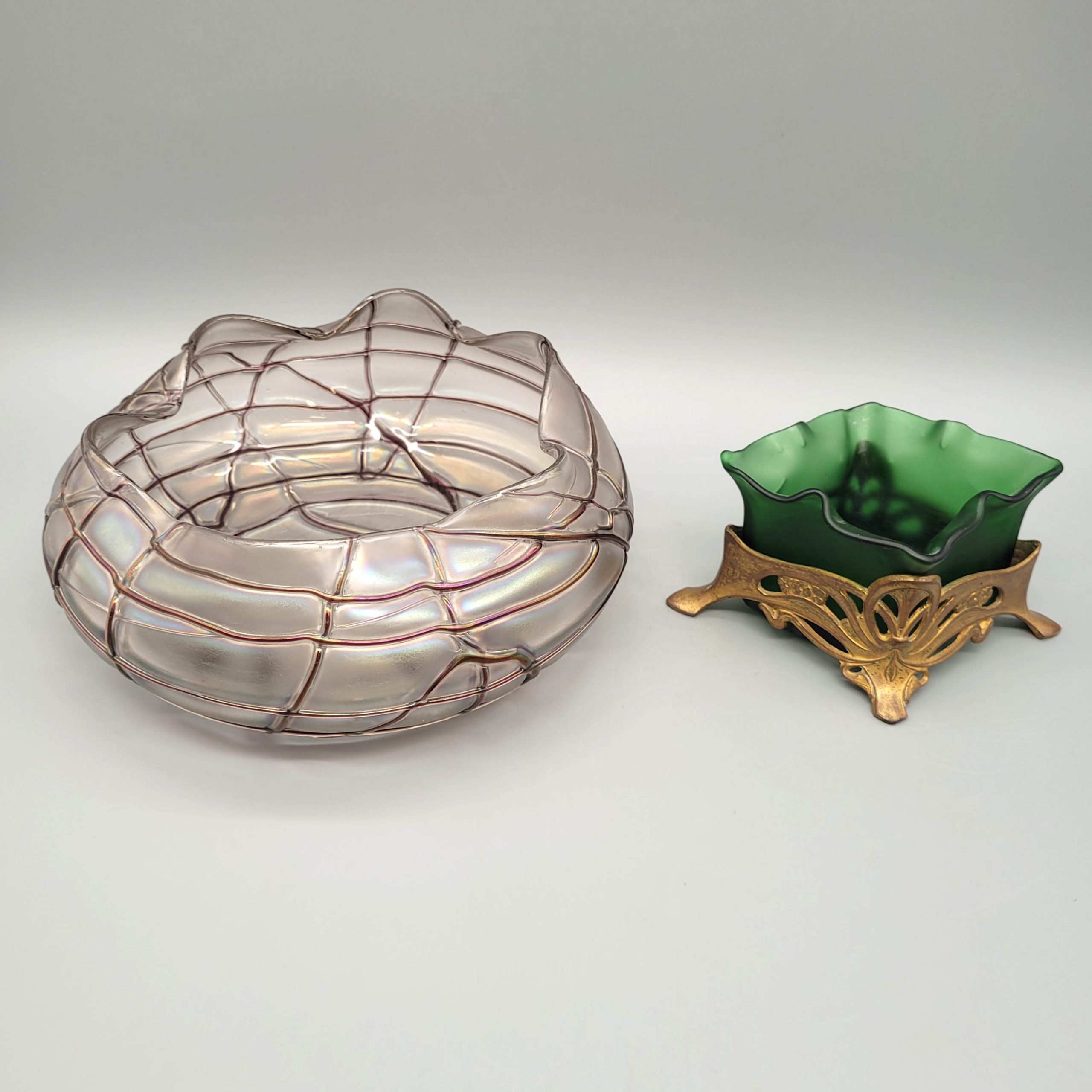 Zwei SchalenGlas, satiniert, irisiert, gefärbte Fadenauflagen, Kralik, Höhe 8 cm, Durchmesser 20 cm Glas, grün gefärbt, Bronzemontur, vergoldet, Frankreich, um 1900, 6 x 13,5 x 10 cm