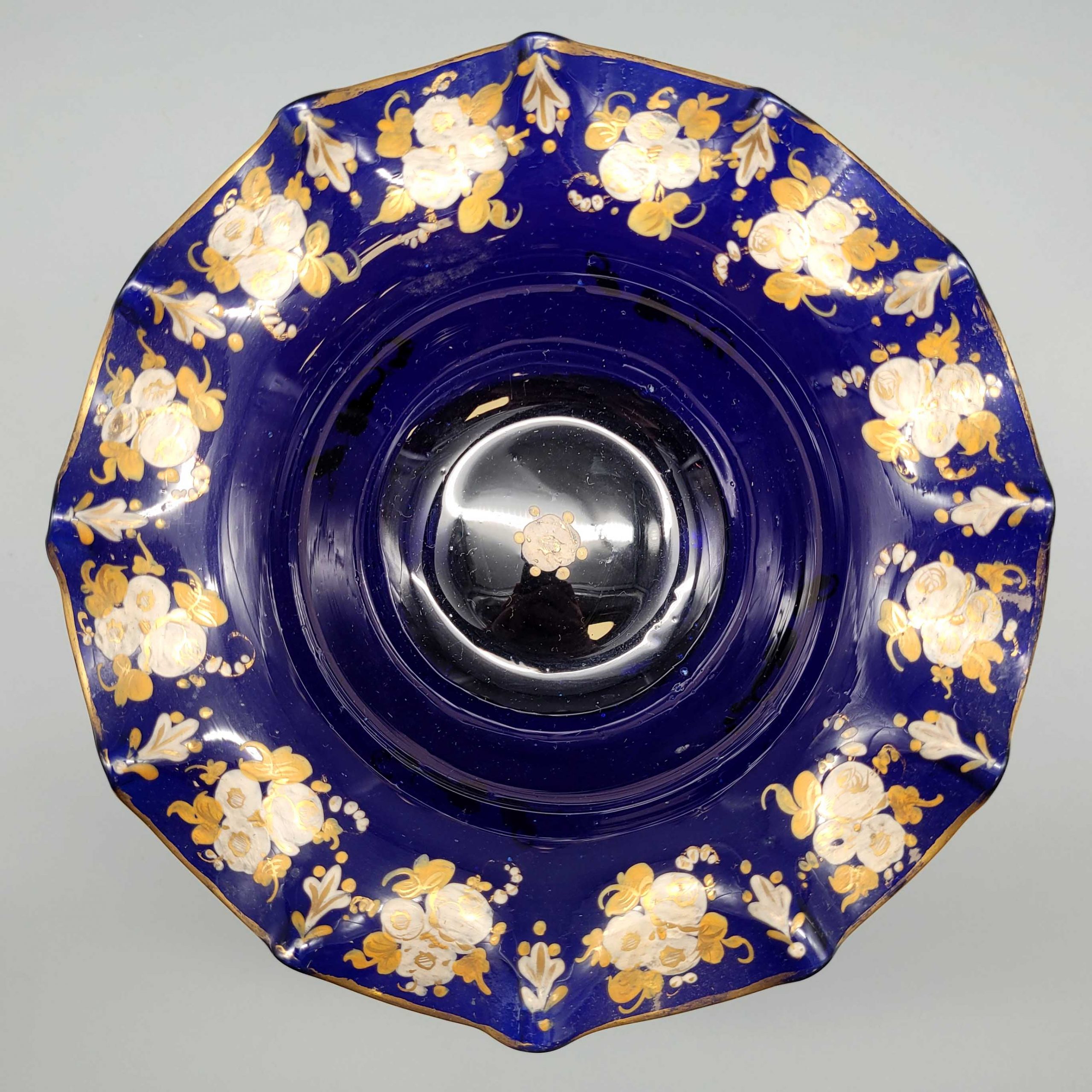 Schale auf hohem FußGlas, blau durchgefärbt, Blätter und Blütenmalerei in Gold und weißer Emaille, wohl Böhmen, 19. Jahrhundert, Höhe 15 cm