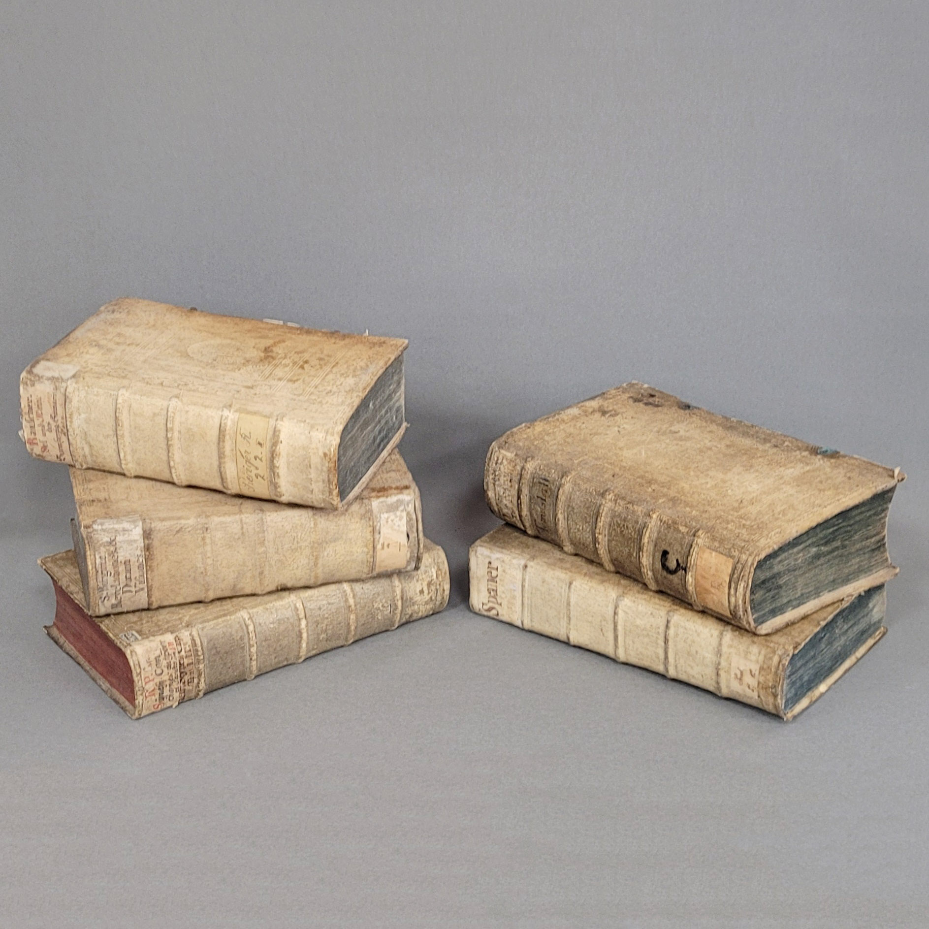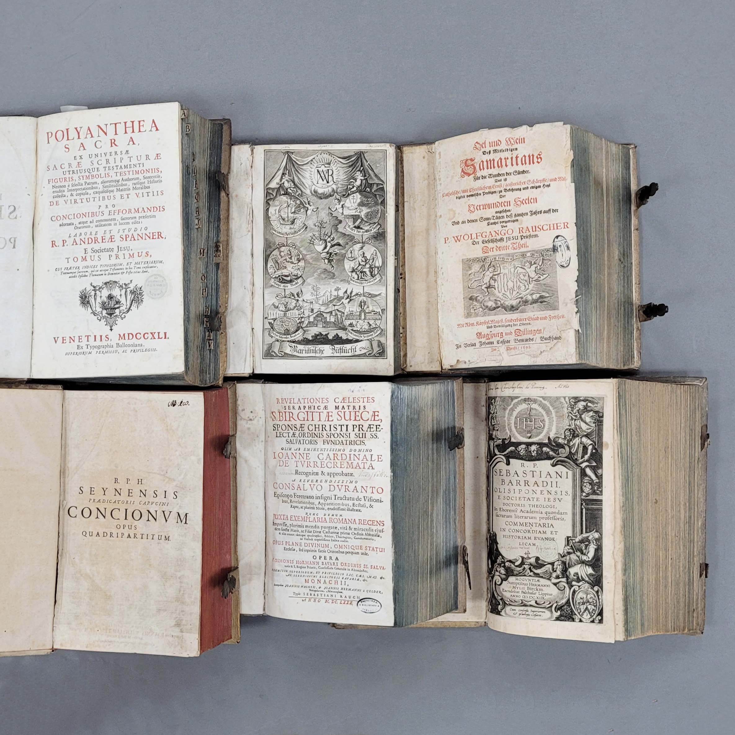 Konvolut Bücher 17. / 18. Jahrhundert religiöse Themen, fast alle in geprägten Pergamenteinbänden der Zeit mit Schließen (zum Teil verloren) insgesamt 6 Bände Wir weisen darauf hin, dass die Bücher nicht kollationiert sind