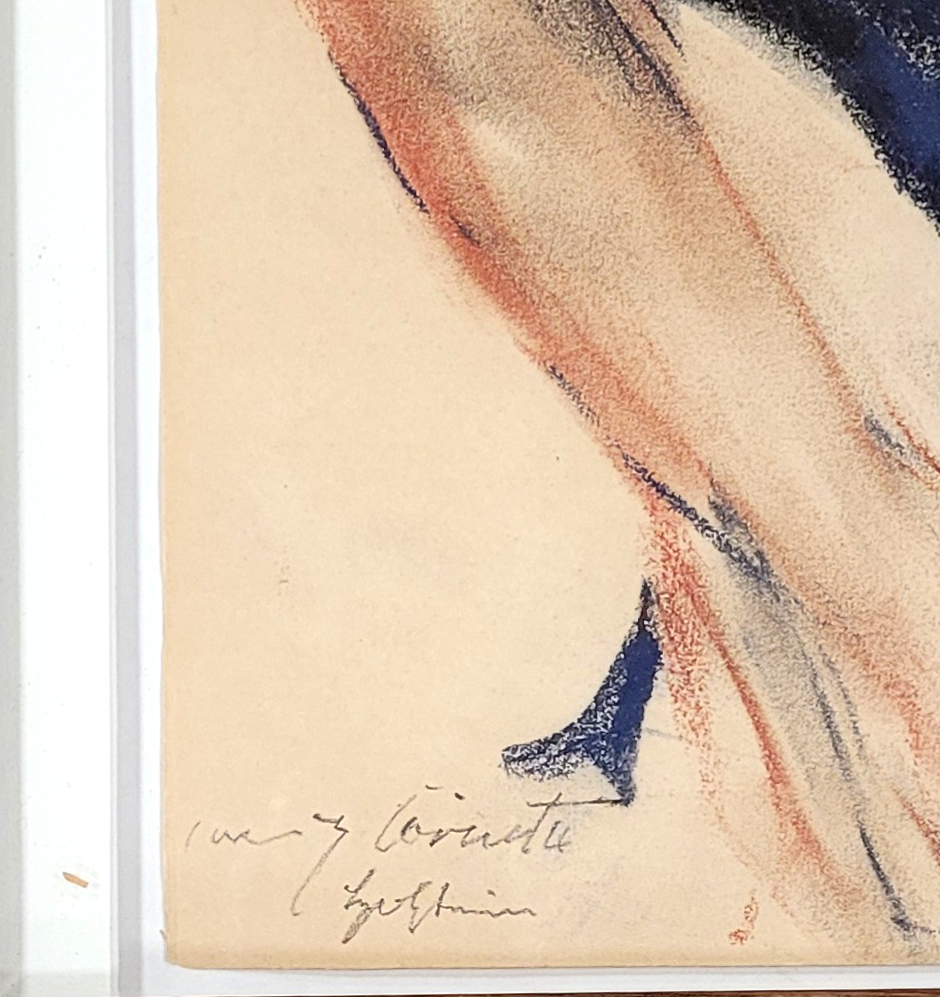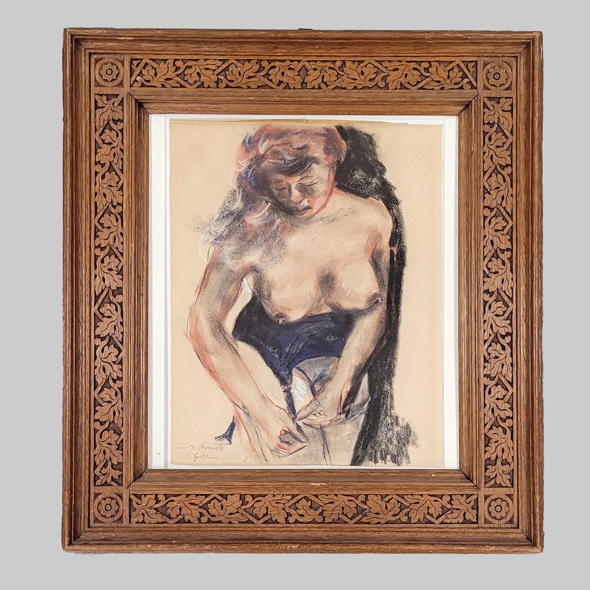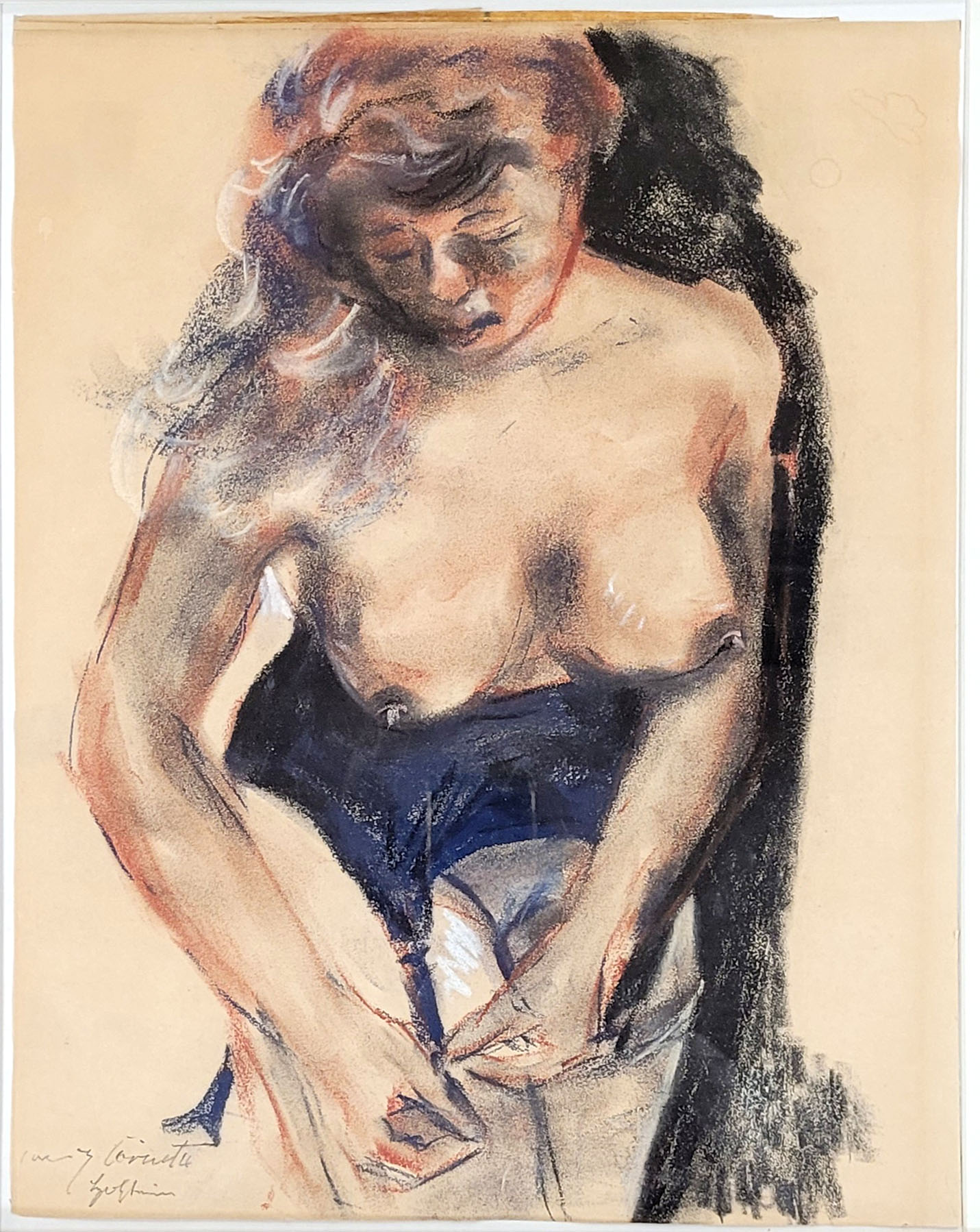 Pastell auf Papier, signiert und bezeichnet unten links, 44 x 34,5 cm, gerahmt unter Glas (eine naturwissenschaftliche Untersuchung zum Malmaterial und zum maltechnischen Aufbau von Prof. Dr. E. Jägers und Dr. E. Jägers, Bornheim, vom 5.9.2012 liegt bei. Alle verwendeten Malmaterialien sind aus der Zeit Lovis Corinths bekannt und weit verbreitet gewesen. Zu der Signatur heißt es „…homogen und in einem Zug ausgeführt“. Das hier vorliegende Pastell dürfte um 1905-1910 entstanden sein. In dieser Zeit beschäftigte sich Corinth öfter mit vergleichbaren Sujets, sowohl bei Leinwandgemälden als auch Zeichnungen siehe z.B. die Gemälde Matinée, 1905, Öl/Lwd, Saarlandmuseum, Saarbrücken Halbakt einer jungen Frau, um 1907, Öl/Lwd, Karl&Faber, Auktion 238, Lot 415)