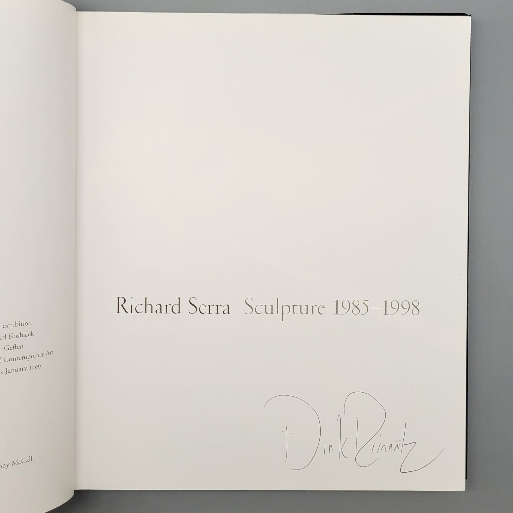 Ausstellungskatalog Museum of Contemporary Art, Los Angeles, 20 September 1998 – 3 January 1999, Göttingen (Steidl) 1998, Vorsatzblatt mit Widmung und Signatur von R. Serra, Titelblatt mit Signatur des Photographen Dirk Reinartz