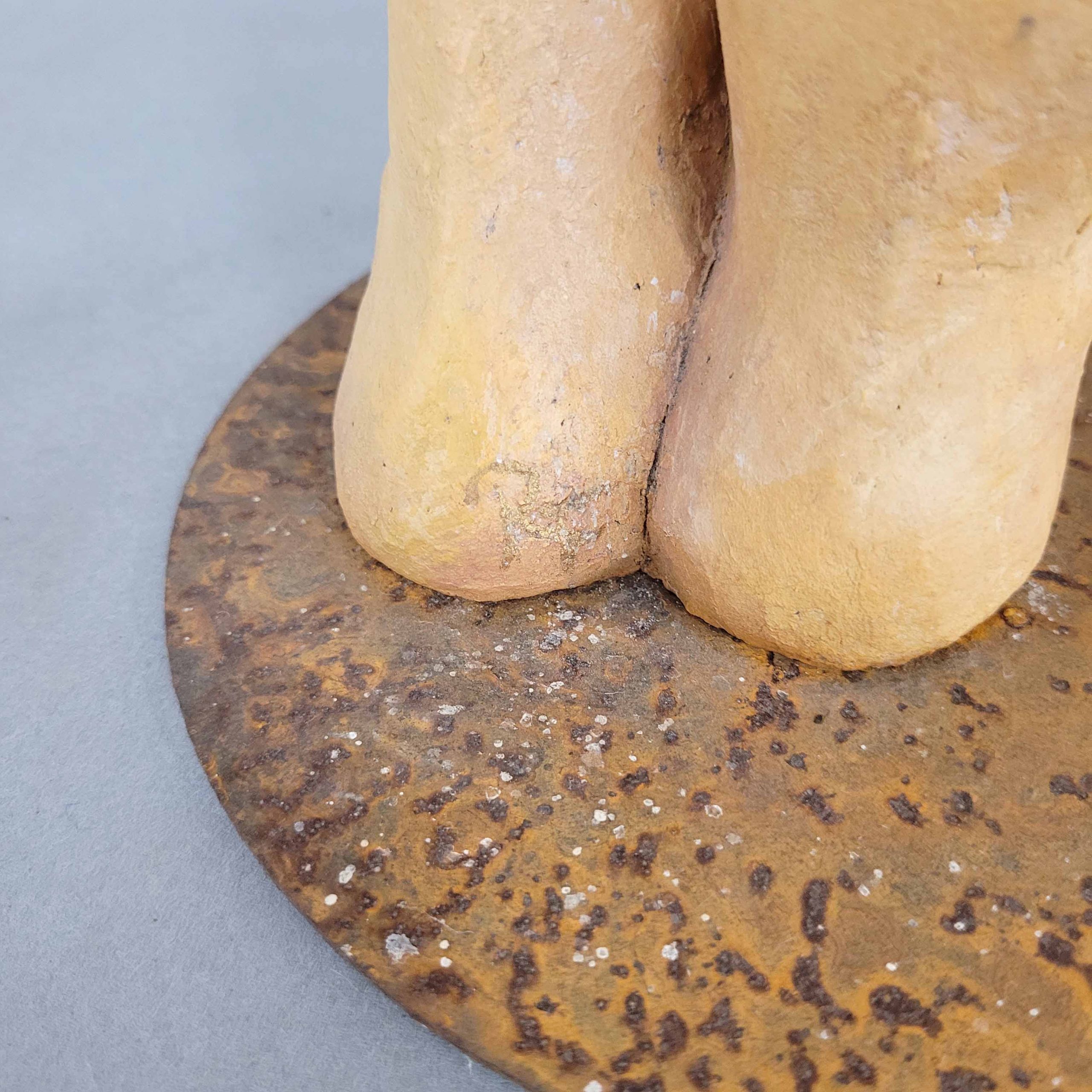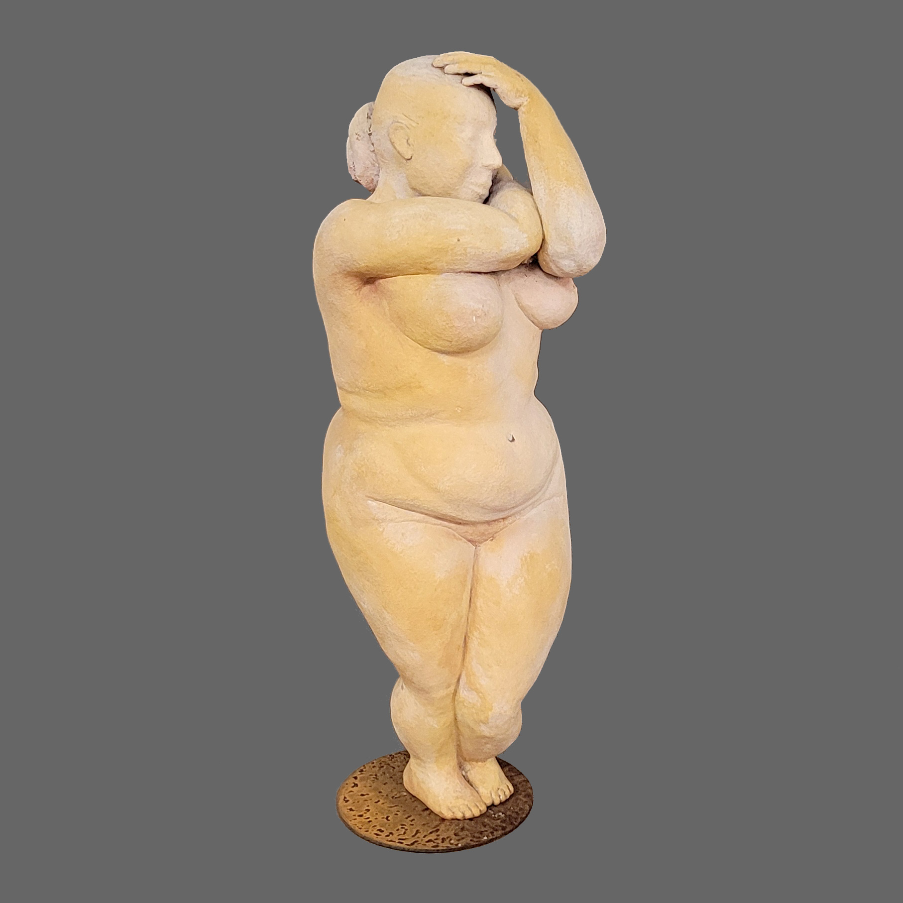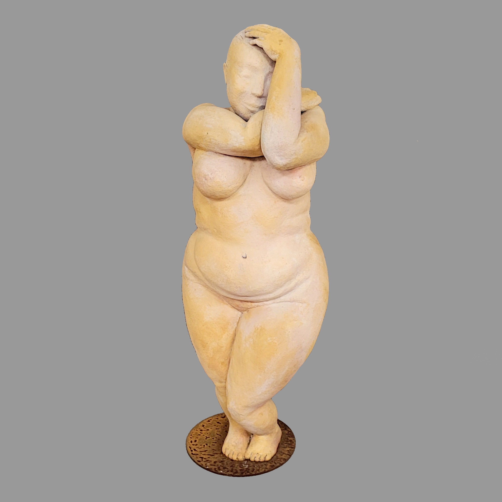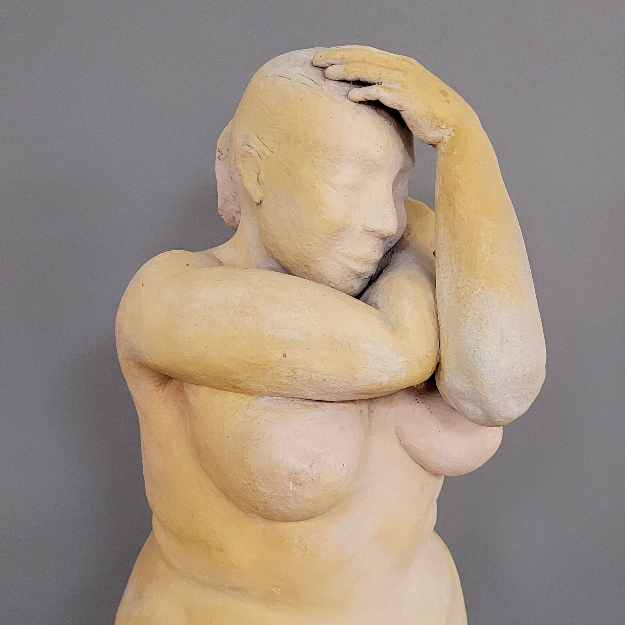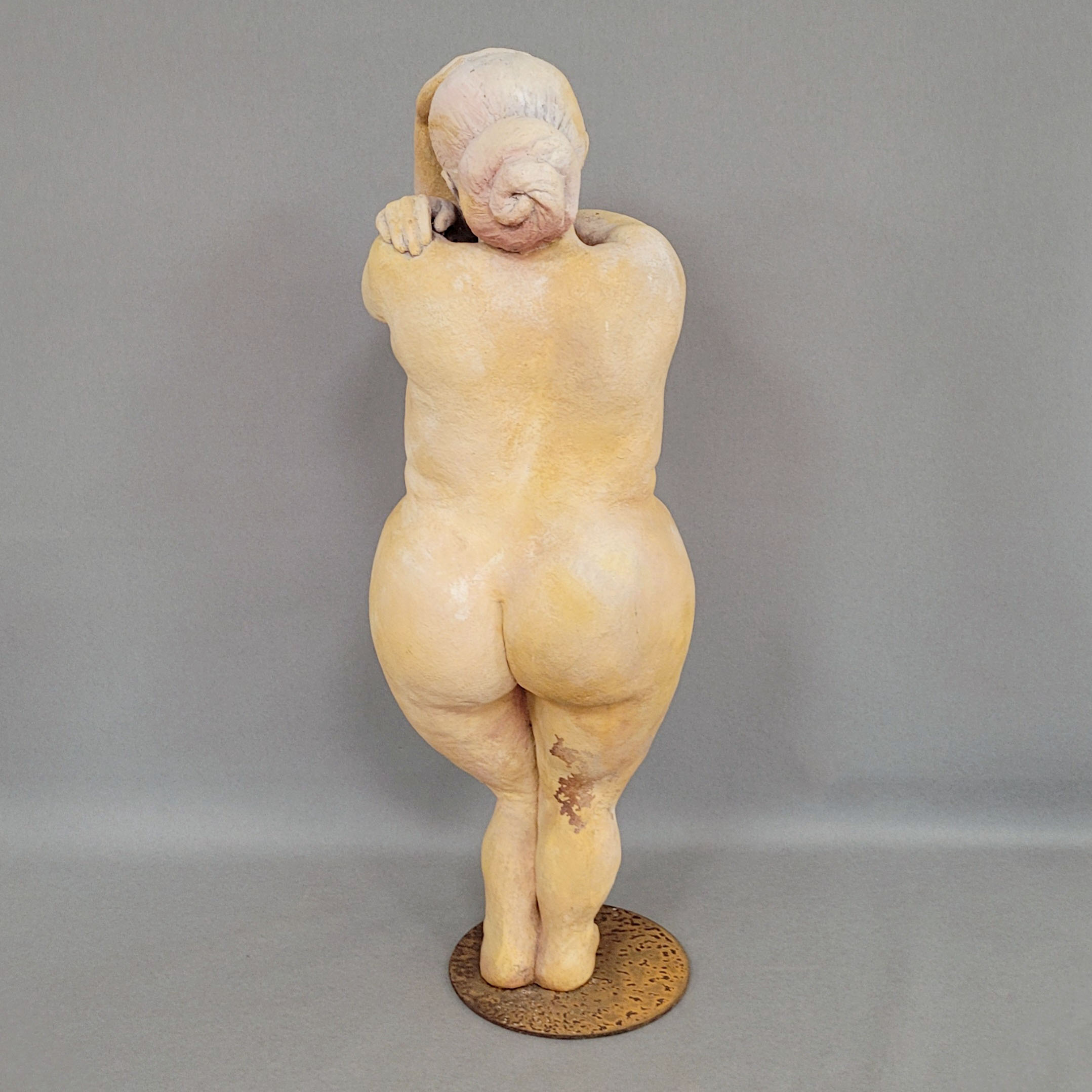 DEUTSCHER MEISTER (20. Jh.): Stehender weiblicher AktTerrakotta, farbig gefasst, Metallfuß, an der Ferse monogrammiert „PF“, Höhe 73,5 cm