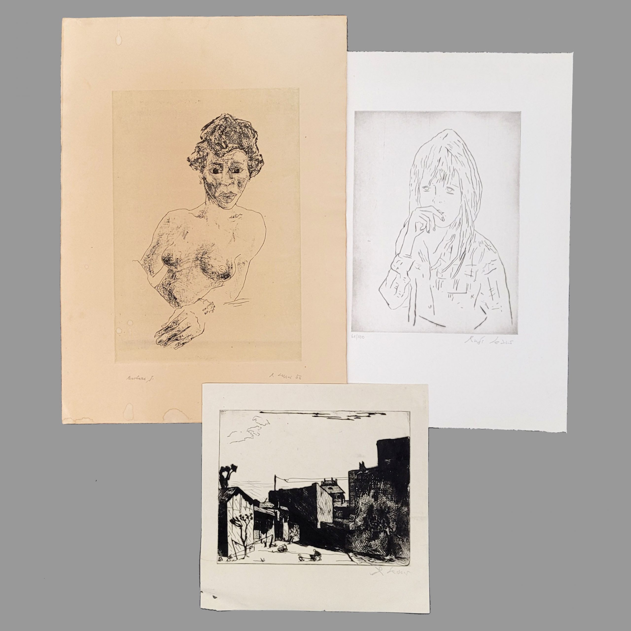 LESSER, Rudi (1901-1987): Barbasea / Straßenansicht / Nachdenkliches Mädchen3 Radierungen, signiert und datiert (19)58 (1x), betitelt (1x), nummeriert 61/100 (1x), bis zu 59 x 41 cm (Papierschäden, kleine Feuchtigkeitsflecken)