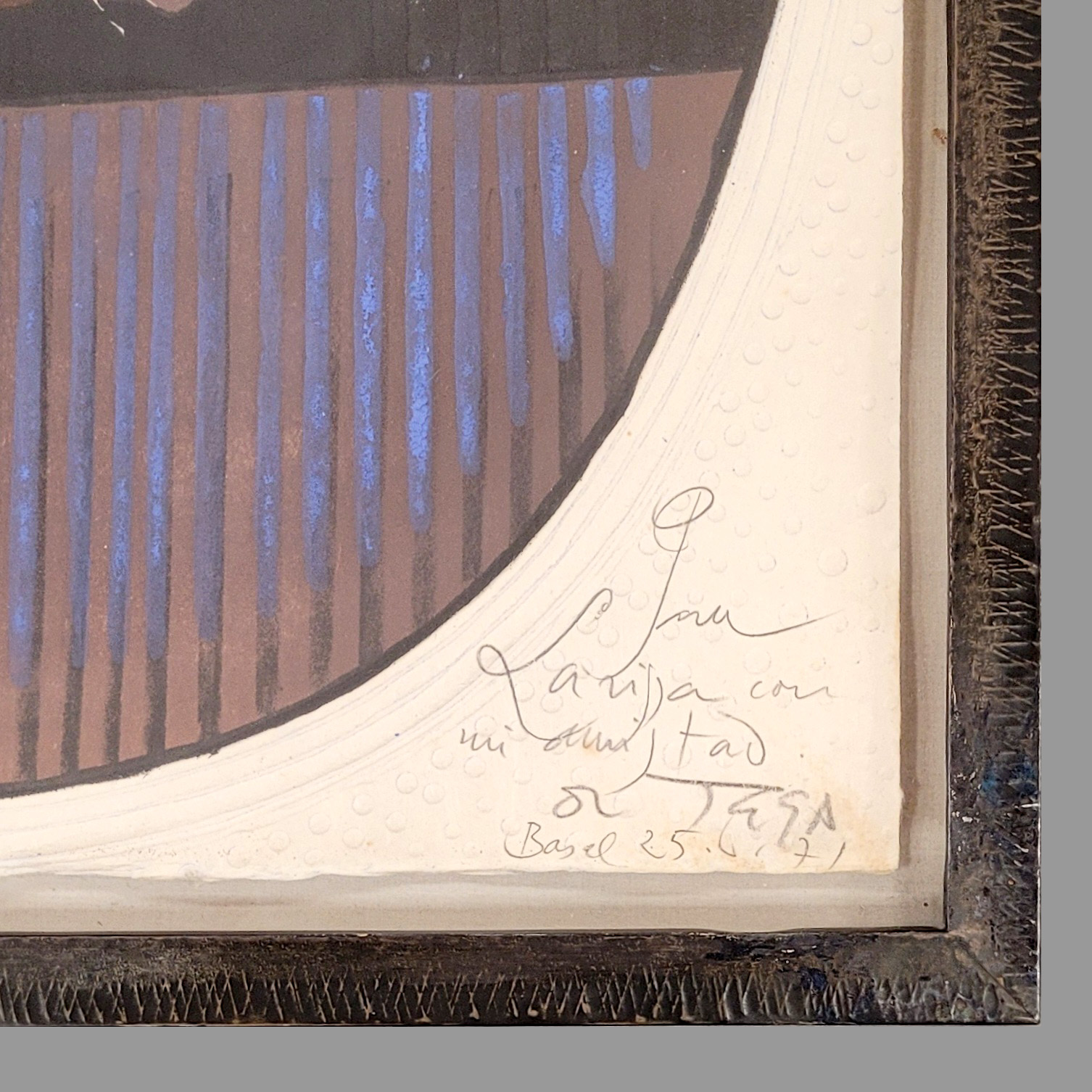 Prägedruck, handkoloriert, signiert mit Widmung unten rechts, datiert „25.6.71“, nummeriert XIX/XXX unten links, 56 x 63 cm, gerahmt unter Glas