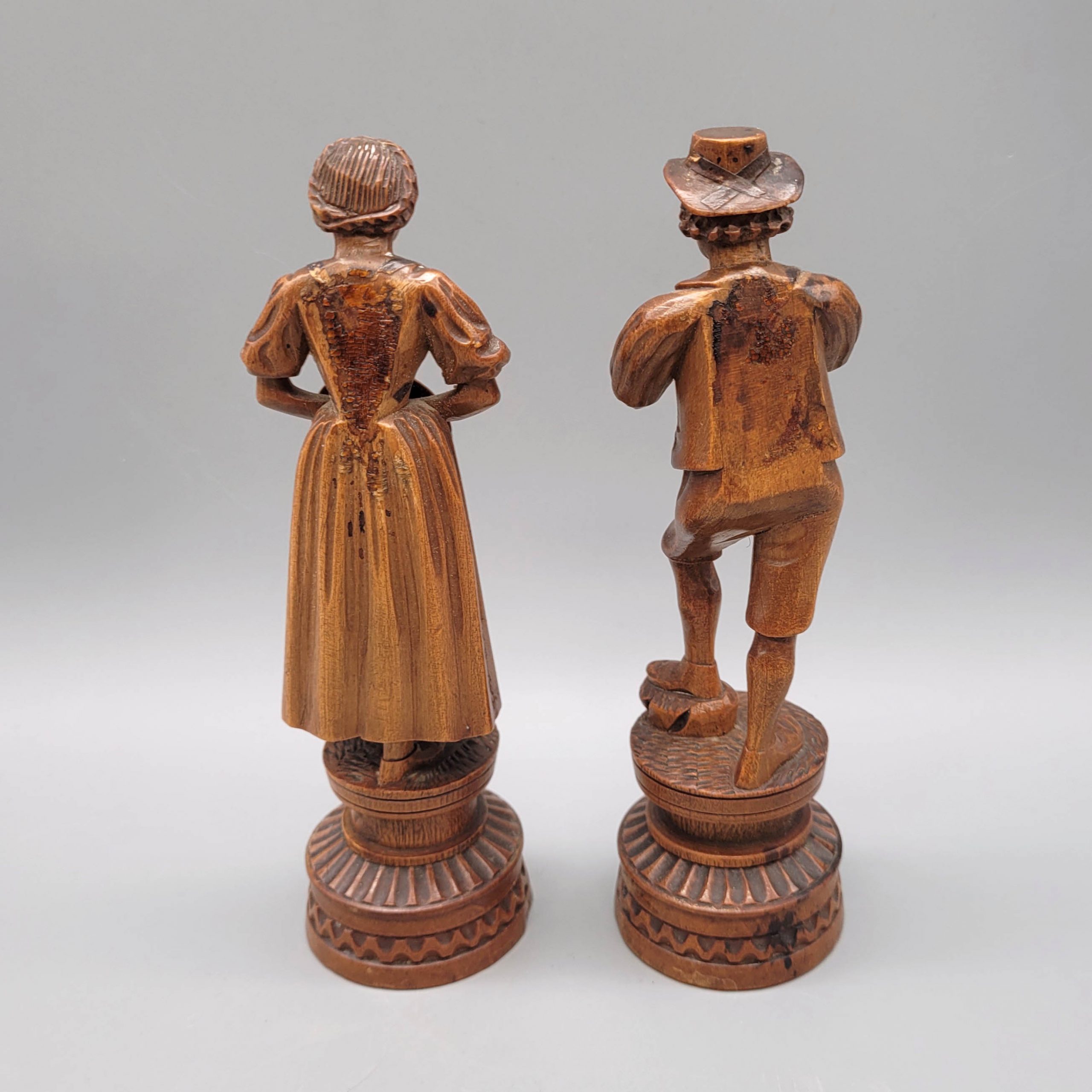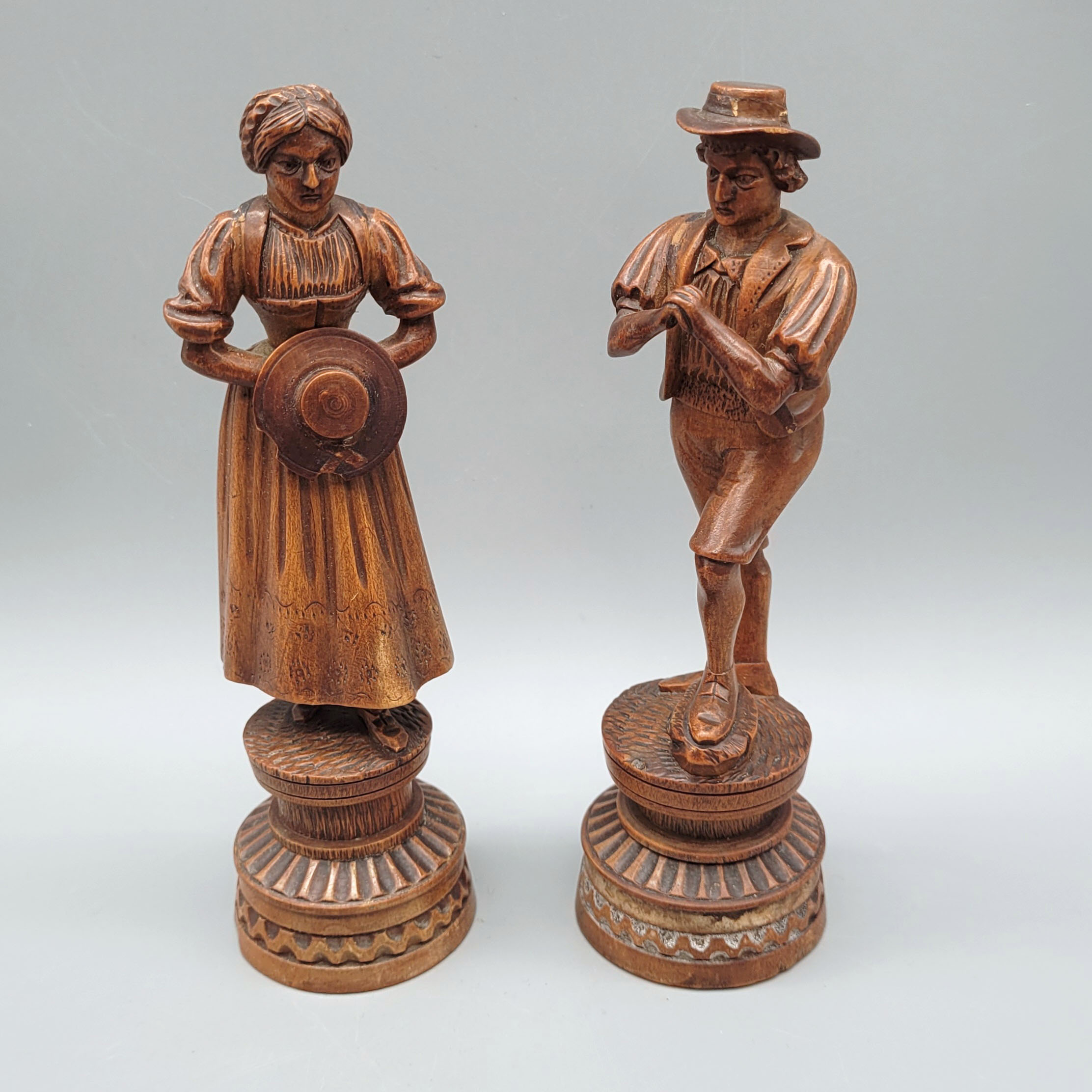 Bauer und BäuerinObstholz, vollrund geschnitzt, bodenseitig Etikett Maurice Bloch, Genf, um 1900, Höhe 16,5 cm (kleine Fehlstellen am Hut der Bäuerin)