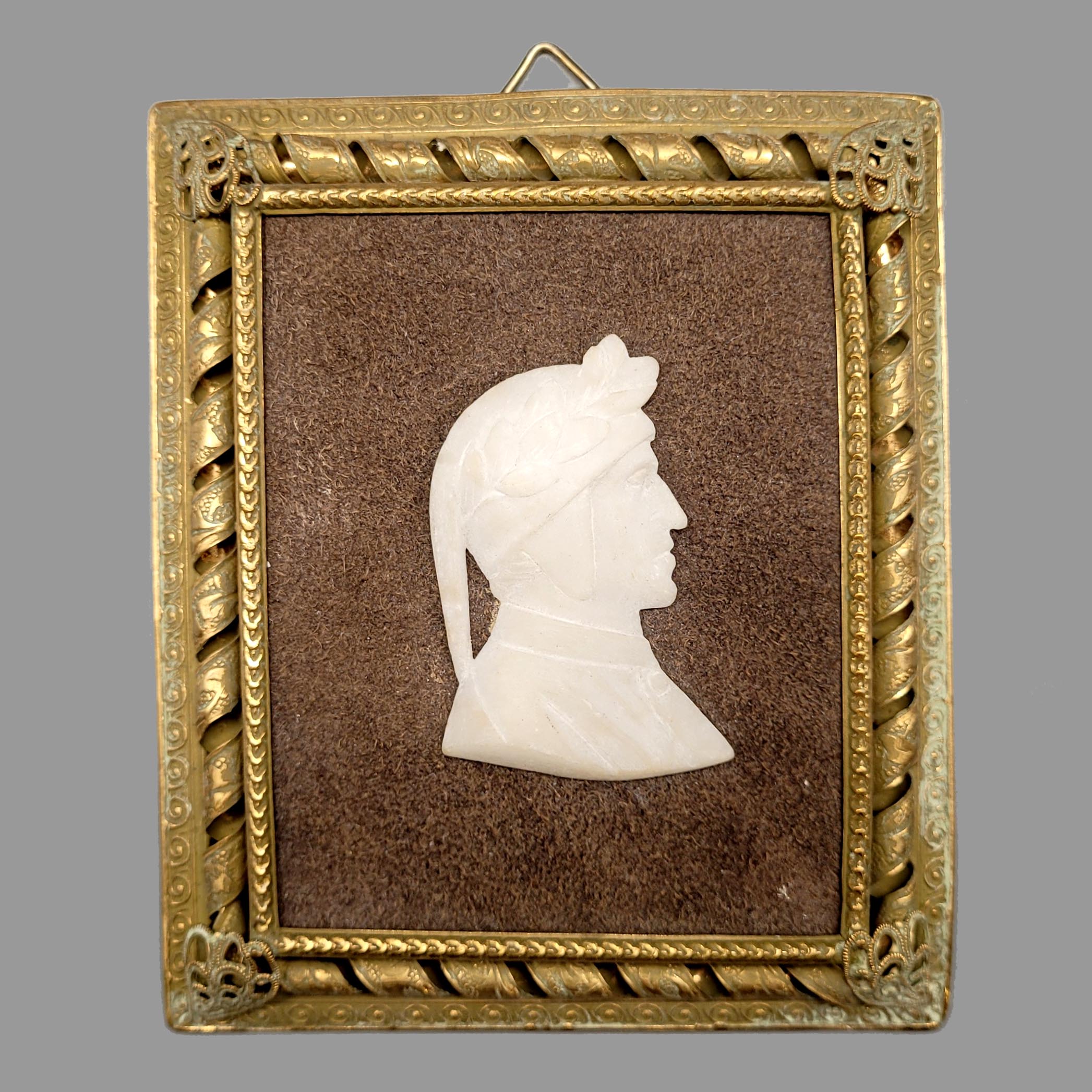 Brustporträt von DanteRelief, Alabaster geschnitten, montiert auf brauner Samt- Kartonunterlage, Messingrahmen, Italien 19. Jahrhundert, Gesamtgröße 11 x 9,3 cm