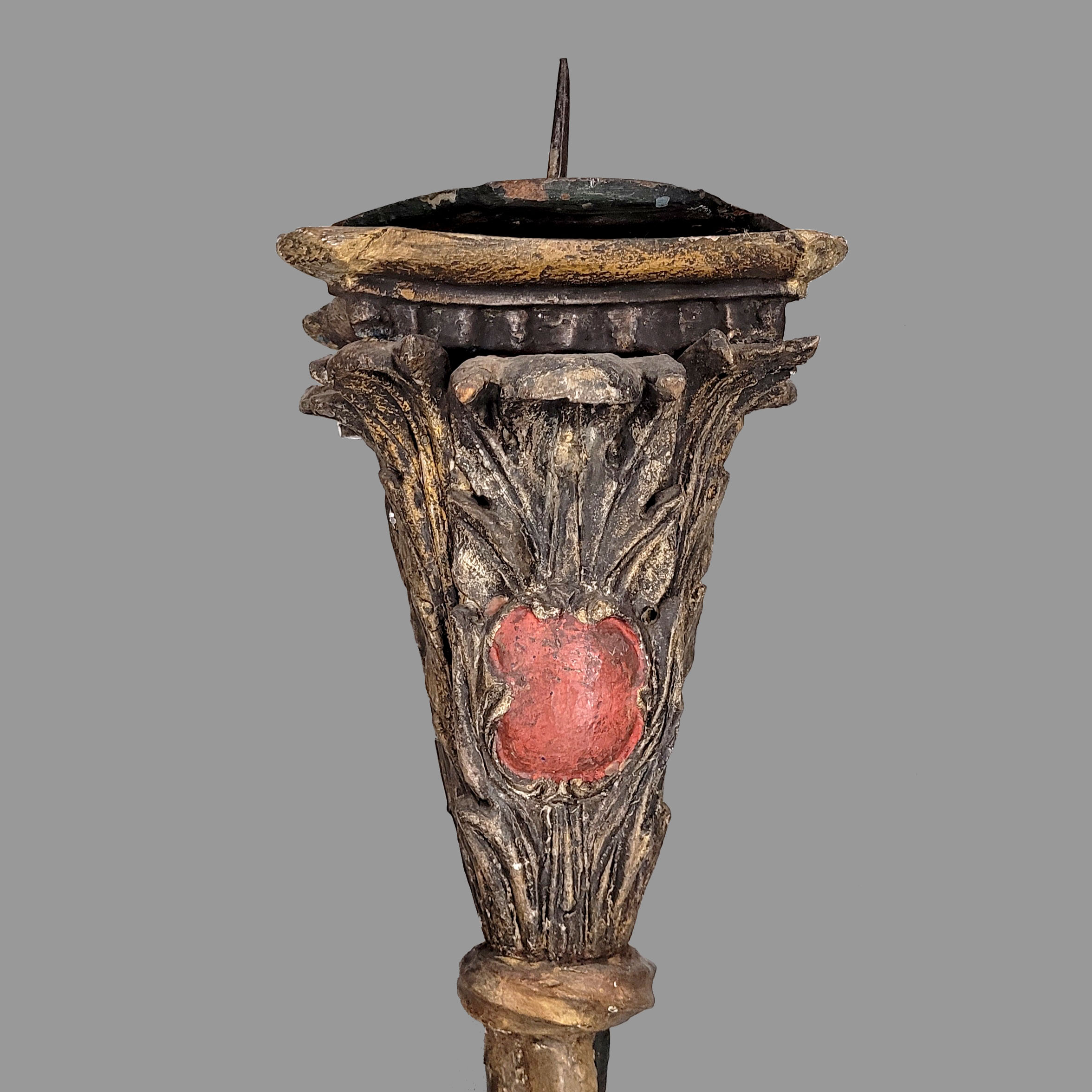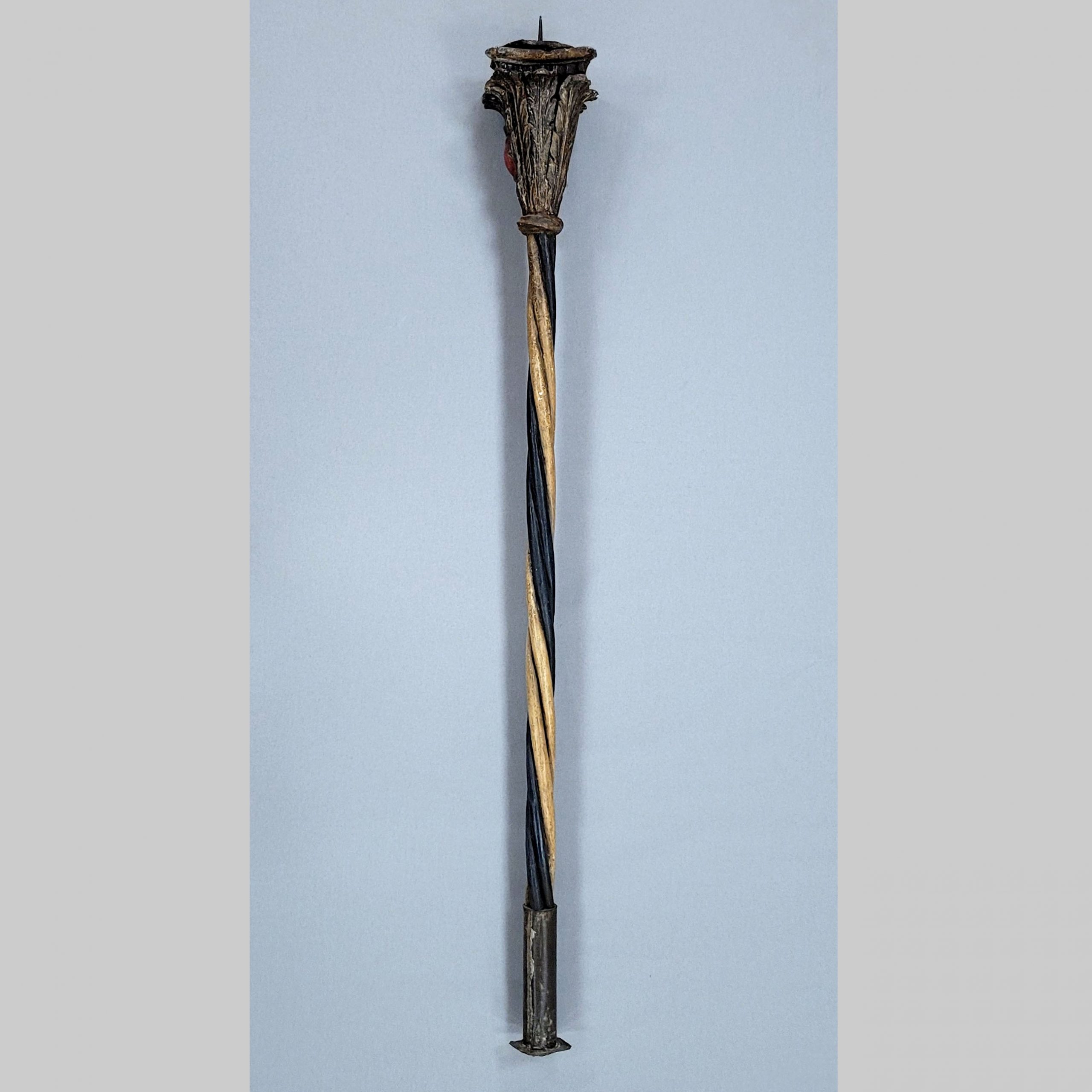 WandleuchterHolz, geschnitzt, farbig gefasst, gewundener Schaft, Dorn und Wachsschale Eisen, Venedig 17. Jahrhundert, Höhe 156 cm