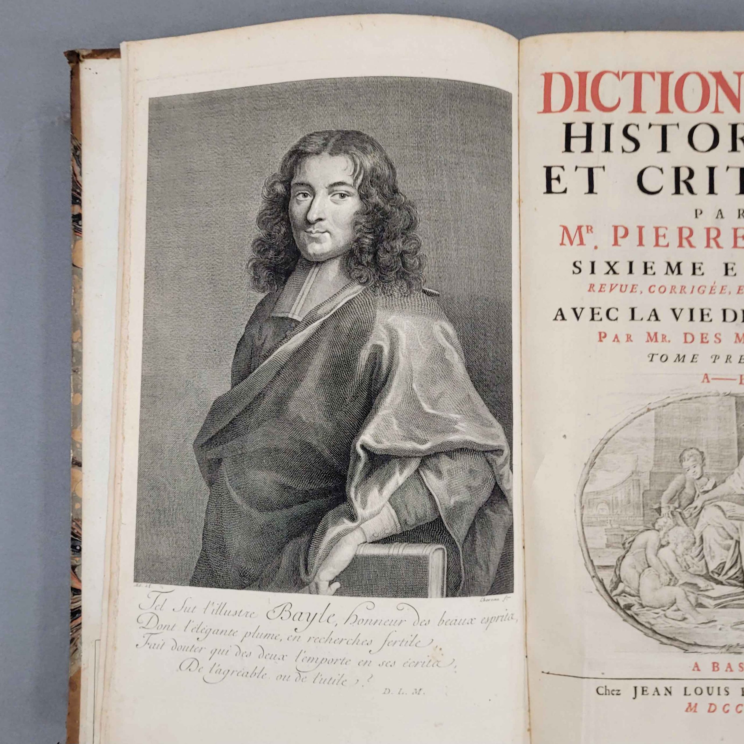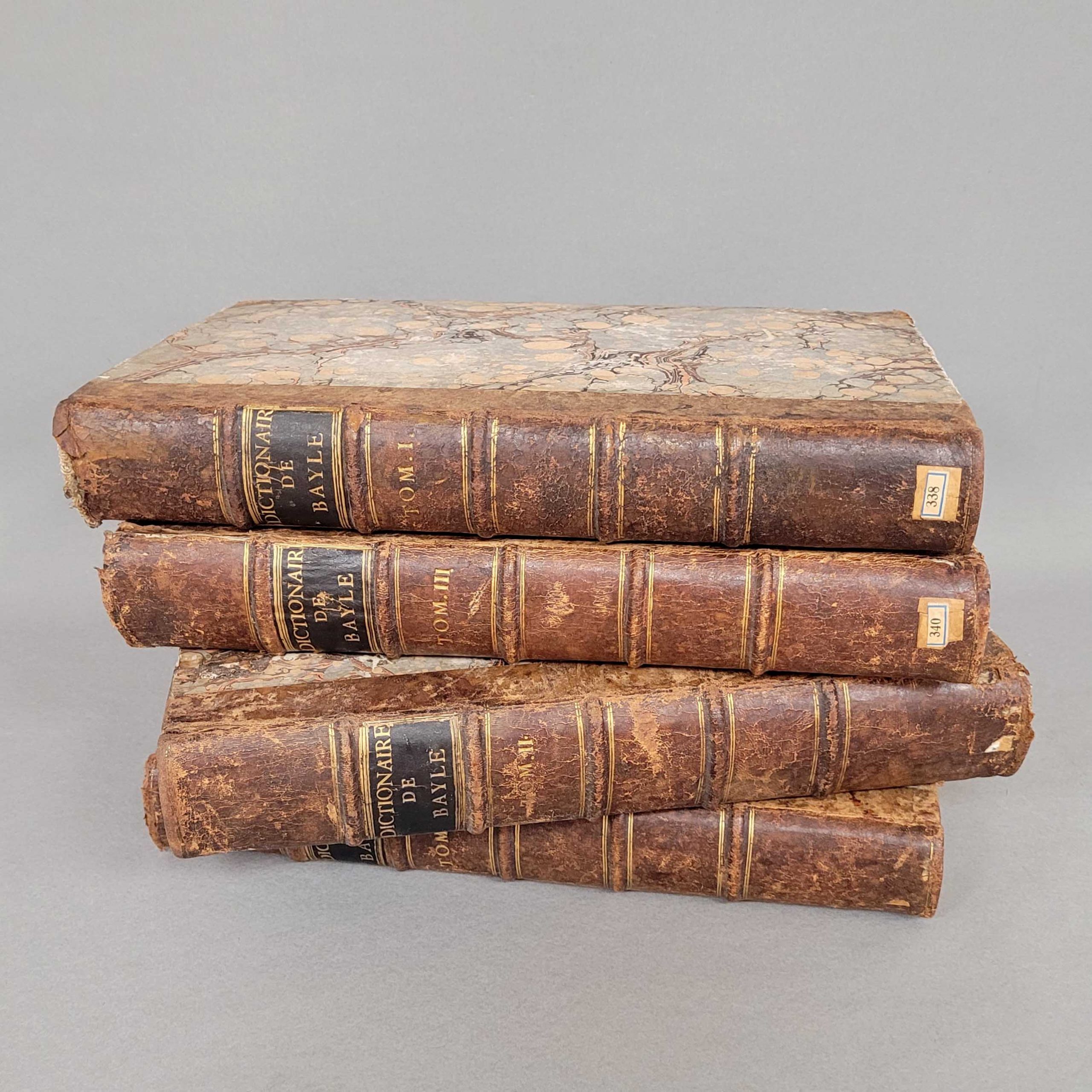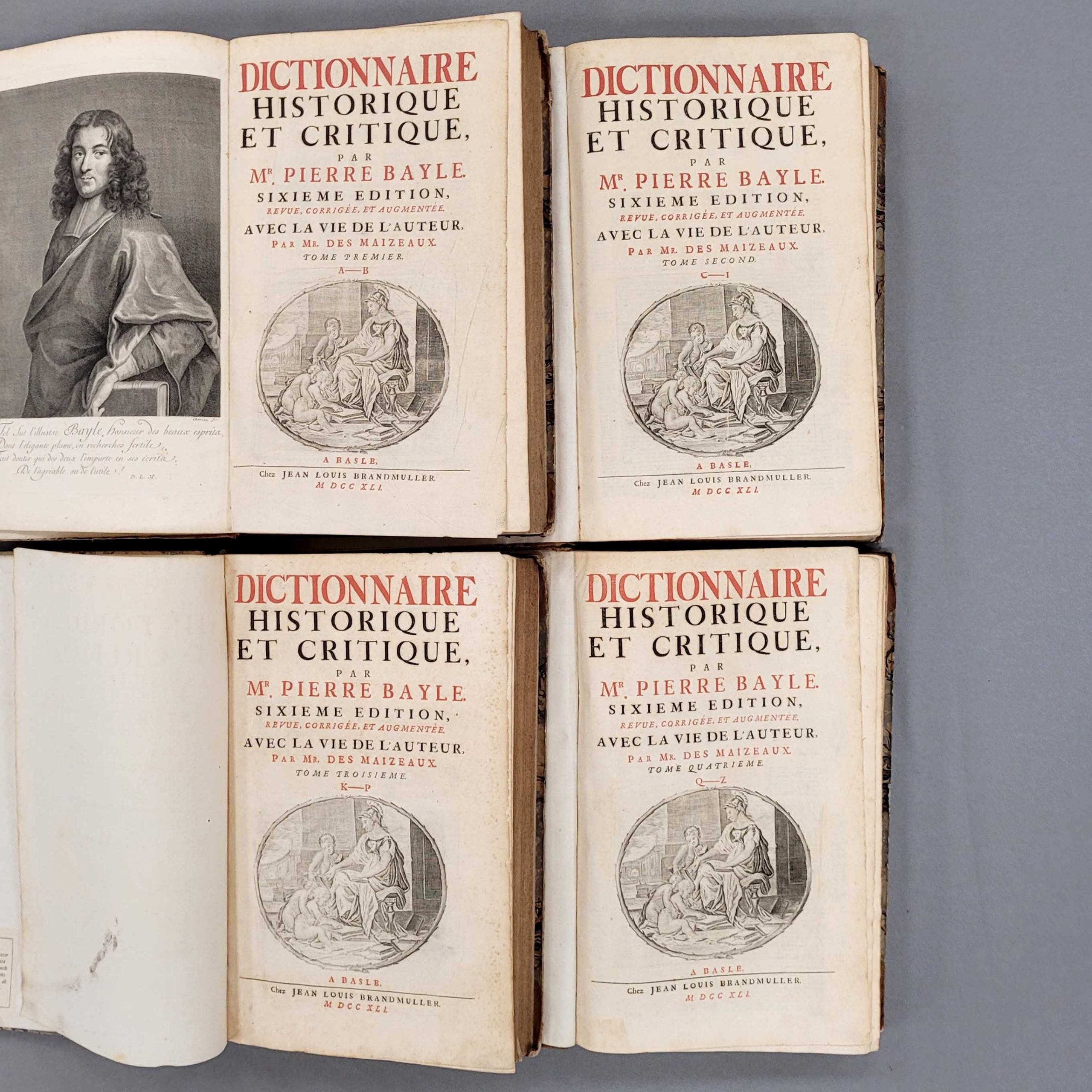 BAYLE, Pierre: Dictionnaire historique et critiqueTome I-IV, Basel (J.L. Brandmuller) 1741 (Halbledereinband der Zeit)Wir weisen darauf hin, dass das Buch nicht kollationiert ist.