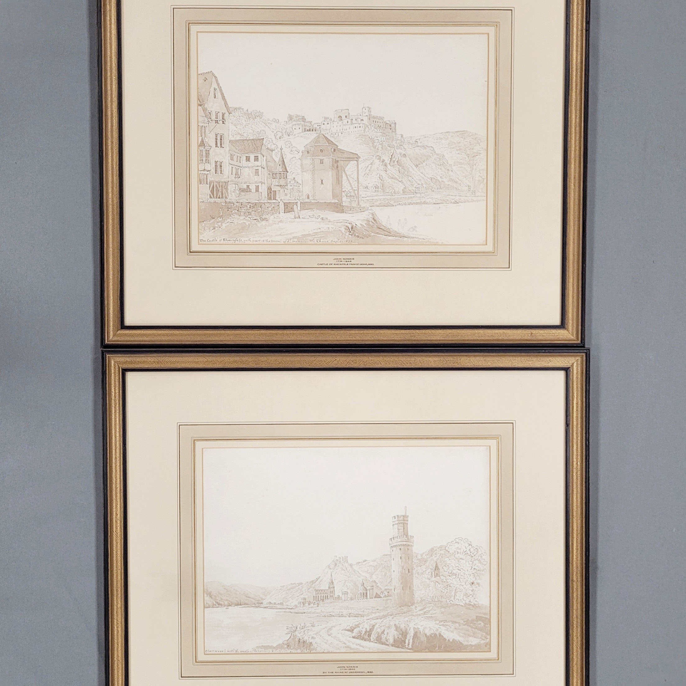 Feder, Tusche, laviert über Bleistift auf Papier, 2 Arbeiten aus dem Skizzenbuch der Rheinreise 1830, bezeichnet und datiert 4. bzw. 5. Sept. 1830, 26,5 x 36,5 cm, schön gerahmt unter Glas und Passepartout