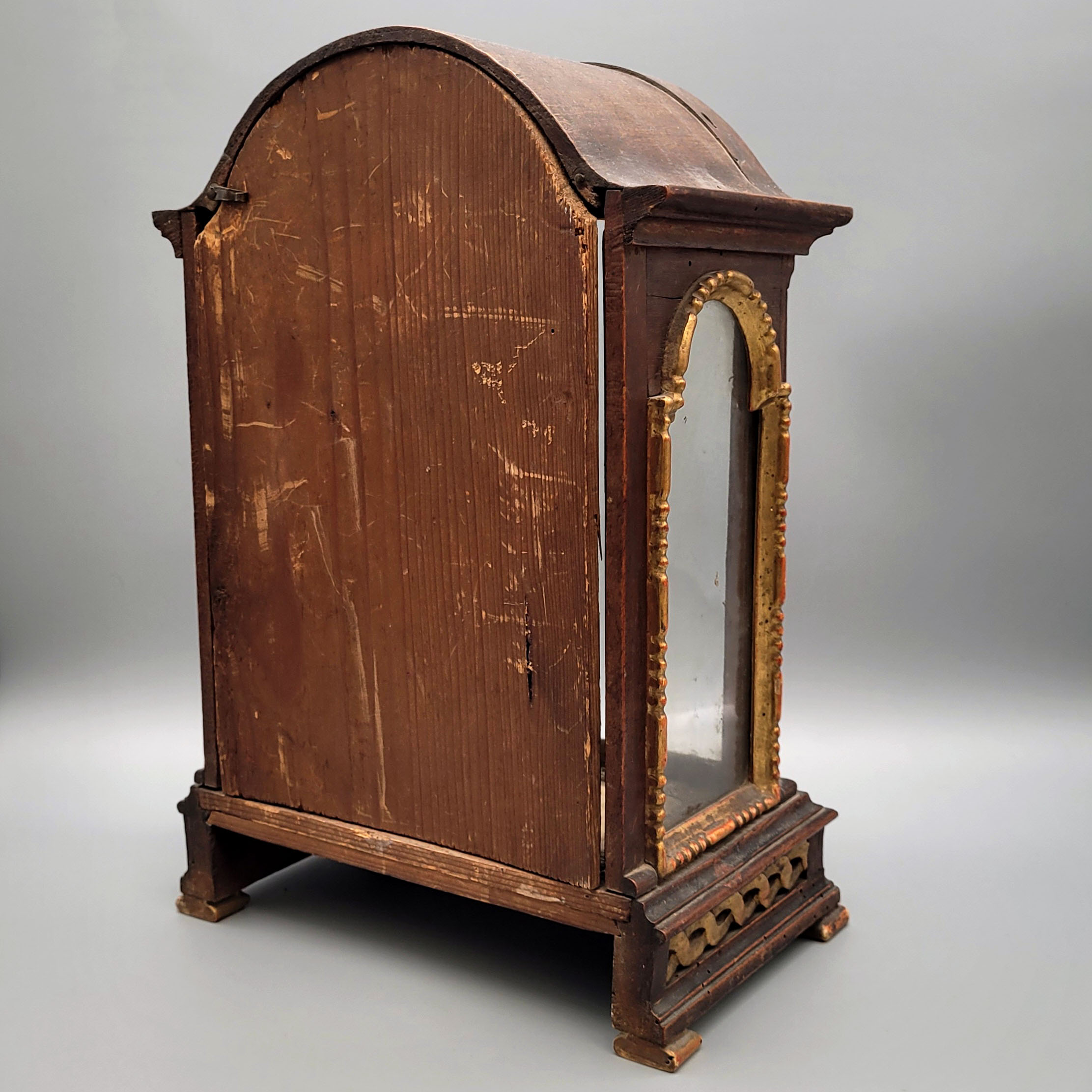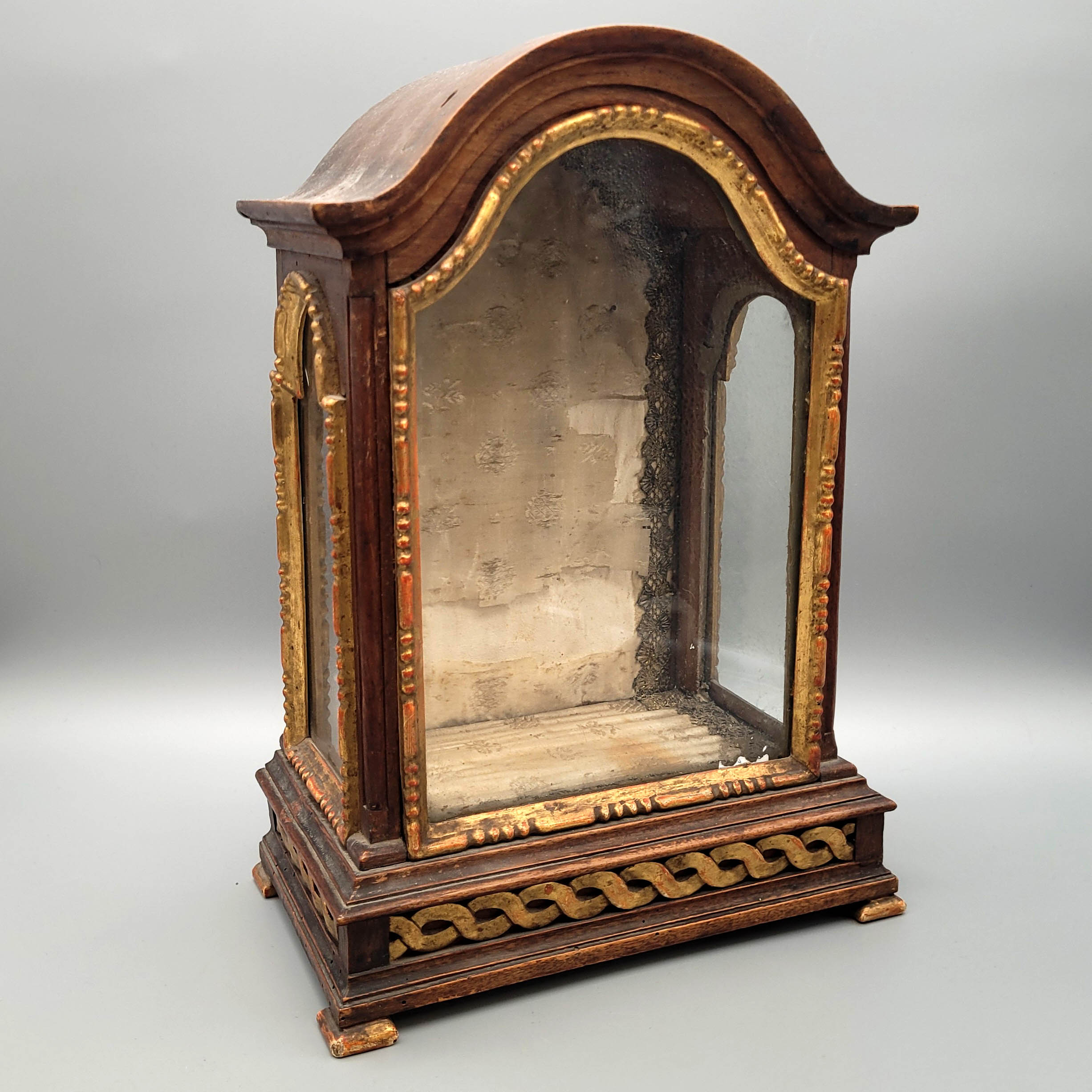 FigurenschreinHolz, geschnitzt, vergoldet, dreiseitig verglast (altes Glas), innen Stoffbezug, Süddeutsch 18. Jahrhundert, 33 x 23 x 13 cm