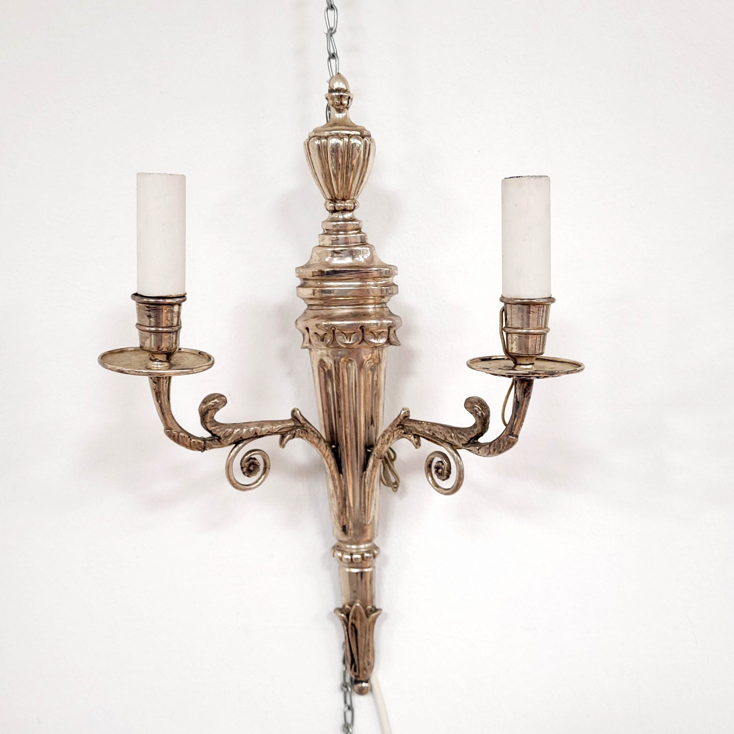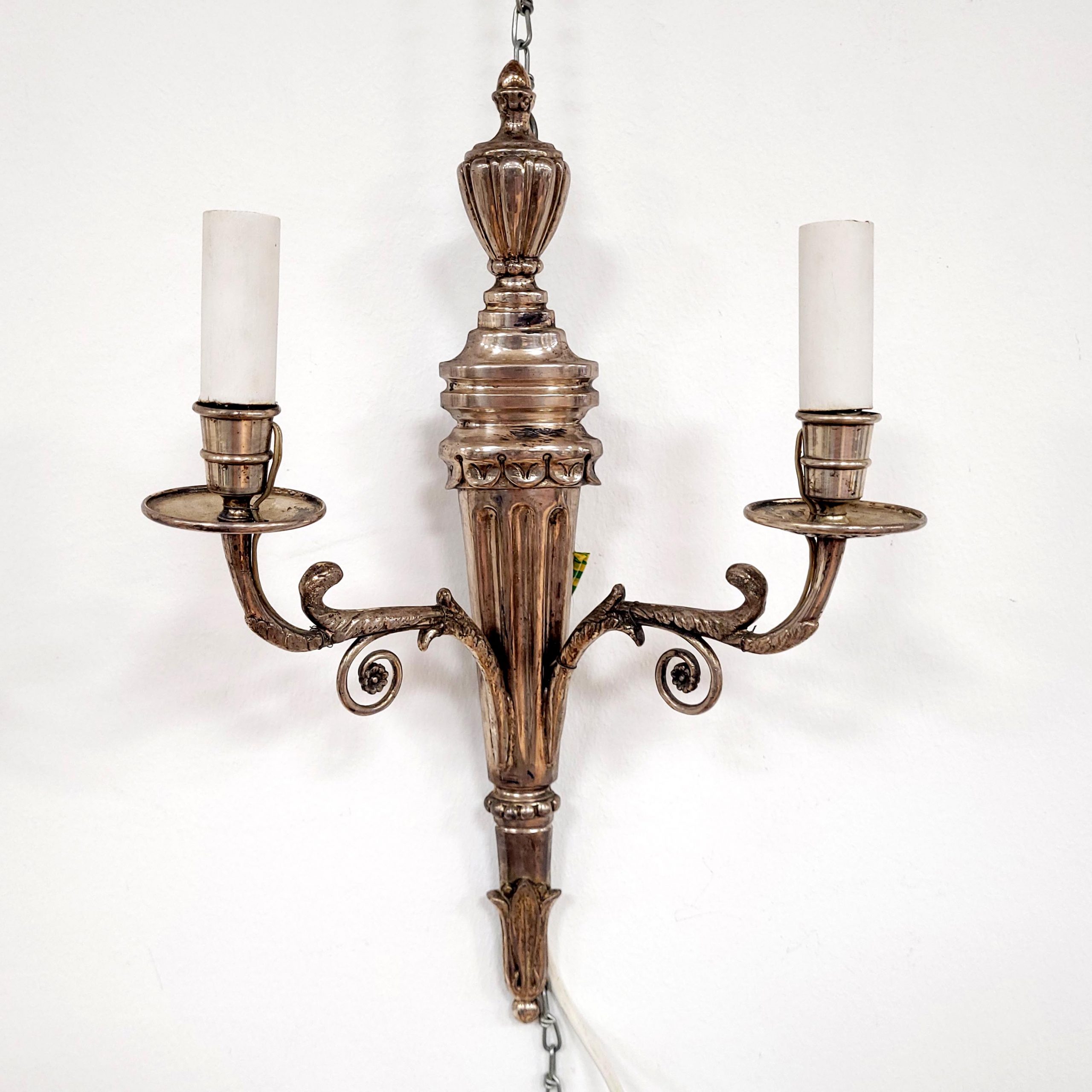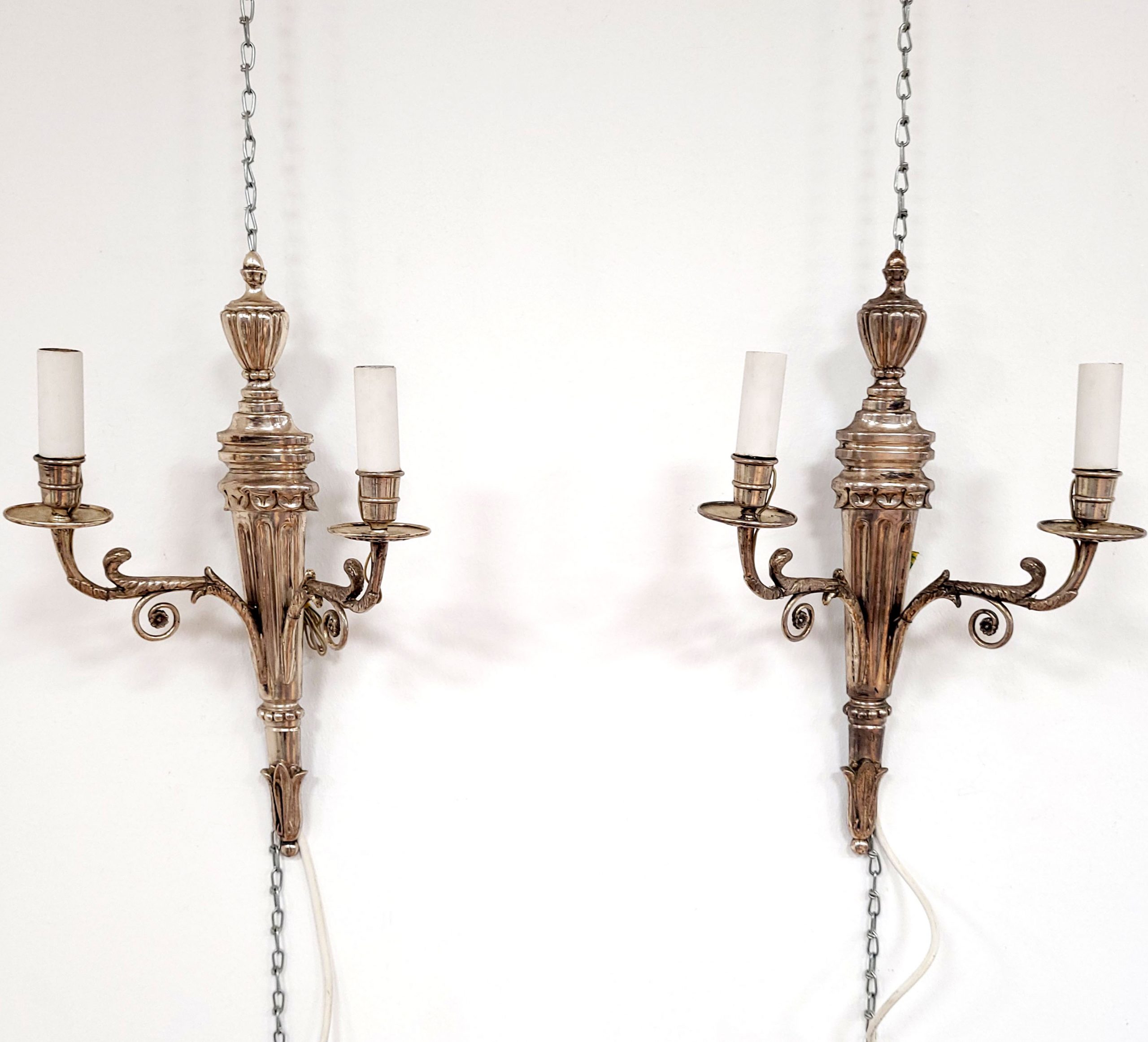 Paar zweiarmige WandleuchterBronze, versilbert, sekundär elektrifiziert, Frankreich 19. Jahrhundert, Höhe ca. 43 cm