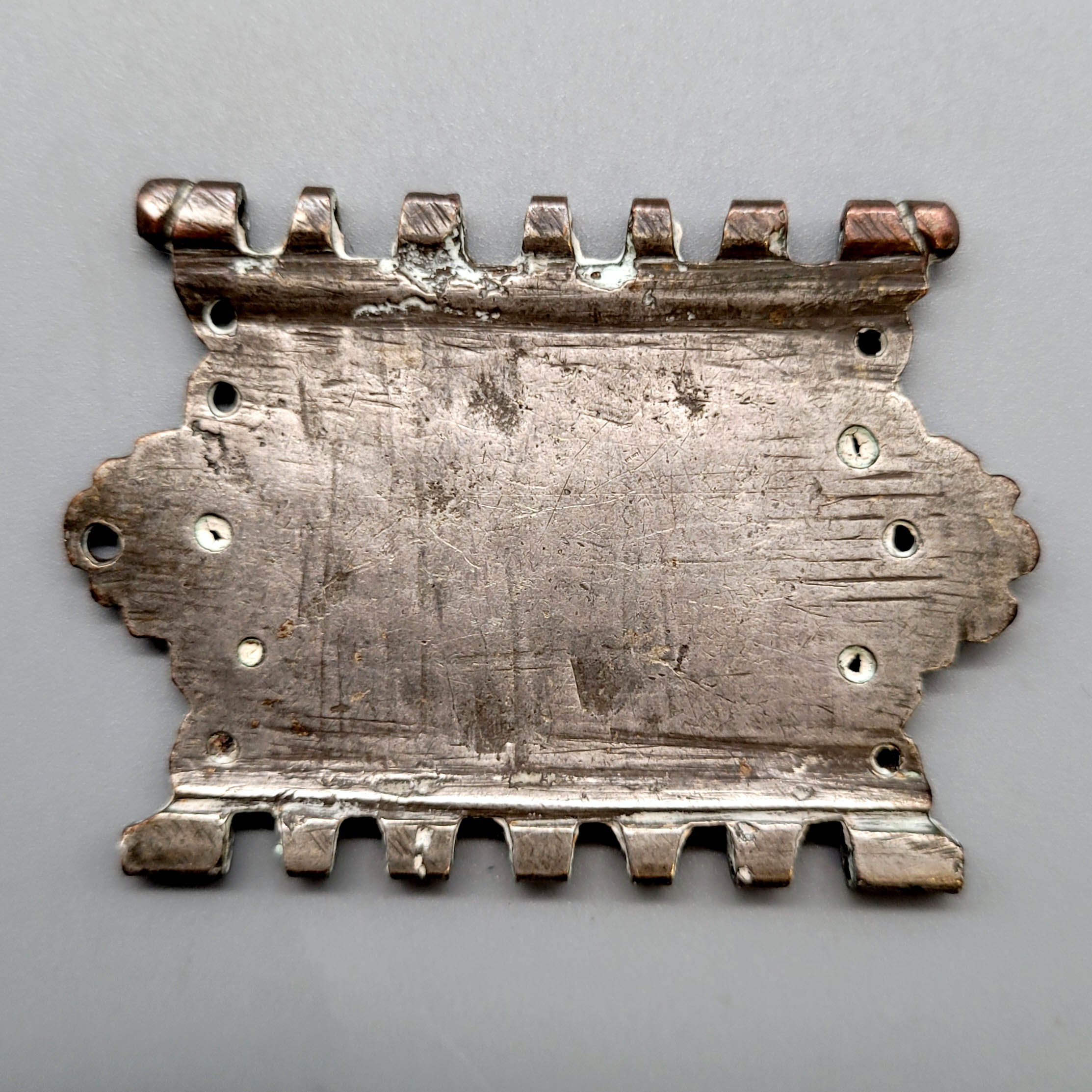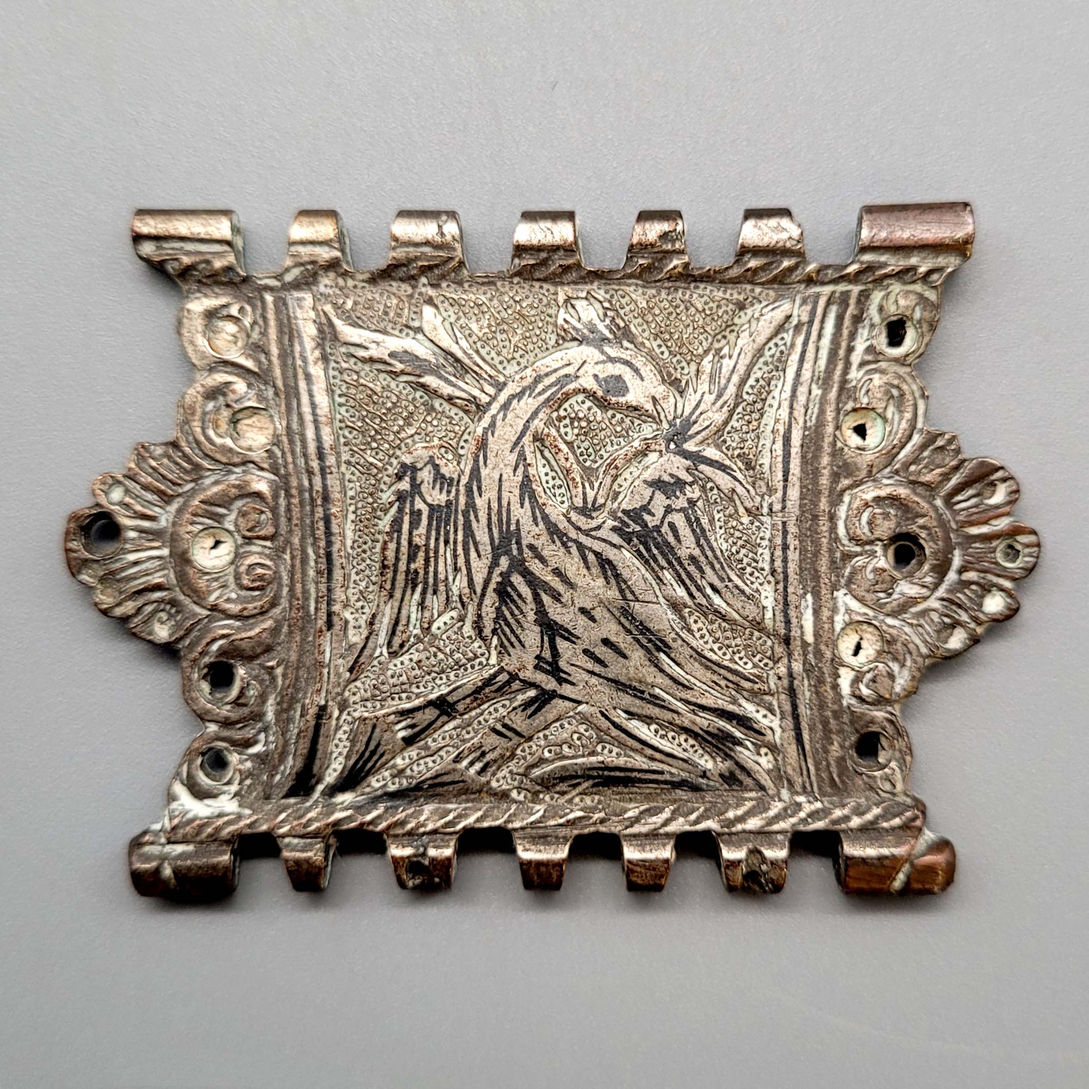 Beschlagkupferhaltige Bronze, versilbert, Reliefdekor eines Kranichs mit Niello-Technik, Italien 15./16. Jahrhundert, 4 x 5,5 cm