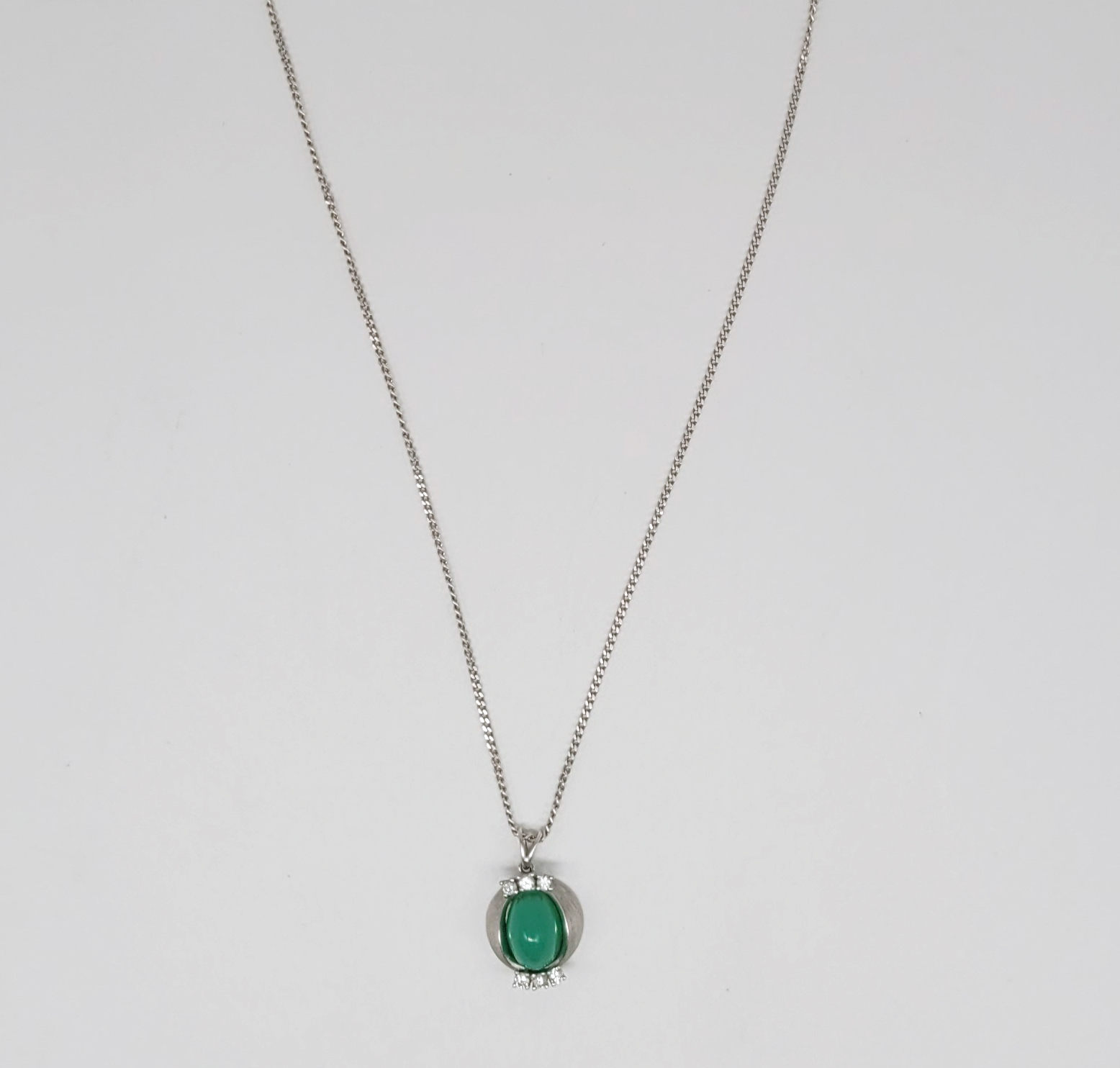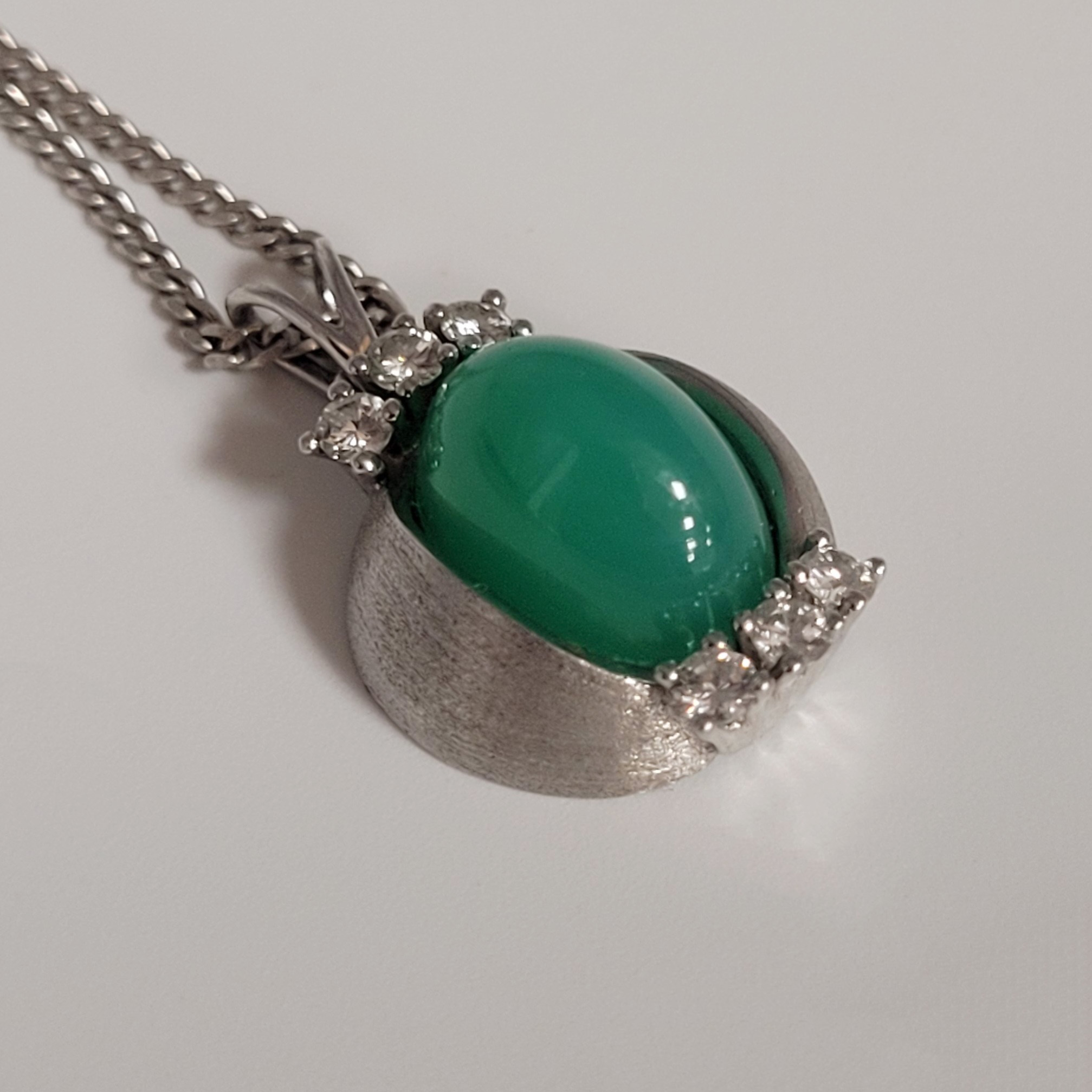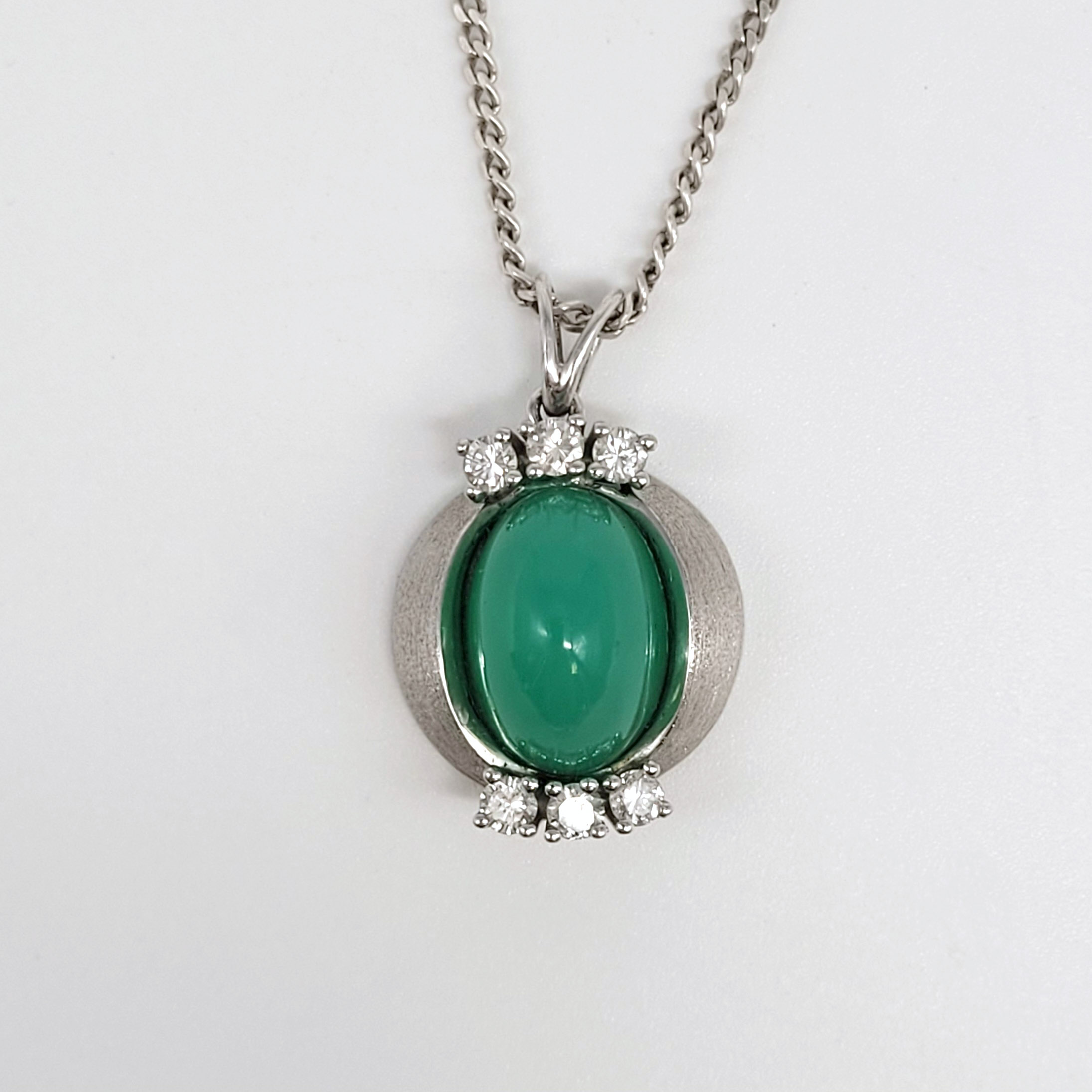 Anhänger mit Kette585er Weißgold, Chrysopas, 6 Brillanten (zusammen 0,42 ct), Kette 835er Silber (verknotet), Anhänger 2 x 1,5 cm, Kette Länge 22 (44) cm, Gewicht 9,5g