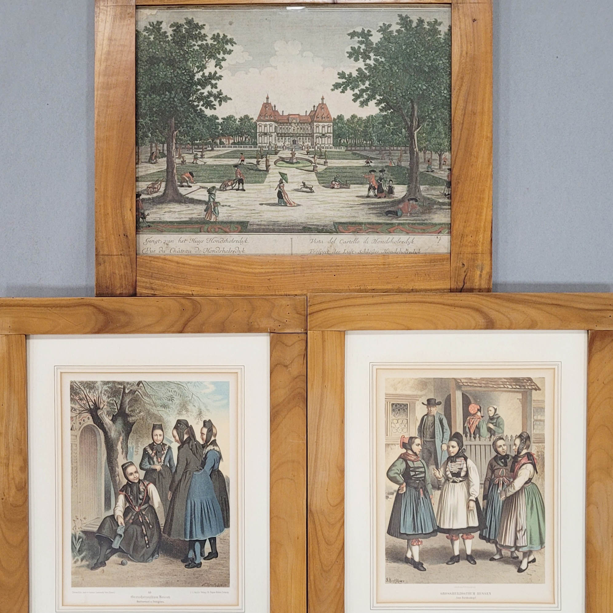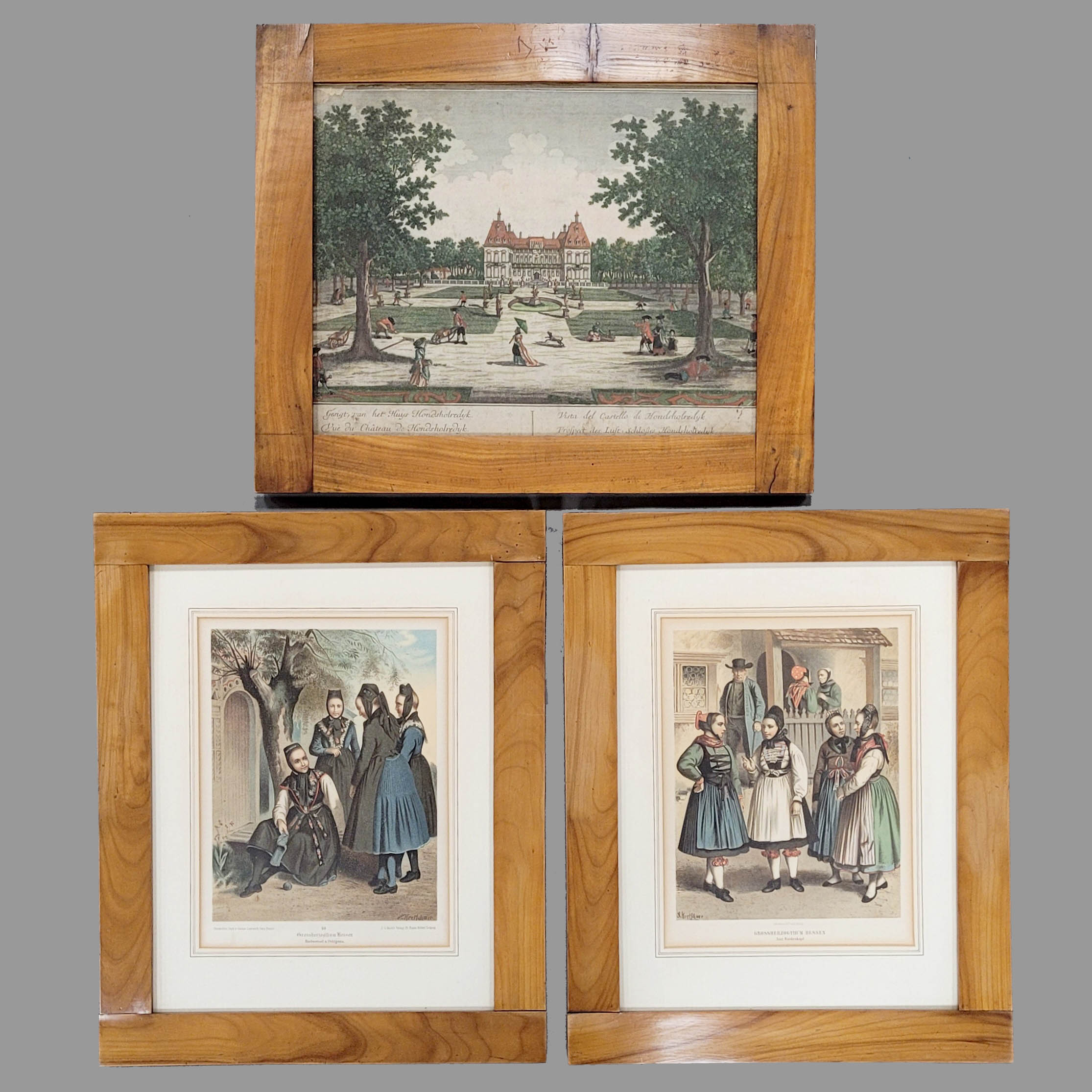 2 Chromolithographien, aus:Deutsche Volkstrachten (1877), 28,5 x 21,5 cm, gerahmt unter Glas und Passepartout beigelegt Guckkastenblatt „Prospect des Lust-Schloßes Hondsholredyk“, Kupferstich, altkoloriert, 30,5 x 38,5 cm, gerahmt unter Glas (alle drei Blätter in schönen Rahmen des 19. Jahrhunderts)