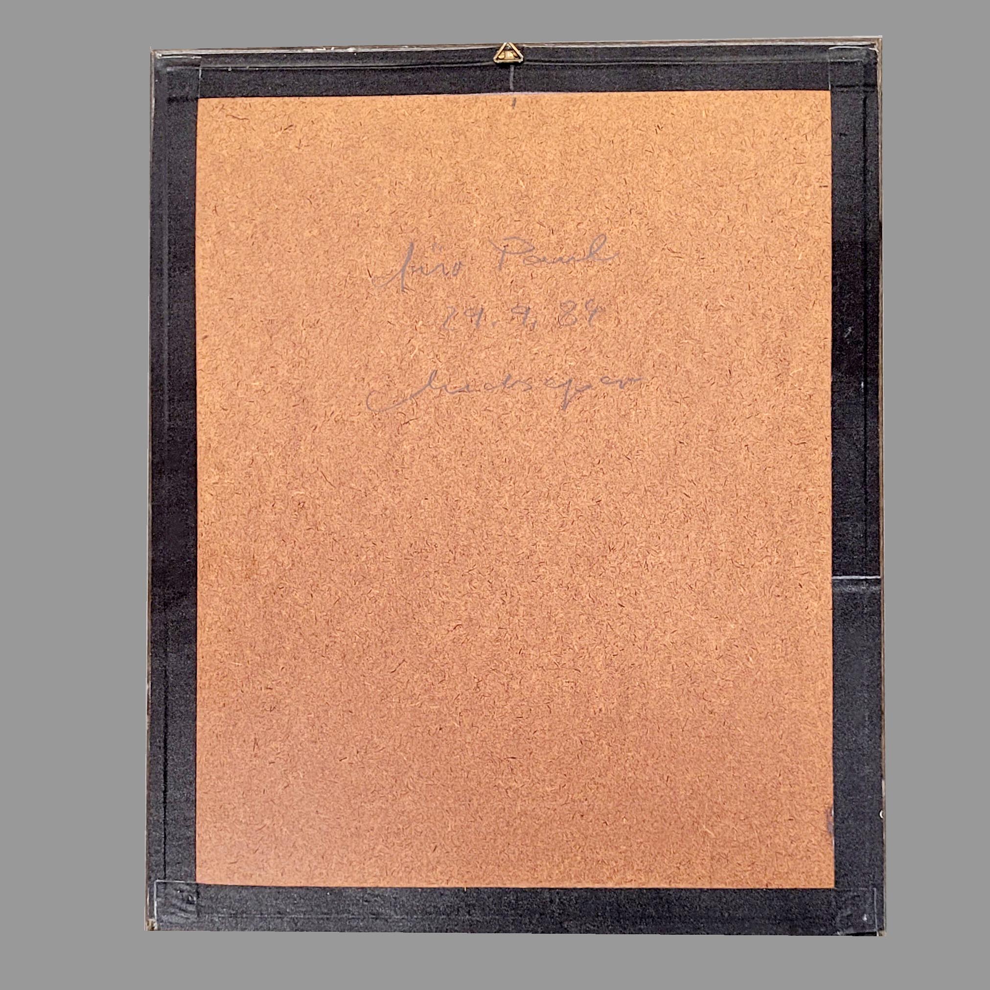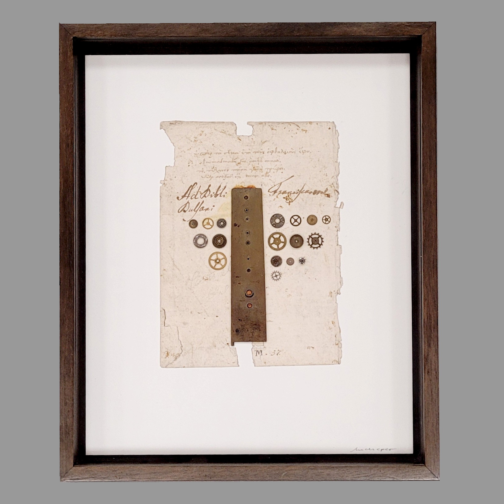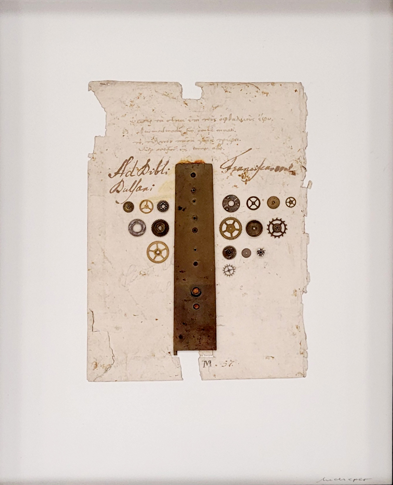 Collage aus alter Manuskriptseite mit griechischem Text auf Papier mit Zahnrädern etc., auf weiß gefasstem Holz montiert, signiert in Bleistift unten rechts, verso datiert mit Widmung „29.9.84“, ca 32 x 25,5 cm, Objektkasten