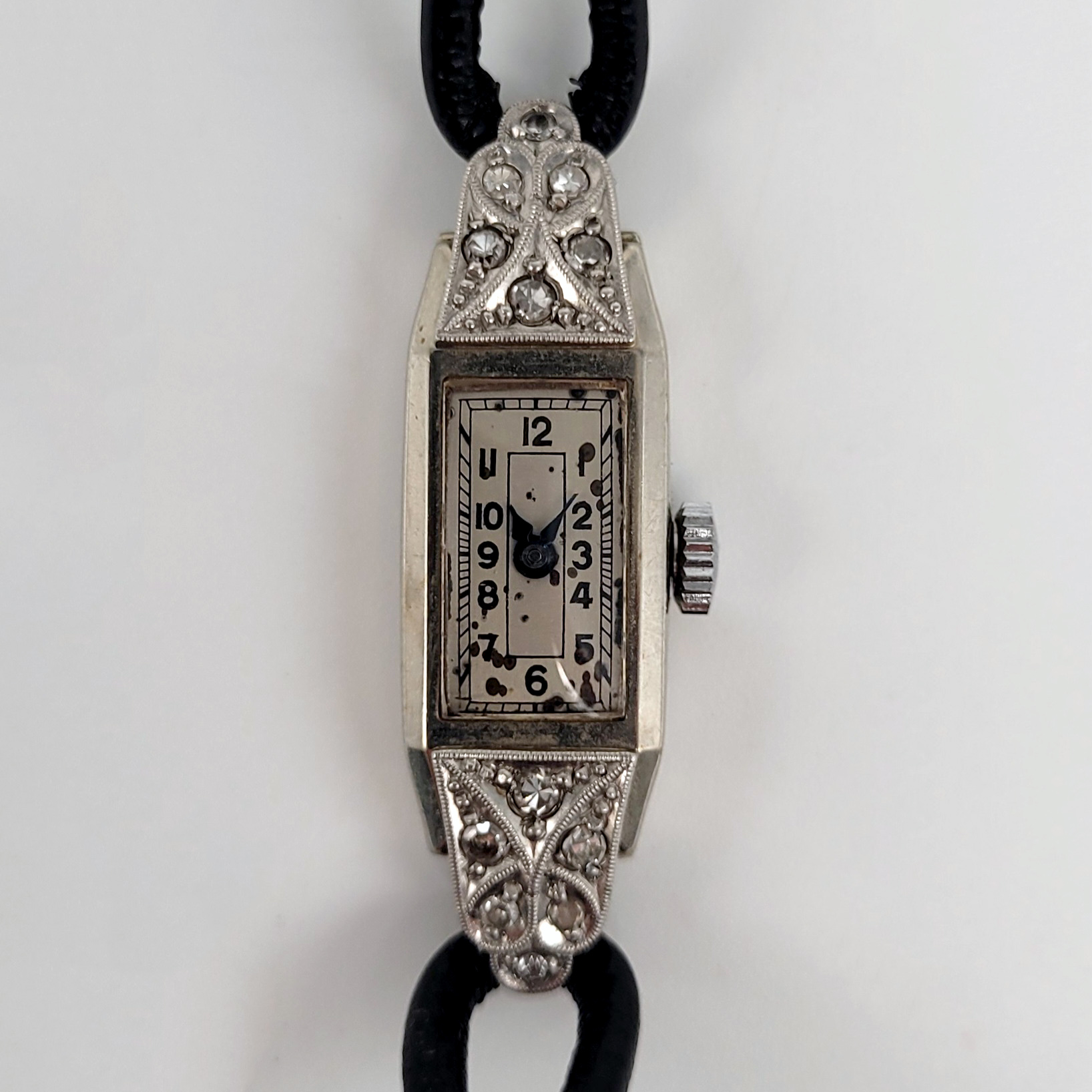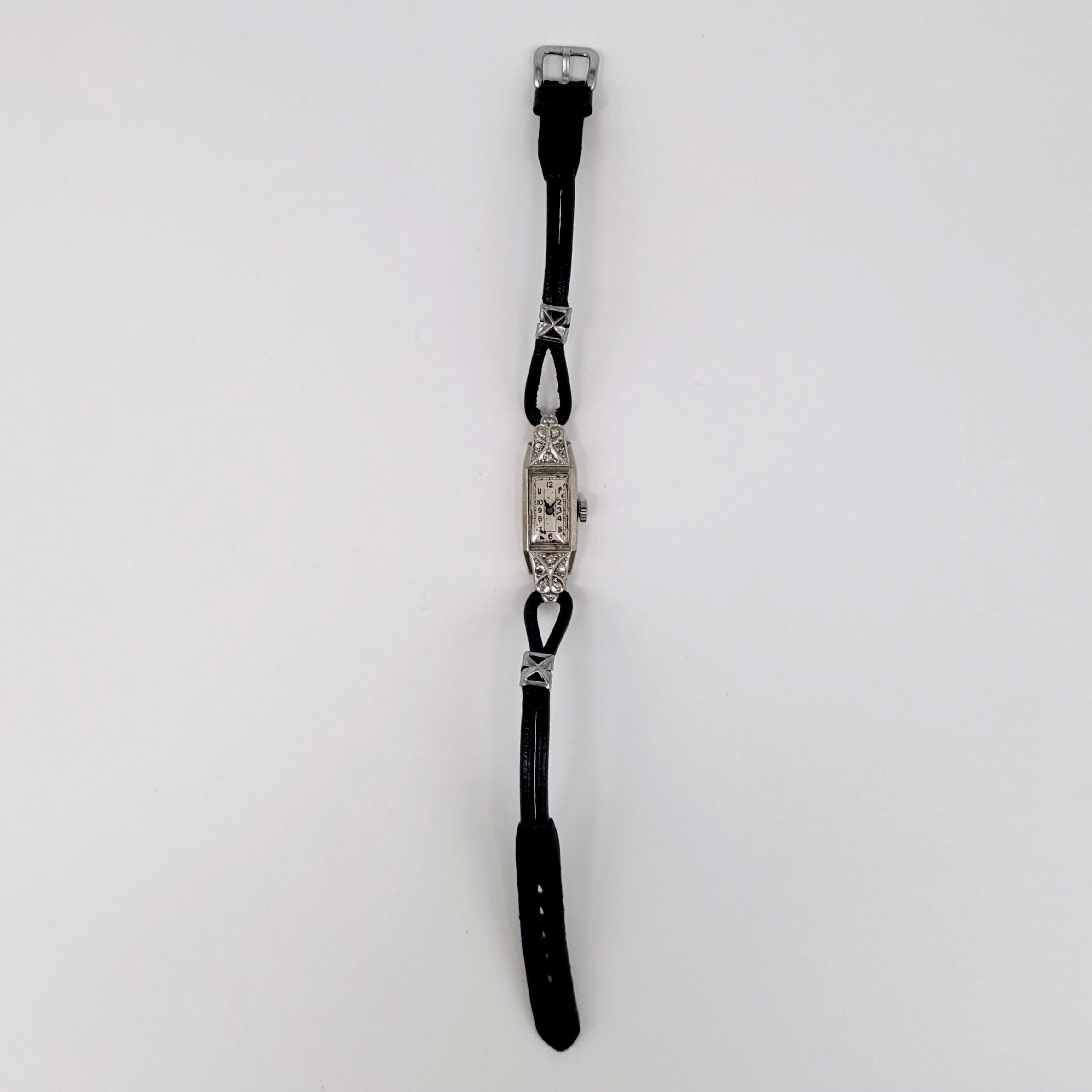 Damenarmbanduhr585er Weißgold, Besatz von 12 kleinen Diamanten, Zifferblatt mit arabischer Stundenanzeige und Minutenbalken, Handaufzug, Lederband, um 1930, Gehäuse 3,5 x 1 cm, Gewicht 9g (Uhrwerk läuft an)