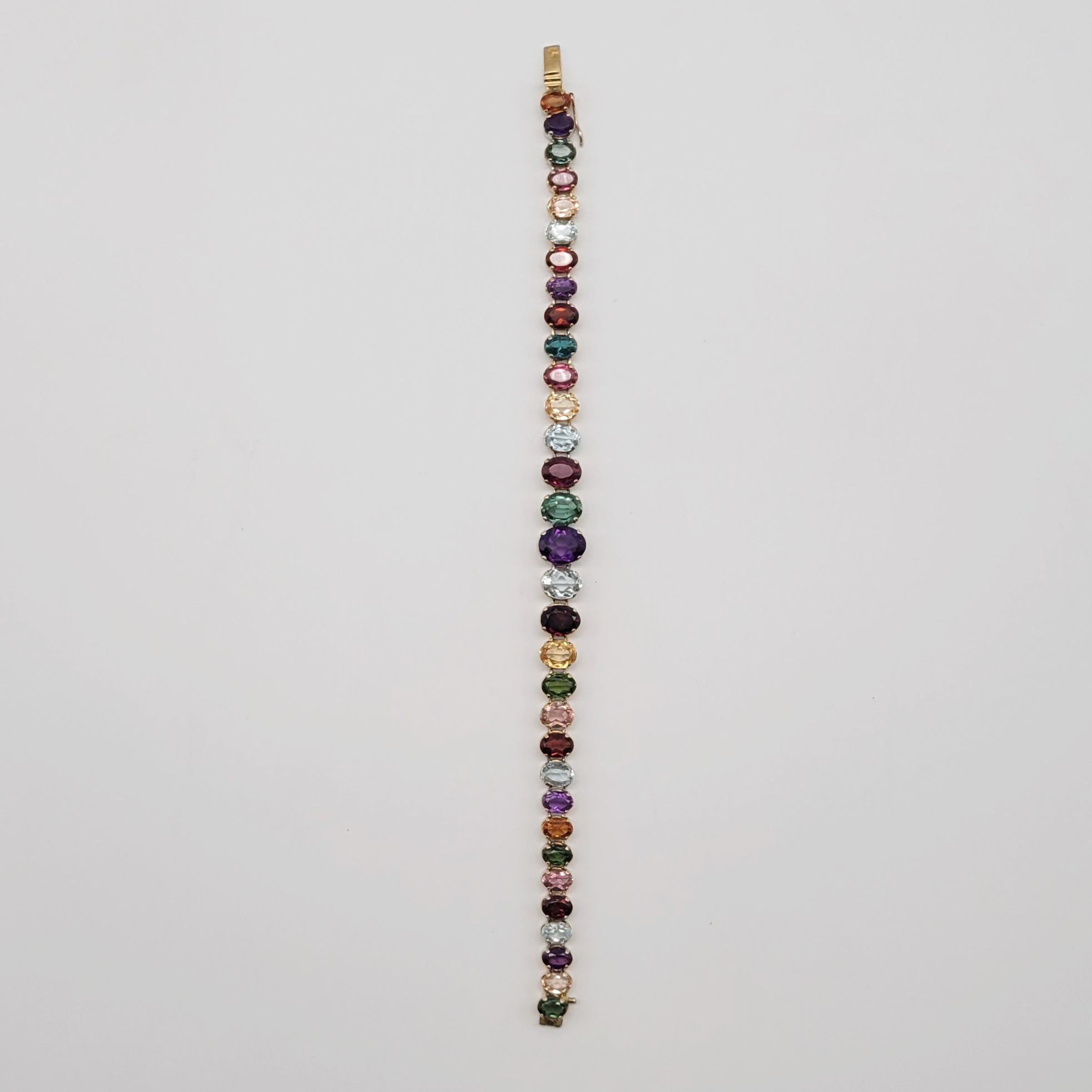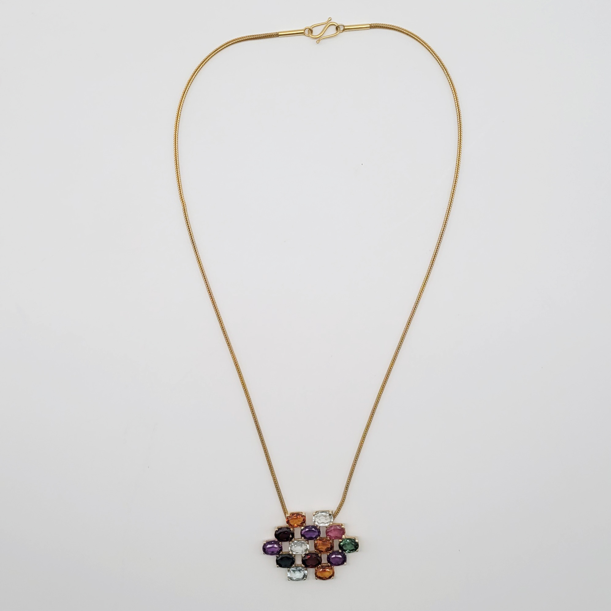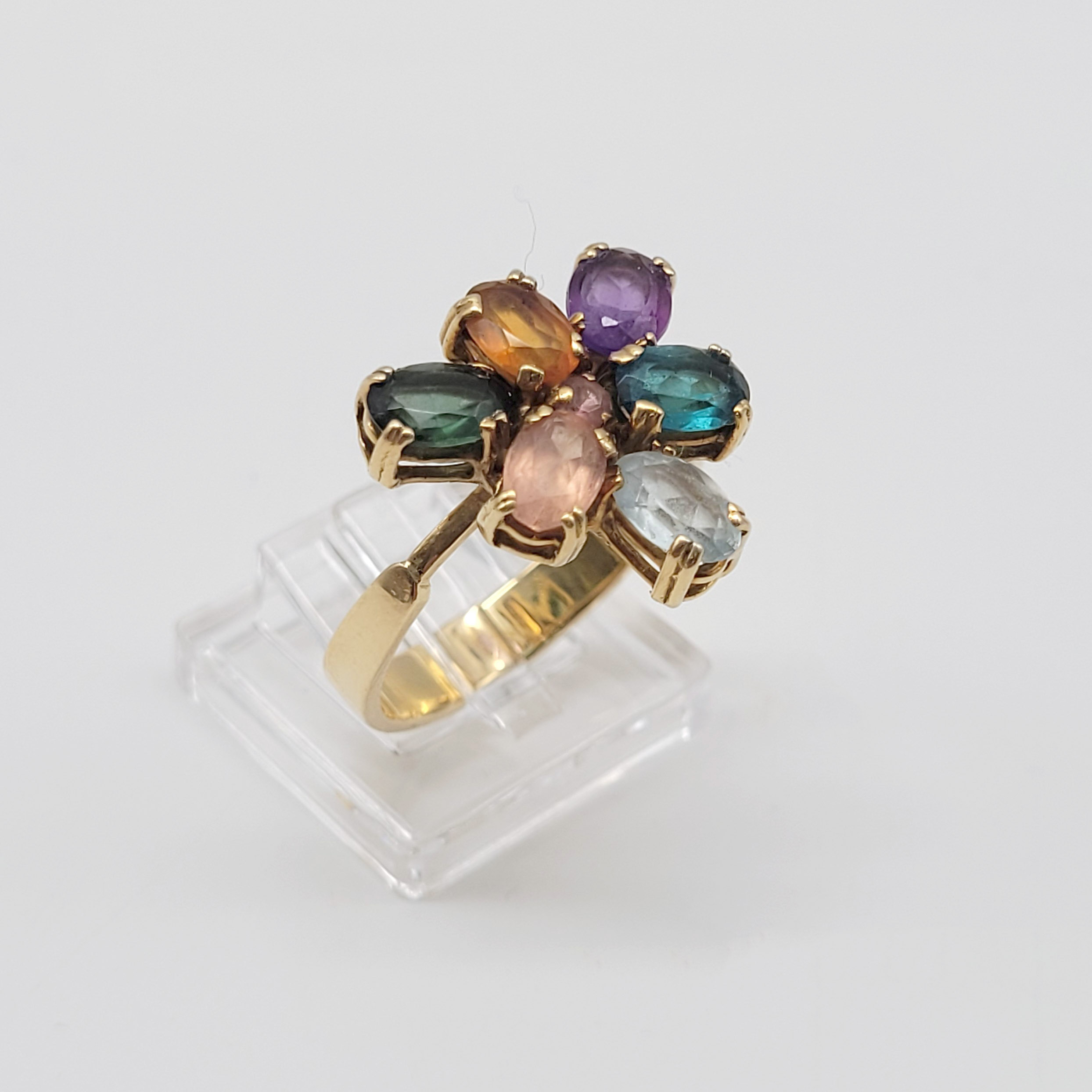 750er Gelbgold, Besatz aus Turmalin, Aquamarin, Amethyst, Granat, Citrin etc., Kette mit Hakenschloss, Armband mit Kastenschloss mit Sicherheitsbügel, Länge Kette 24 (48) cm, Anhänger 3 x 4 cm, Länge Armband 19 cm, Ringgröße 62, Gewicht ca. 45g