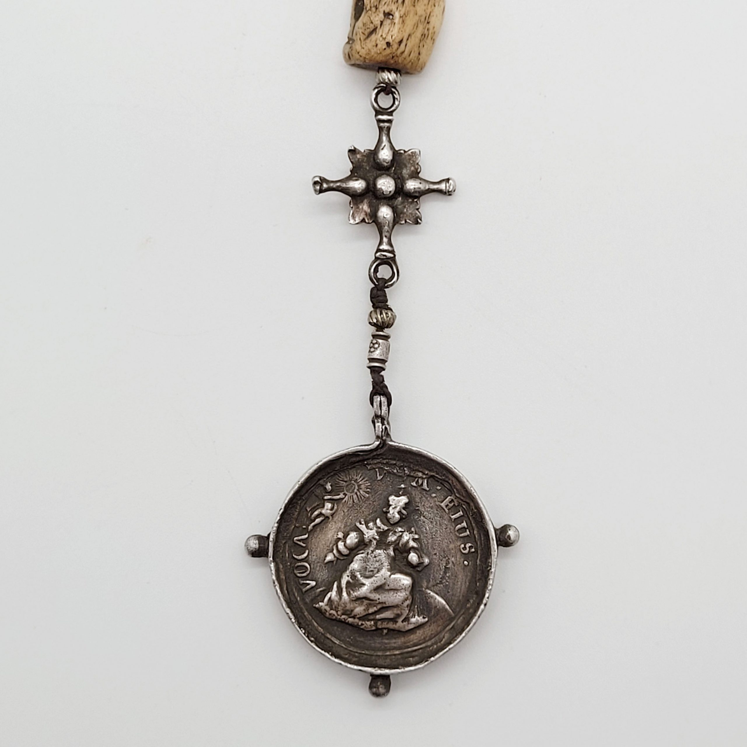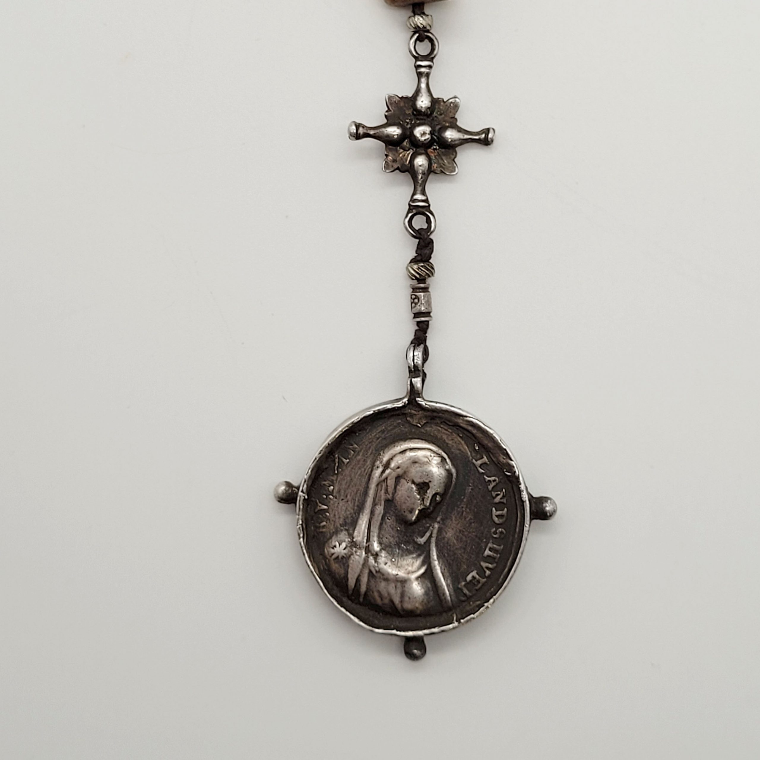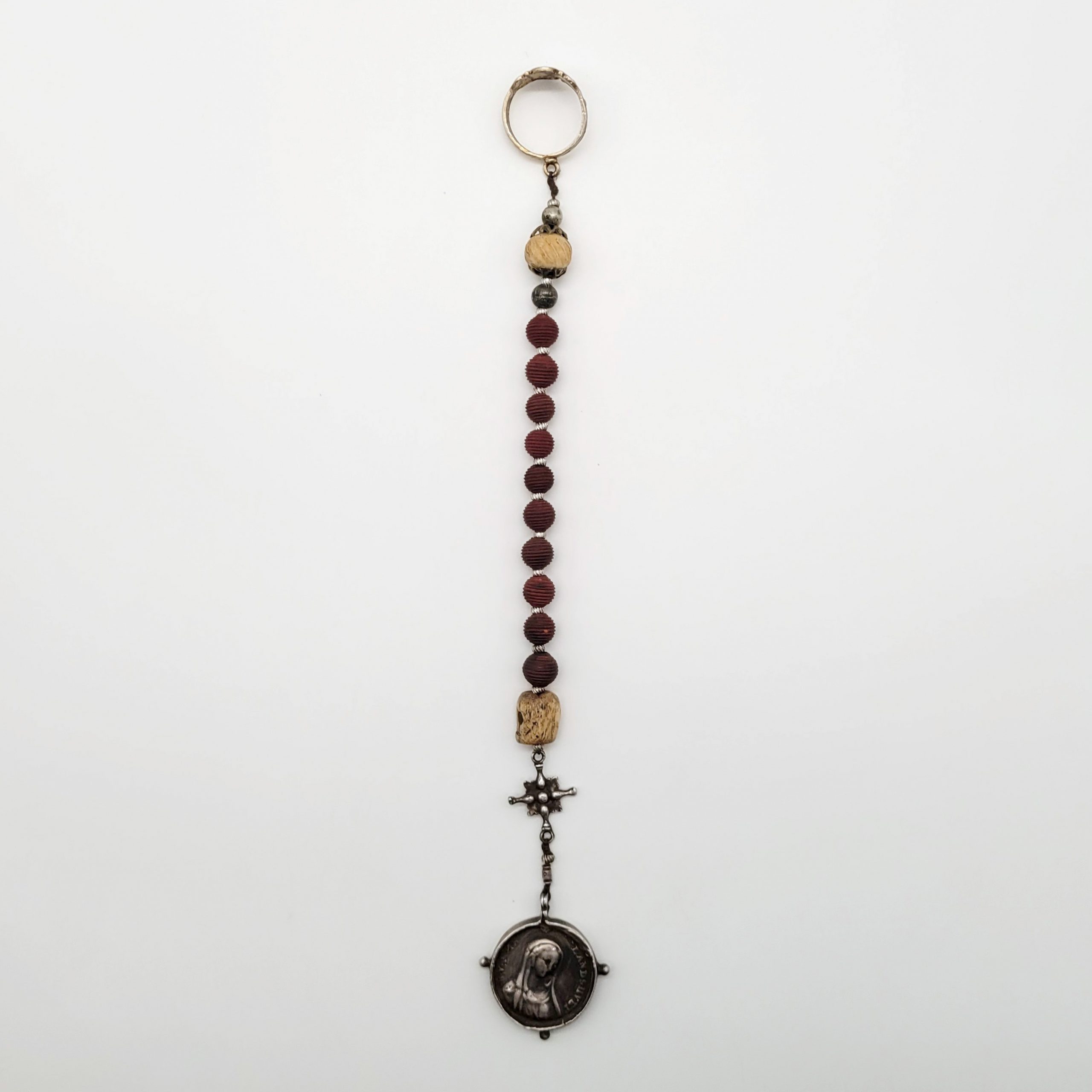Fingerrosenkranz (Faulenzer)Fingerring, Kreuz, Zwischenglieder und Anhänger aus Silber, Ring, Reste von Vergoldung, Paternosterperle und Totenkopf aus Bein, 10 Ave-Perlen aus Holz, Niederbayern 18./19. Jahrhundert, Länge 25 cm