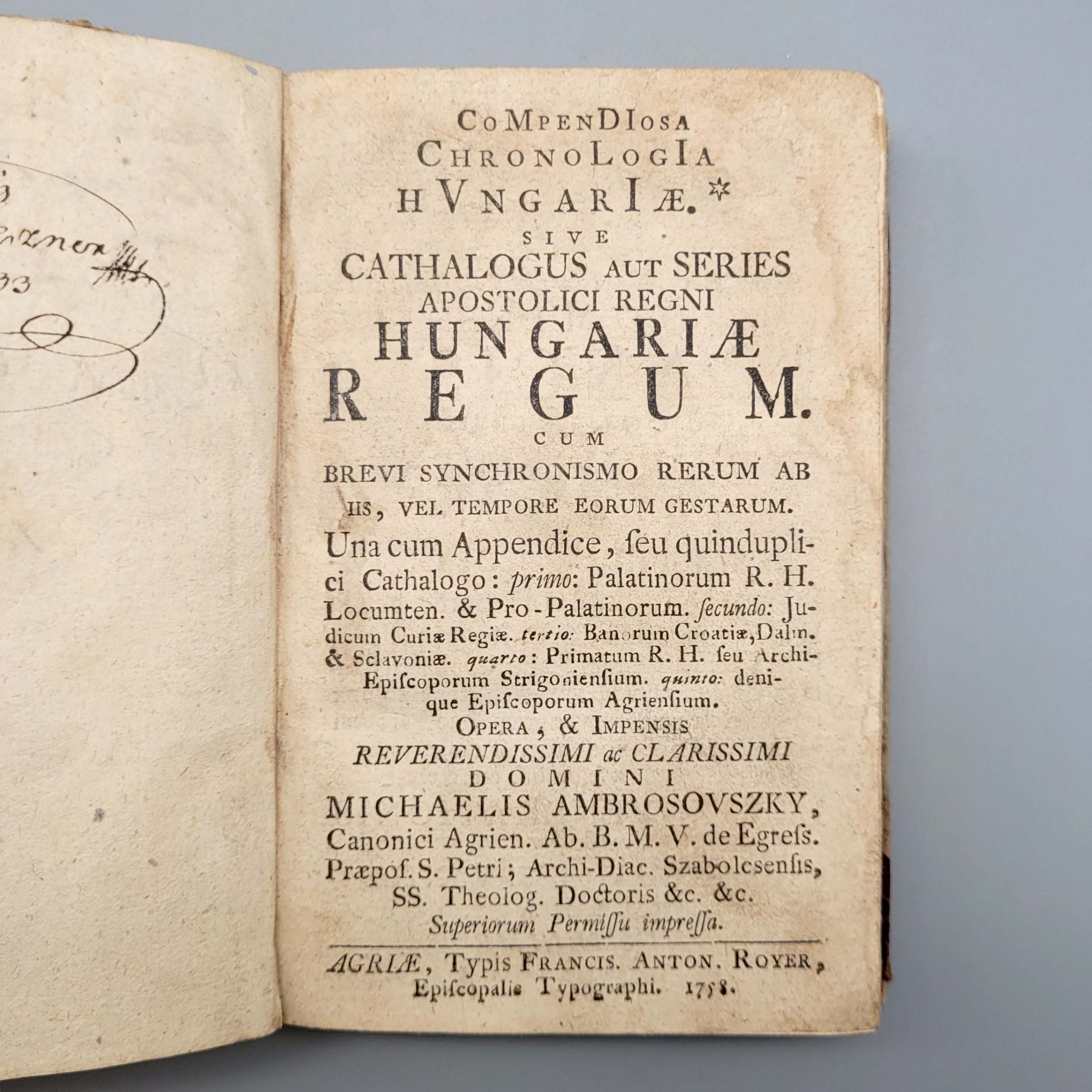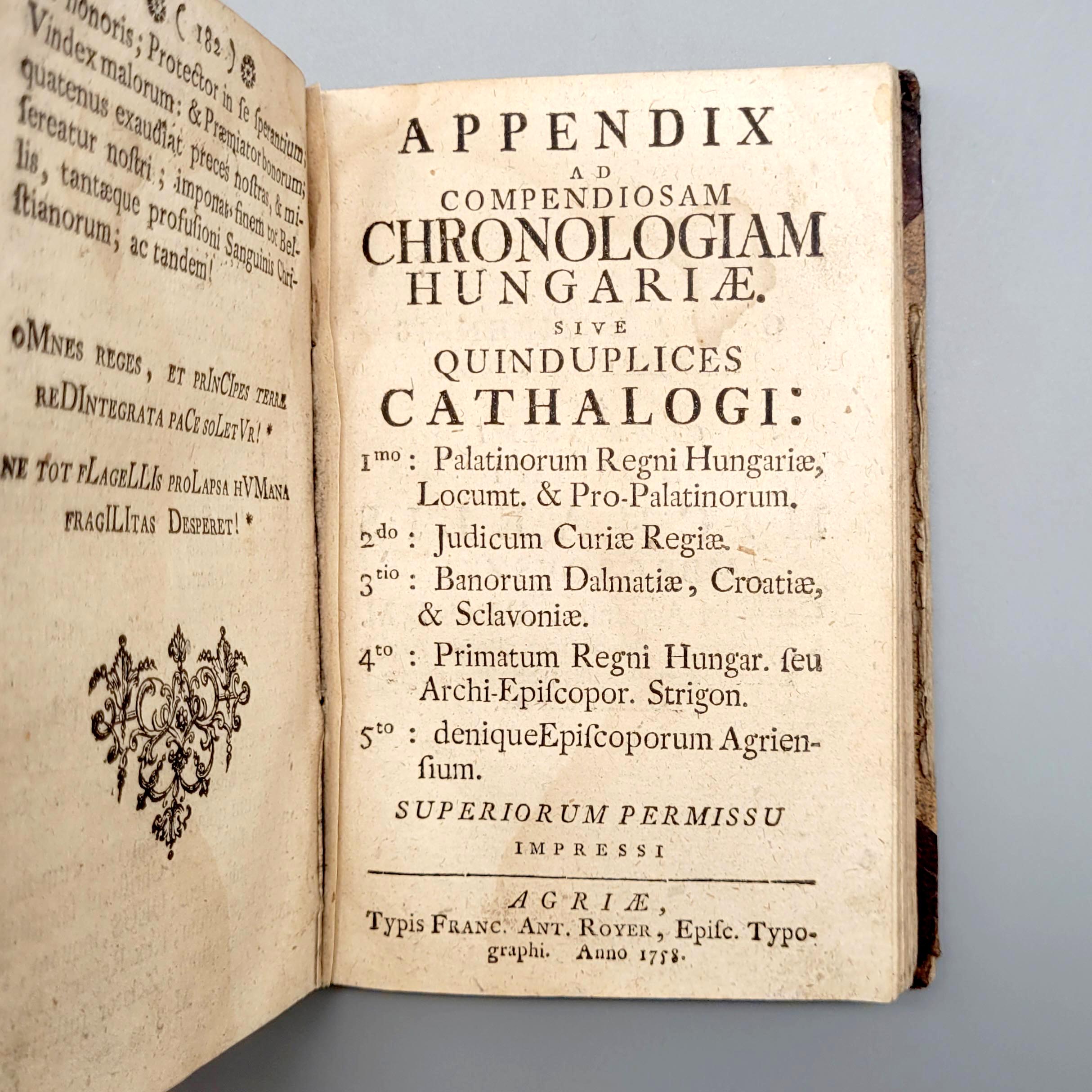 Eger (Franz Anton Royer) 1758 (mit dem zughörigen Appendix „Ad compendiosam chronologiam Hungariae sive quinduplices cathalogi“, Eger 1758 [Halbledereinband der Zeit])