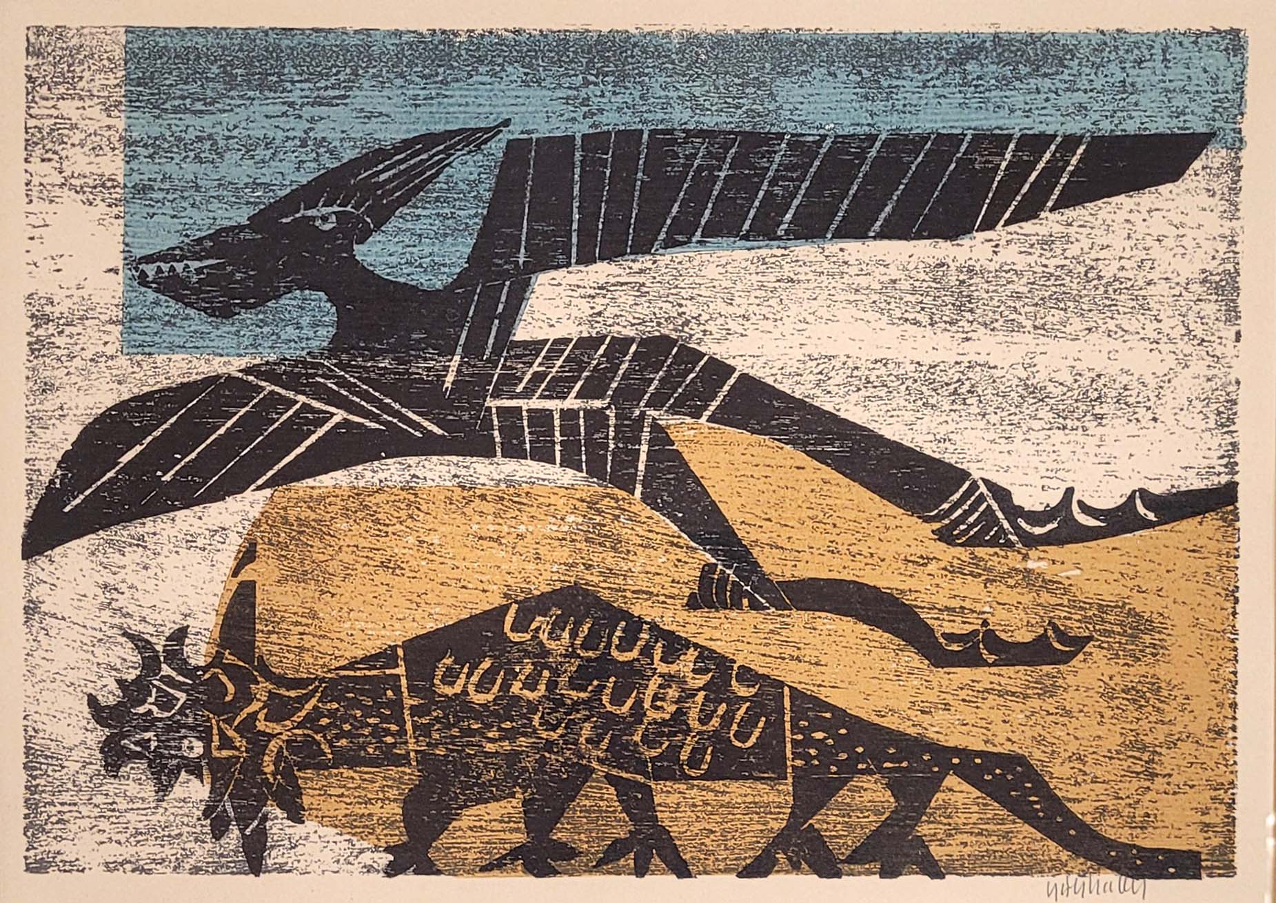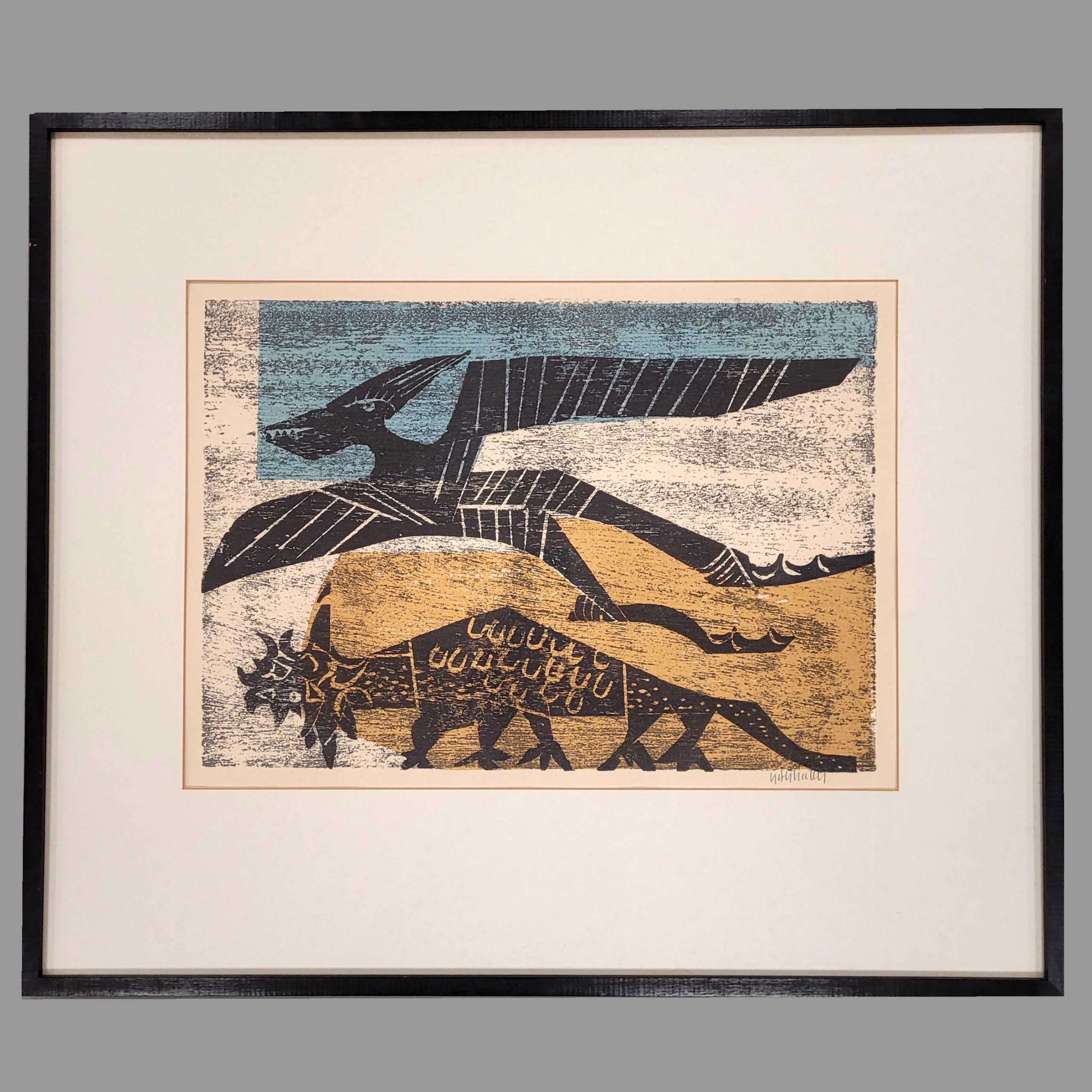 GRIESHABER, HAP (1909-1981): FlugsaurierFarbholzschnitt, 1972, signiert unten rechts, 31 x 43,5 cm, gerahmt unter Glas und Passepartout**) Bei einem Zuschlag über 400€ werden 2% für VG Bild gemäß §26 UrHG erhoben