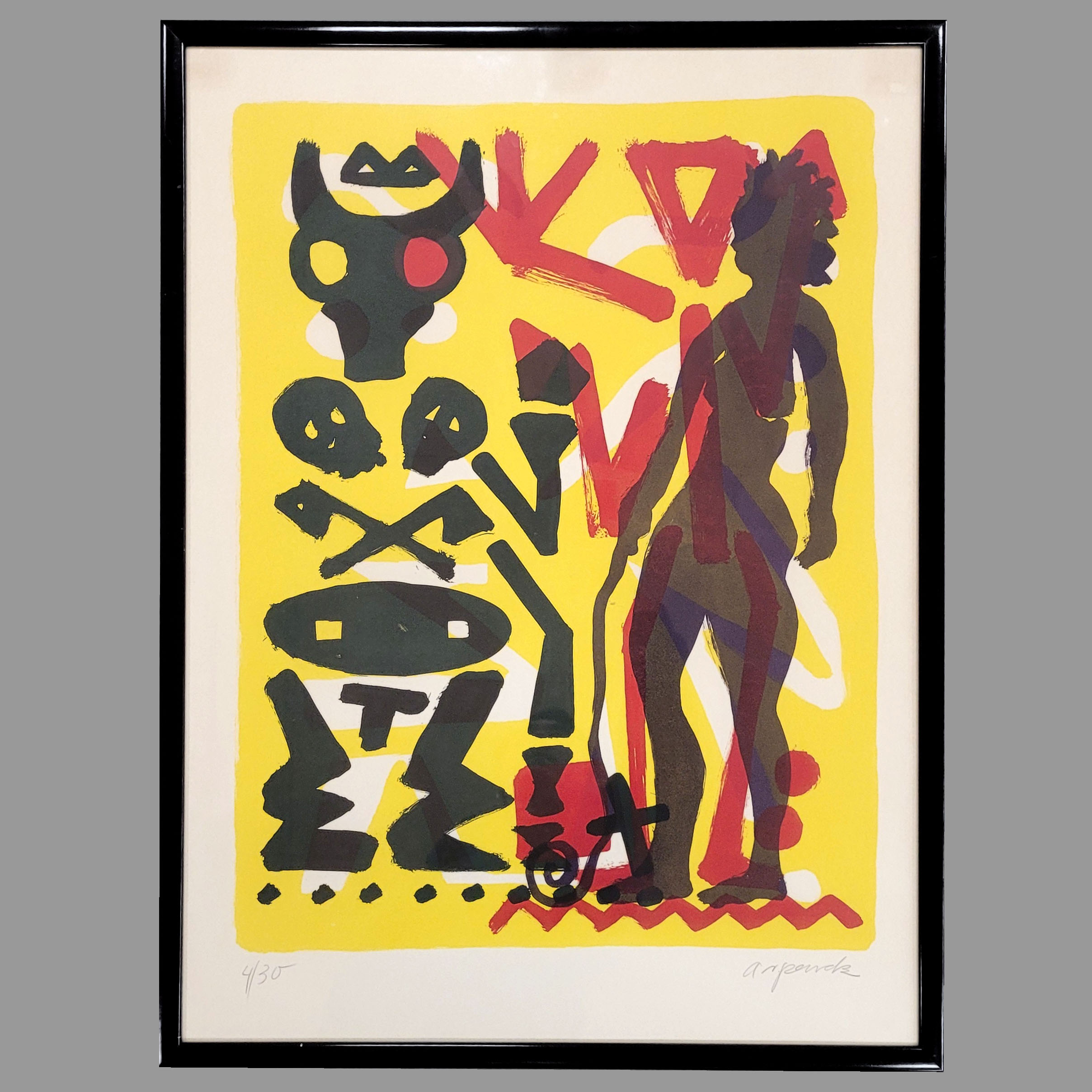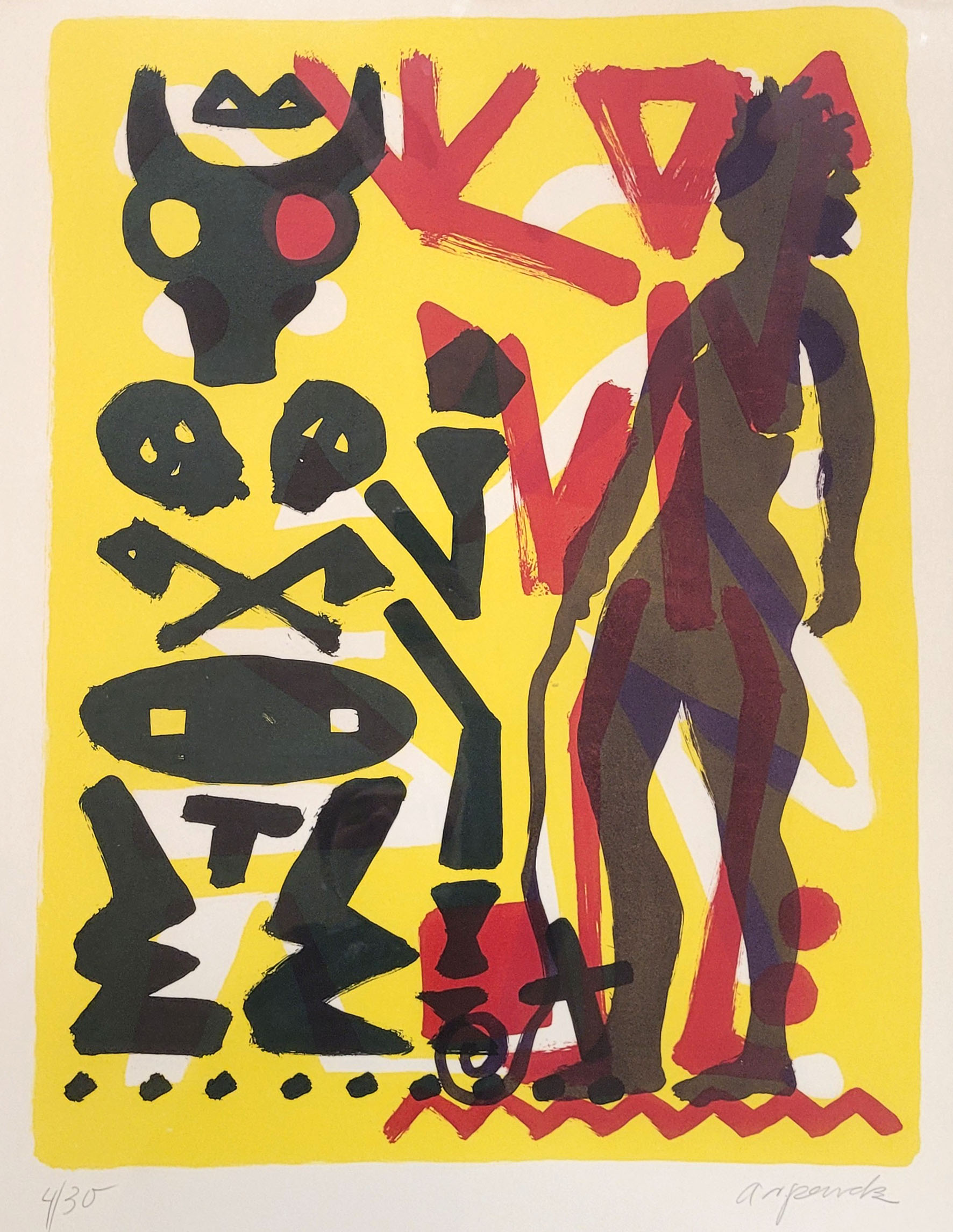 PENCK, A.R. (1939-2017): Ohne TitelFarblithographie, signiert unten rechts, nummeriert 4/30 unten links, 78 x 58 cm, gerahmt unter Glas**) Bei einem Zuschlag über 400€ werden 2% für VG Bild gemäß §26 UrHG erhoben