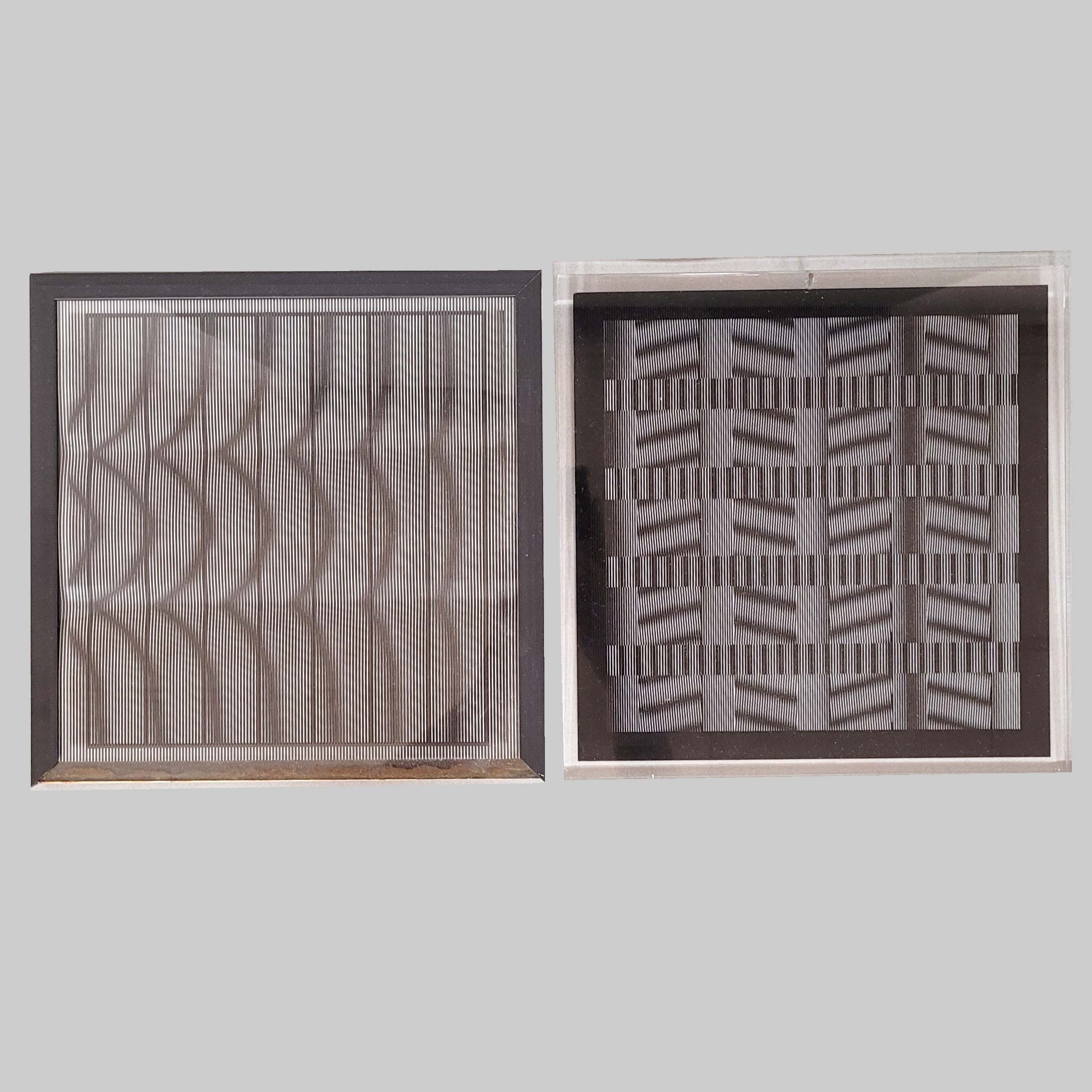 2x Serigraphie auf Plexiglas vor Serigraphie auf Karton, verso signiert, datiert 1980 und nummeriert 19/50 (1x), 28,5 x 28,5 cm (eine Rahmenleiste fehlt) bzw. 28 x 28 cm (am Nagel für die Aufhängung beschädigt)