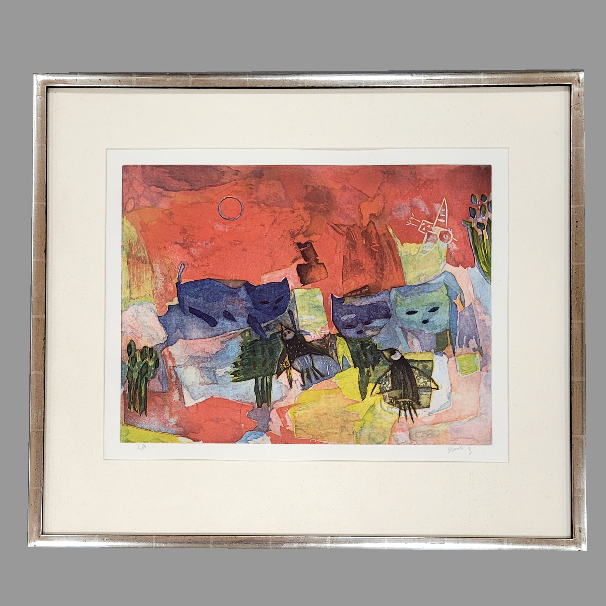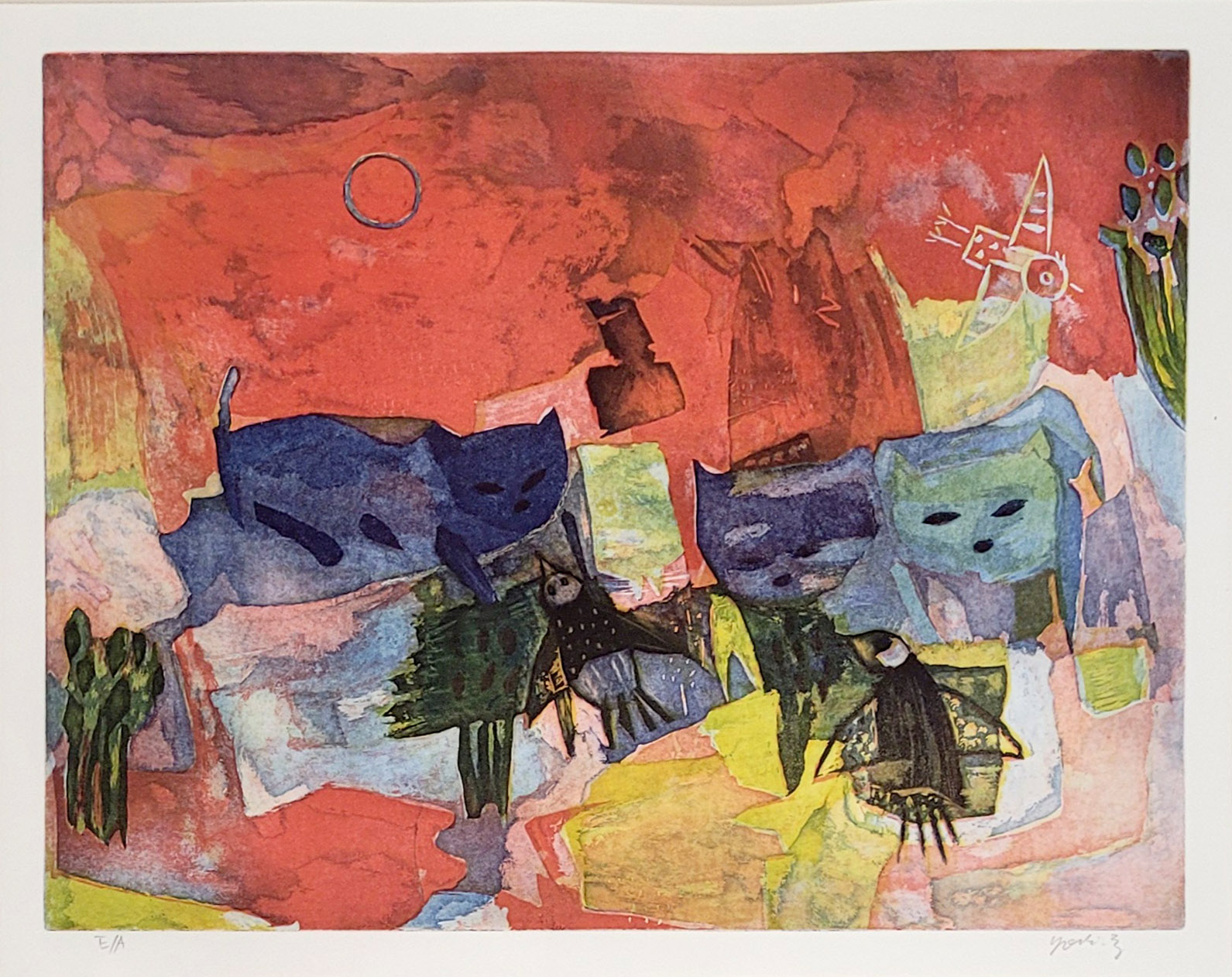 TAKAHASHI, Yoshi (1943-1998): Katzen und Vögel im AbendrotFarbradierung, signiert unten rechts, bezeichnet „EA“ unten links, 41,5 x 53,5 cm, gerahmt unter Glas und Passepartout