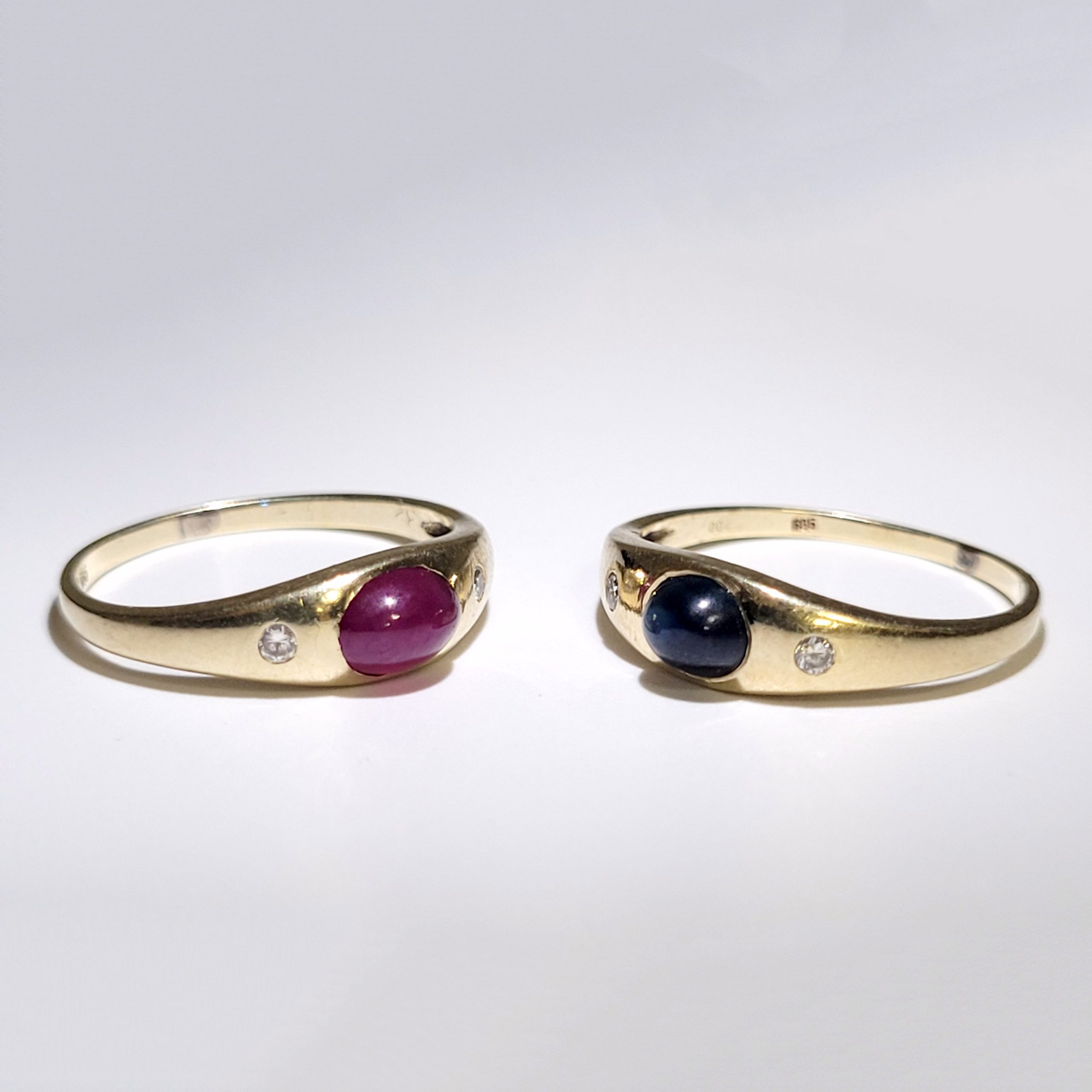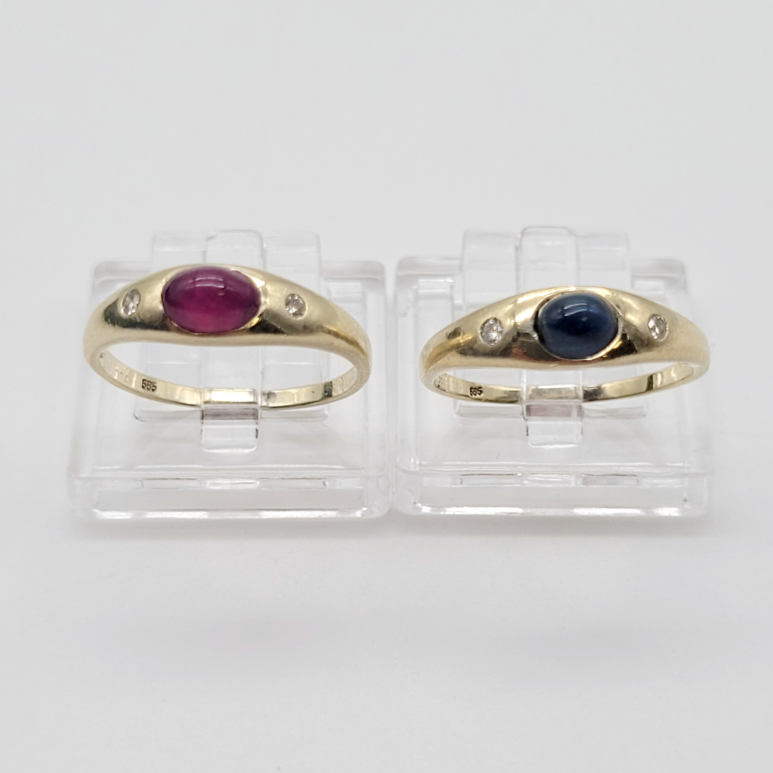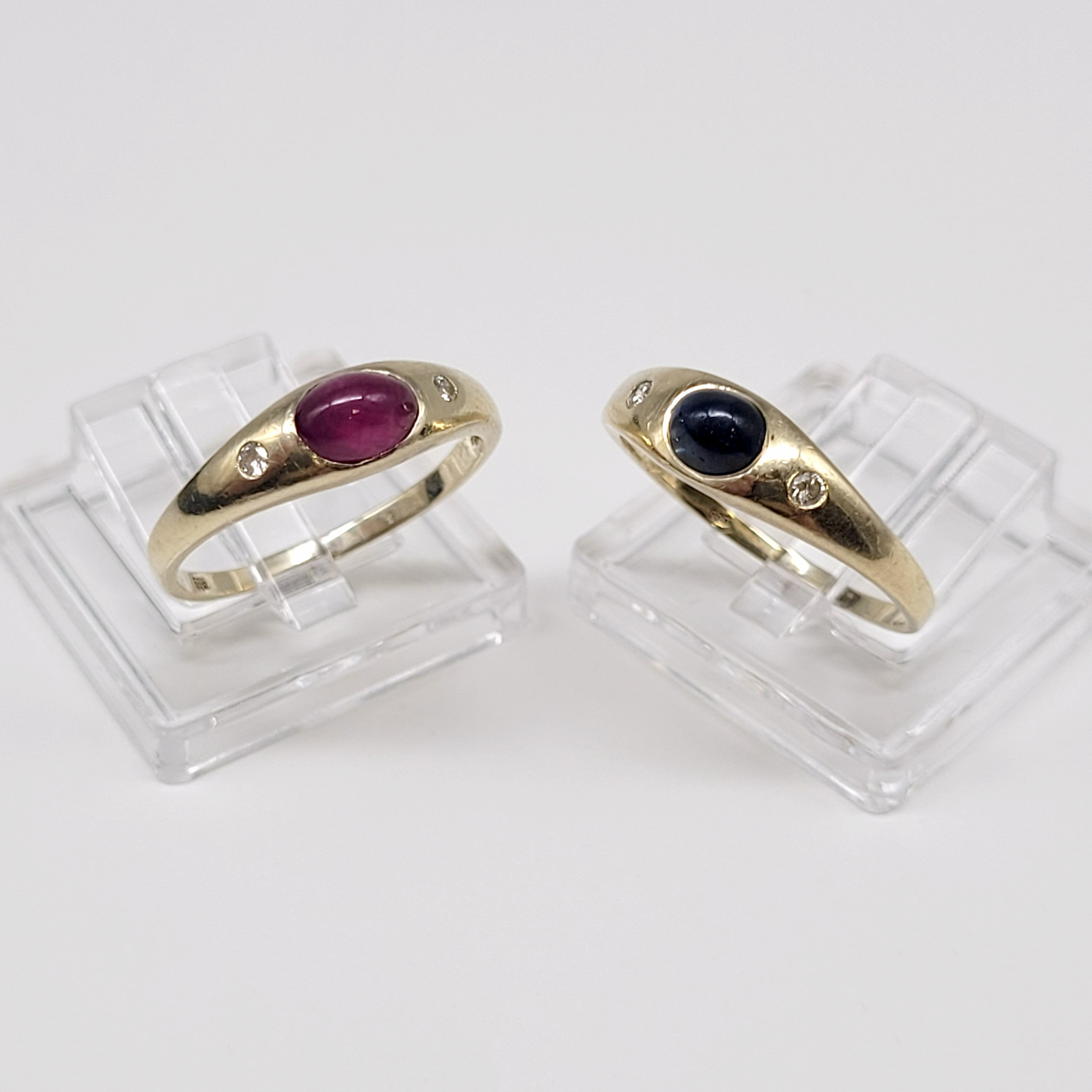 Zwei Damenringe585er Gelbgold, Saphir- und Rubincabochon, je flankiert von 2 Brillanten (je Ring 0,04 ct), Ringgröße 50, Gewicht zusammen ca. 3,5g