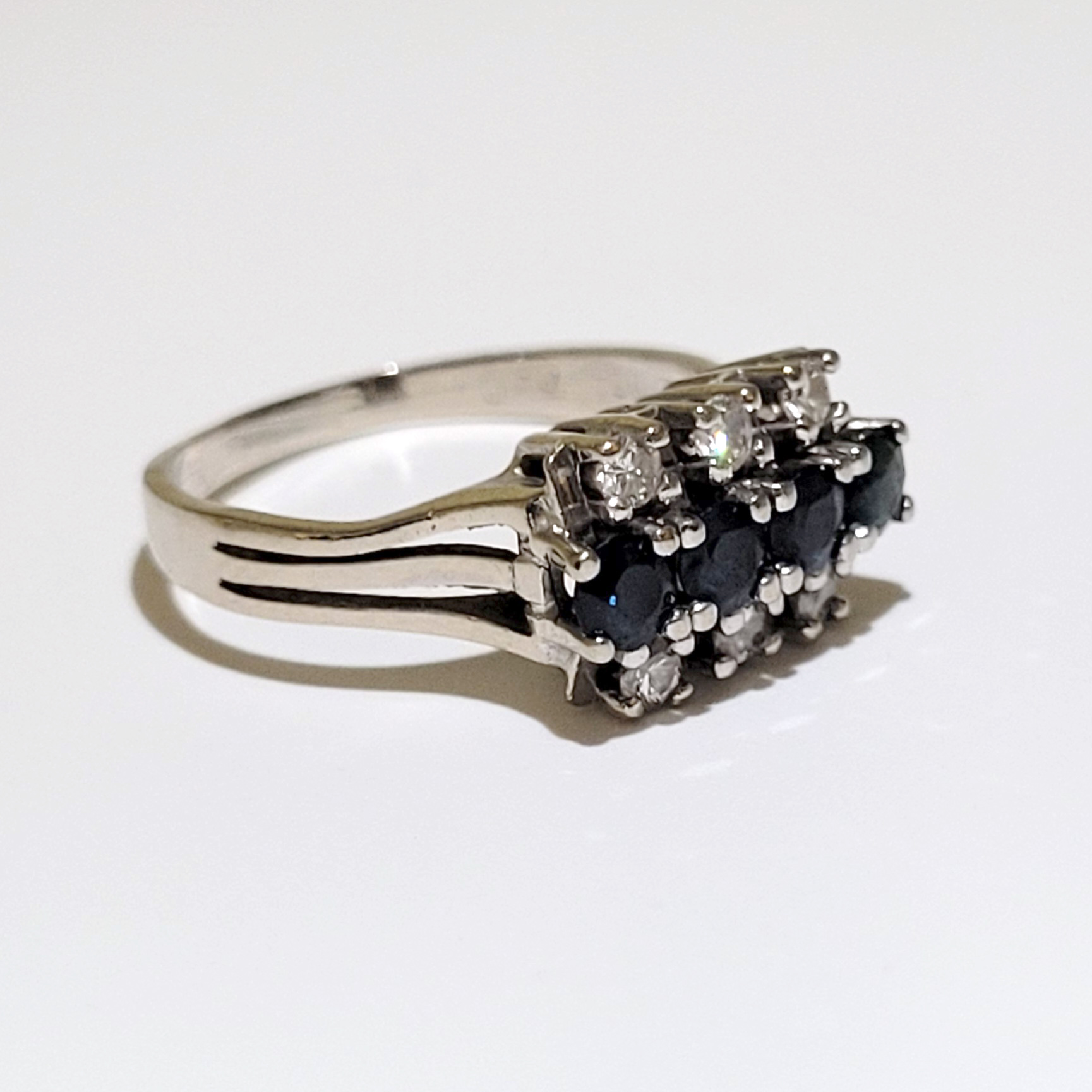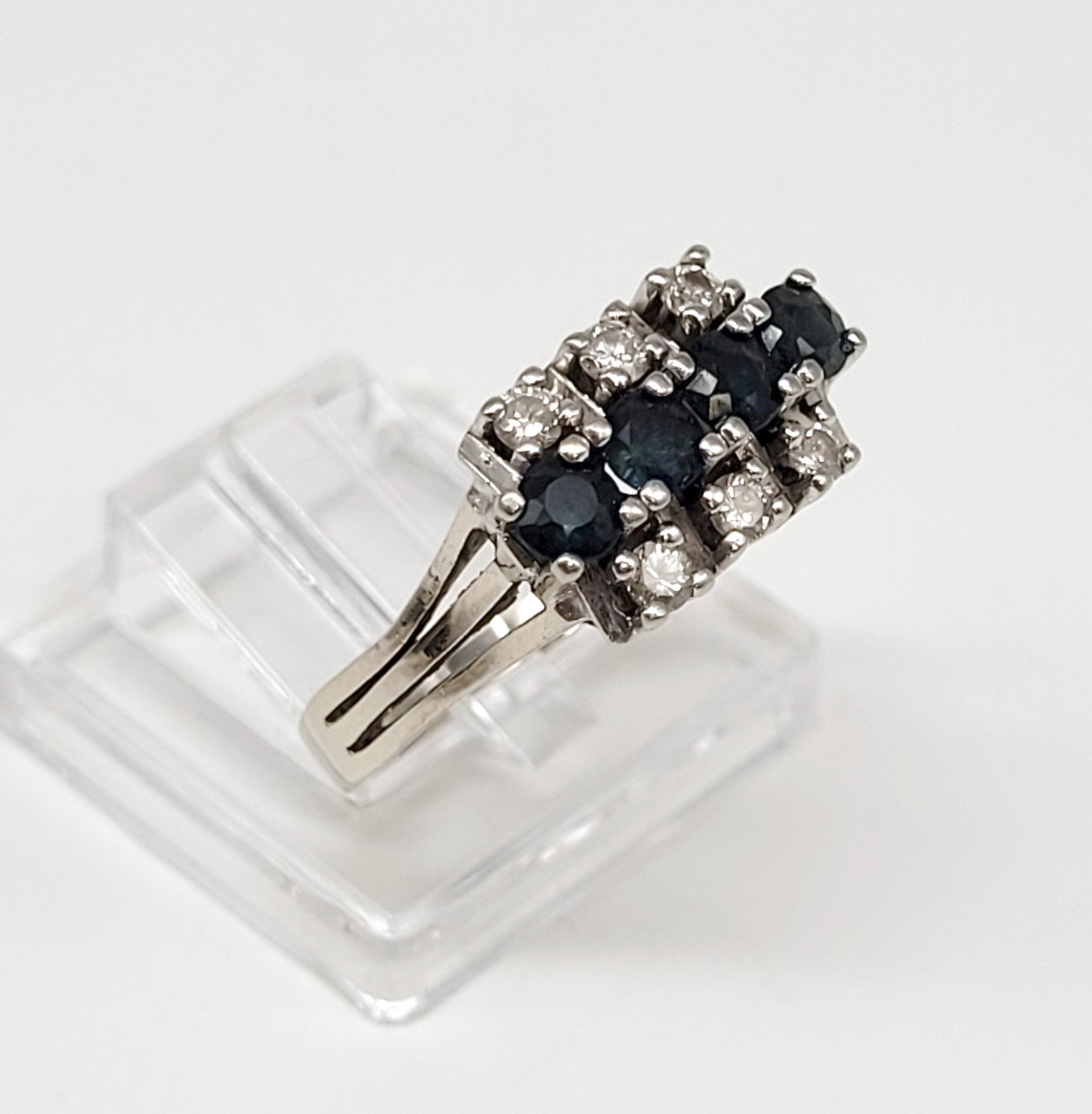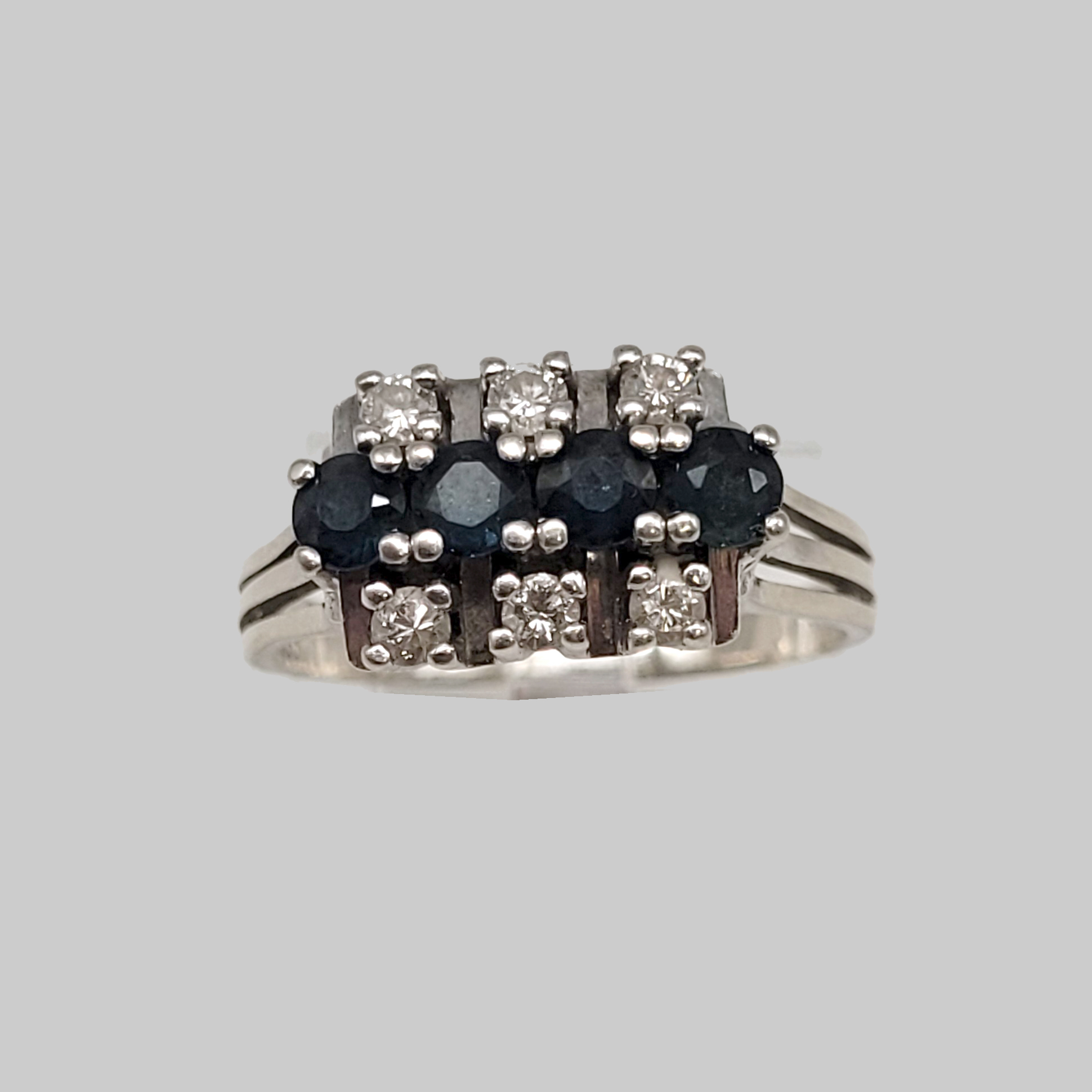 Damenring585er Weißgold, 4 Saphire und 6 Brillanten (ca. 0,12 ct), Ringgröße 53-54, Gewicht ca. 3,5g (Schiene leicht verbogen)