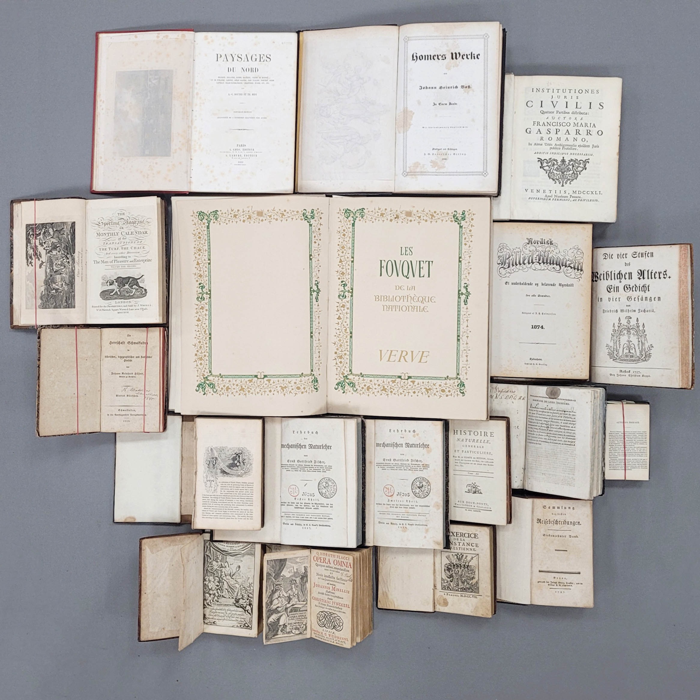 darunter: L’exercice de la Constance Chrestienne, Prag 1704 LUIKEN, Johannes, Des Menschen Begin, Midden en Einde, Amsterdam (Houttuyn) 1782 Q. Horatii Flacci opera omnia, Leipzig (Weidmann) 1721 ZACHARIAS, Friedrich Wilhelm, Die vier Stufen des weiblichen Alters / Murmer in der Hölle, Rostock (Koppe) 1757 (es fehlen vier Kupfer), mehr als 15 Bücher