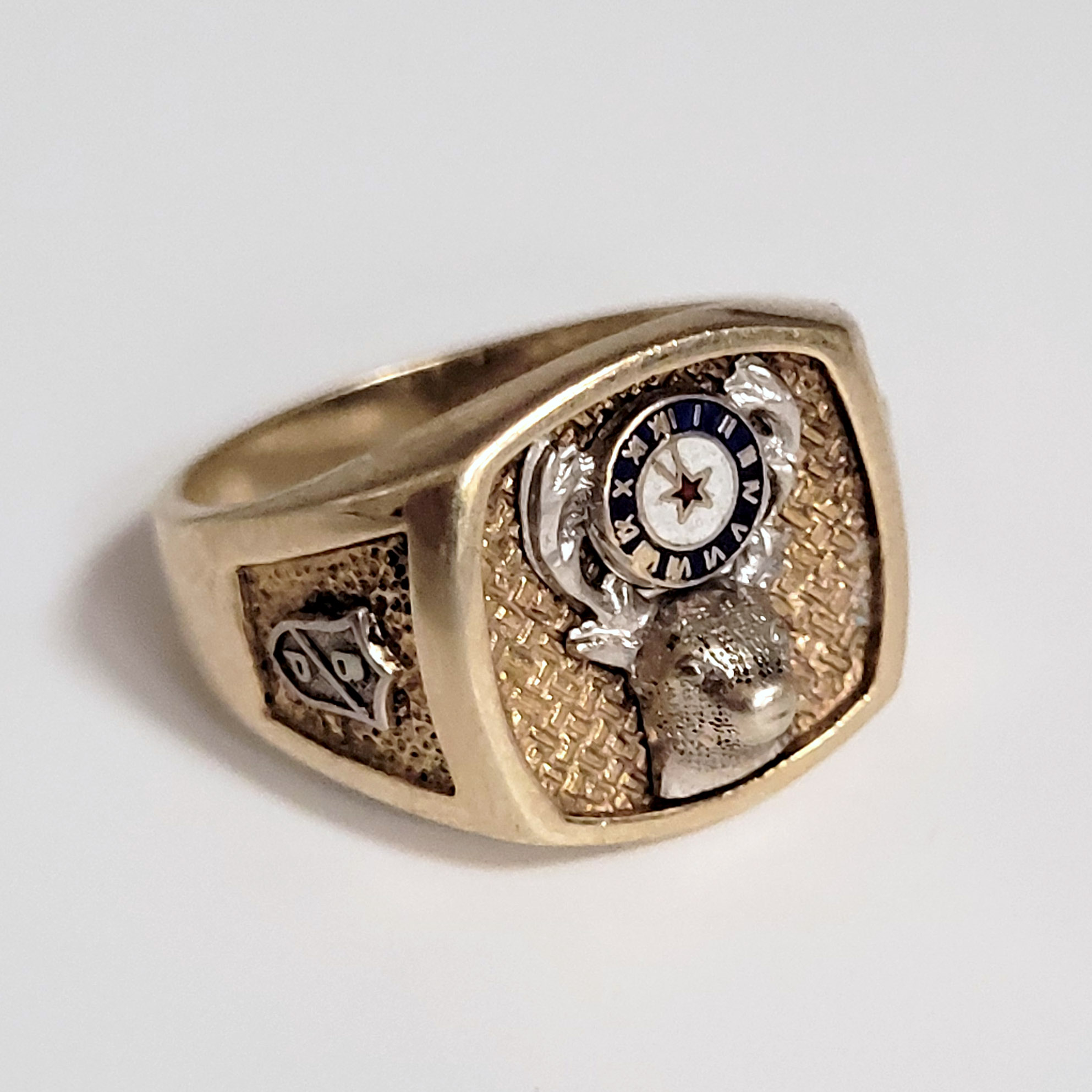 Herrenring417er Gelb- und Weißgold, Email, Ringkopf mit Hirschkopf mit Uhr im Geweih, Ringgröße 61, Gewicht 7g